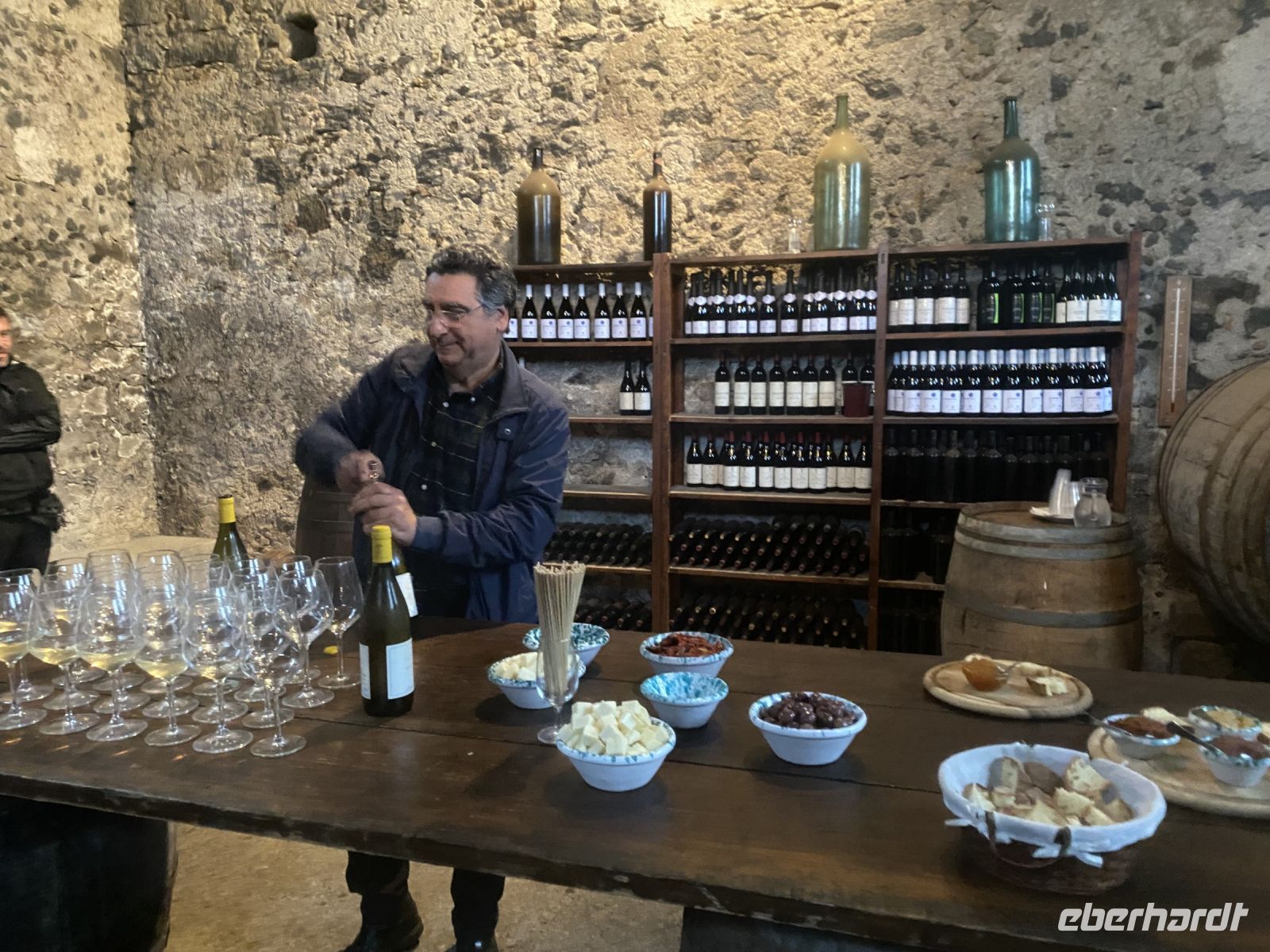 Unten am Fusse des Vulkans angekommen, regnete es wieder gefühlt ohne Unterlass und wir freuten uns auf unseren nächsten Halt, ein wunderschön gelegenes Weingut, wo wir mit demgleichen in weiss, rose und rot bereits empfangen wurden. Und es tat gut. Wir standen im Trocknen und die wunderbaren zum Wein gereichten Antipasti gaben uns Kraft. Das war nun genau das, was wir brauchten. Nun waren wir bereit für „mehr Bewegung“ und Camillo kündigte uns dafür nun die Alcantara Schlucht an.