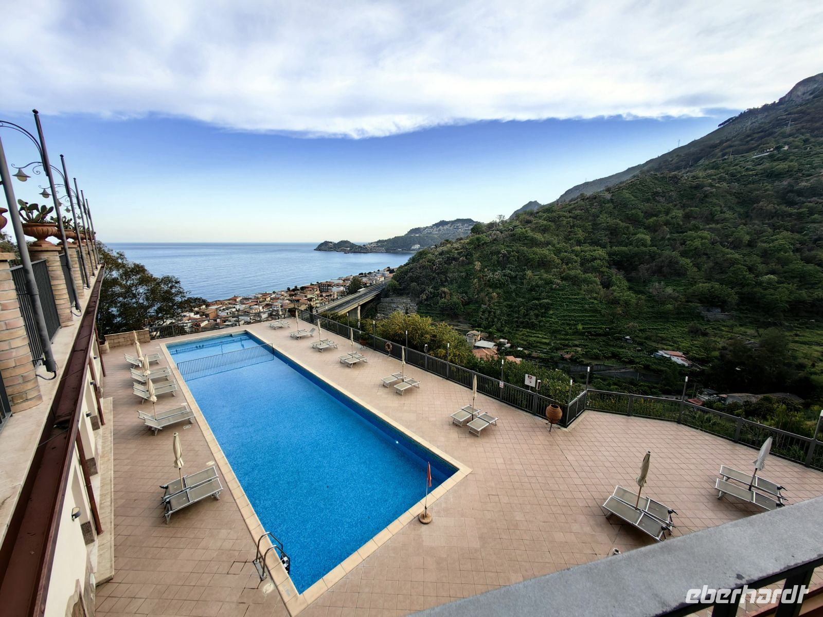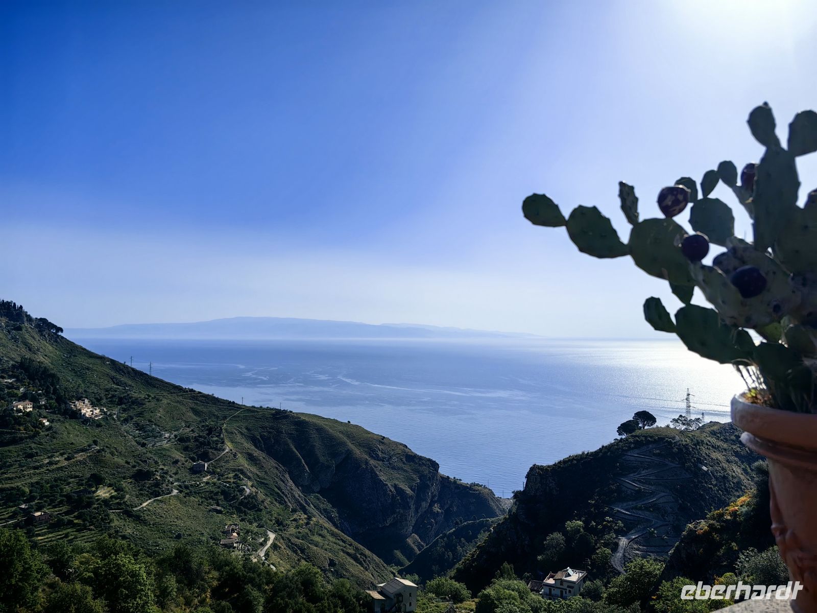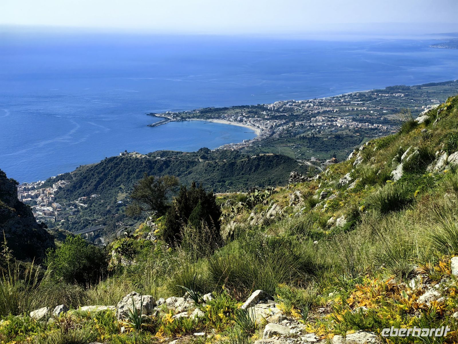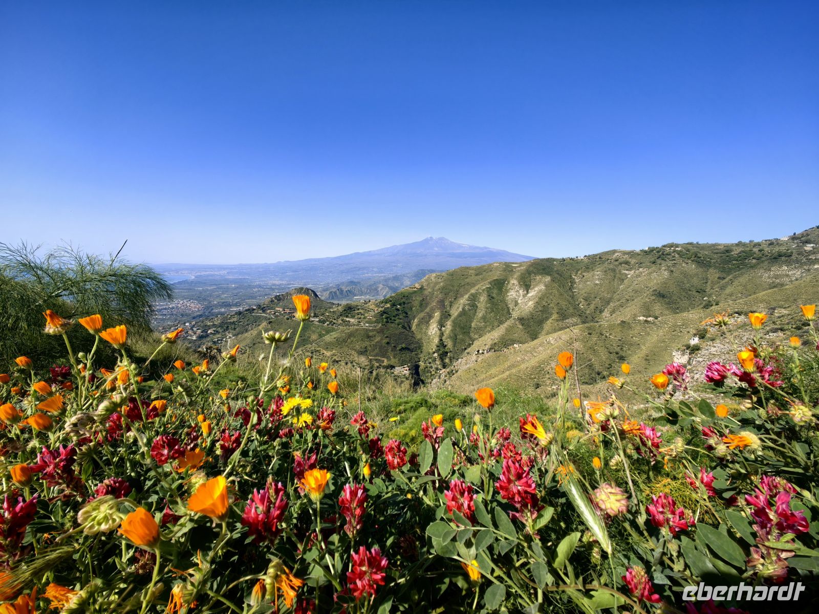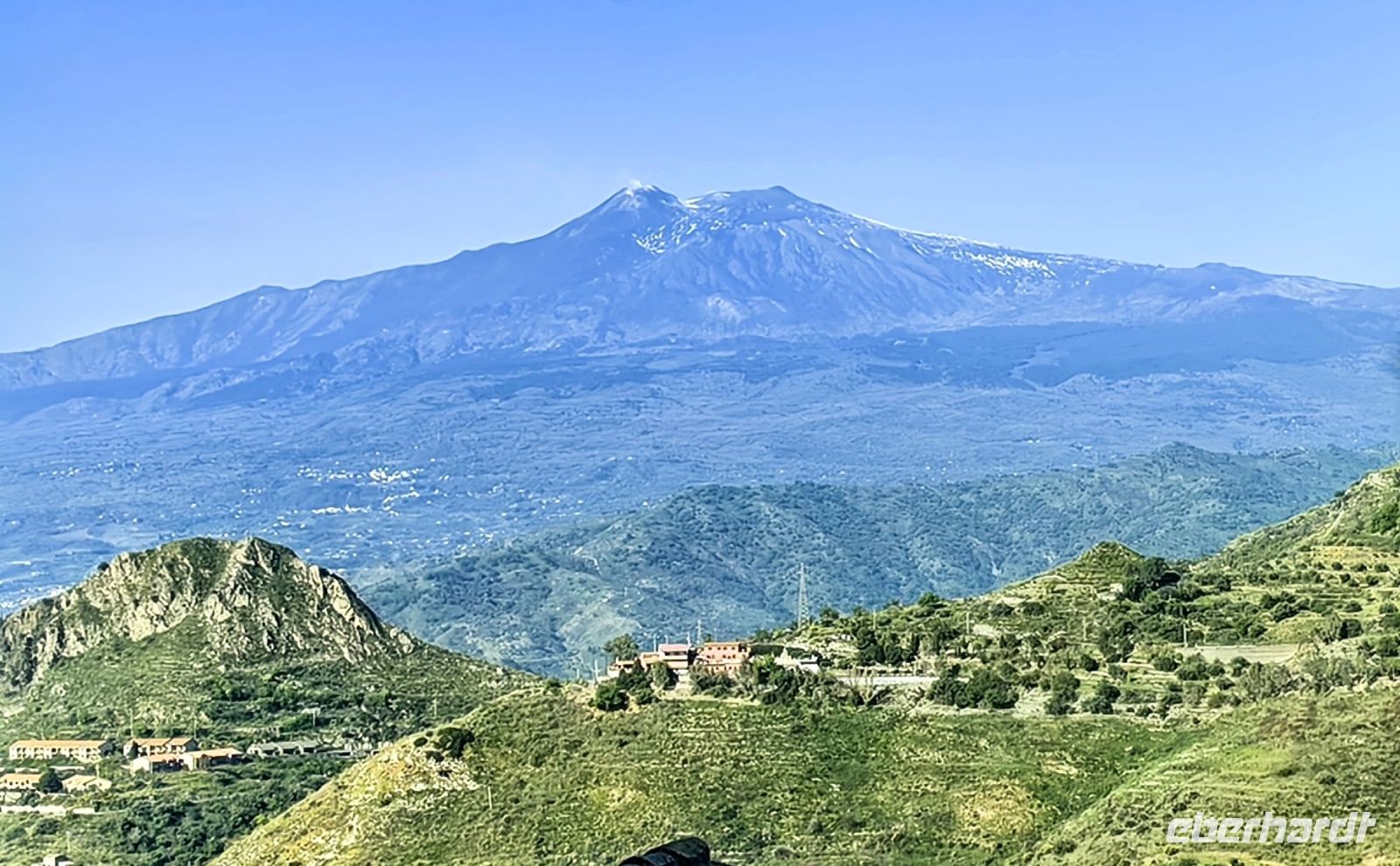 Während des Frühstücks genießen wir den bezaubernden Ausblick auf die Küstenlinie und den Strand von Letojanni, bevor wir zu unserer ersten Wanderung rund um Castelmola aufbrechen. Wir befinden uns in lichter Höhe, umgeben von Oliven- und Feigenbäumen, Ringelblumen, wildem Fenchel, duftendem Bergthymian und Lorbeerbäumen. Auf unserem steilen Weg zum Gipfel erhaschen wir immer wieder traumhafte Aussichten auf den alles überragenden Ätna, der sich heute konturenreich vom azurblauen Himmel abhebt. Die letzten 800 Meter unserer anspruchsvollen Wanderung laufen nur noch die ganz mutigen Gäste und genießen von oben nochmals den Panoramablick auf die Umgebung und danach steigen wir gemeinsam wieder hinunter. In Castelmola genehmigen wir uns erstmal einen einheimischen Süßwein, ein kühles Bier oder leckeren Cappuccino, bevor wir nach Taormina fahren. Das haben wir uns redlich verdient.