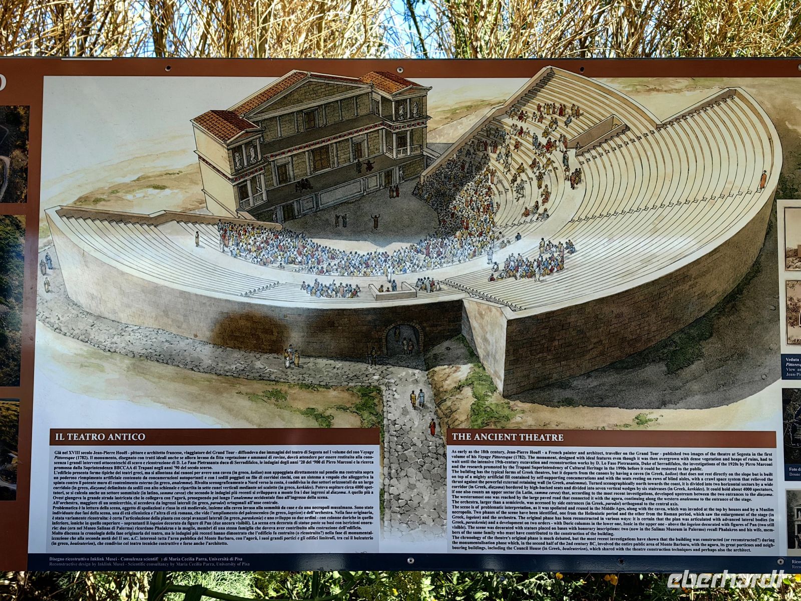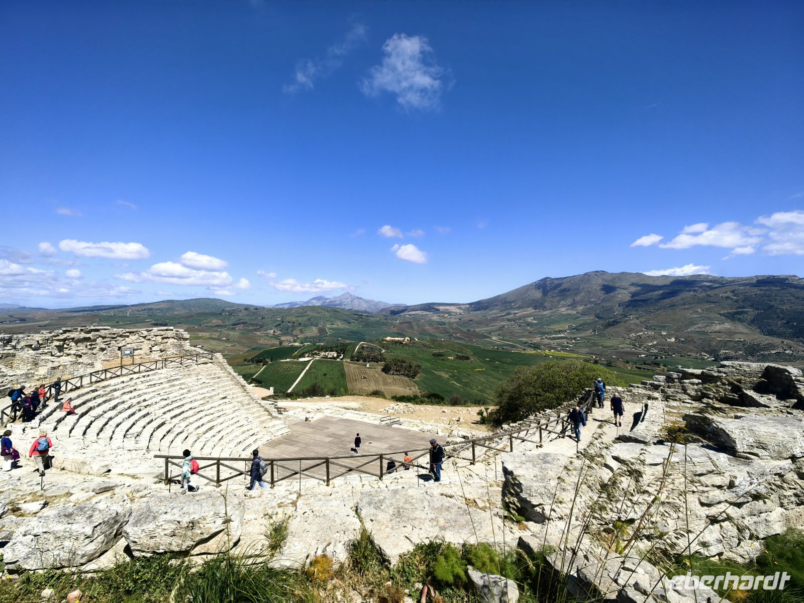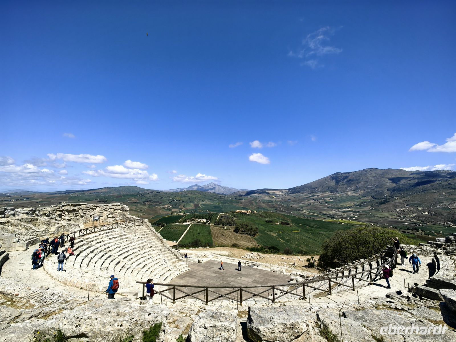 Wir steigen den Hügel weiter hinauf, um das Theater zu besuchen. Es wurde etwa in der Mitte des 3. Jahrhunderts vor Christus errichtet und befindet sich auf dem Kamm des dem Tempel gegenüber liegenden etwa 440 Meter hohen Hügels. Sieben keilförmige, mit Travertin gepflasterte Treppenaufgänge unterteilen die Sitzreihen in Blöcke, die horizontale Unterteilung hingegen erlaubte es den Zuschauern, von einem Block zum anderen zu wandern. Das Theater bot einst 3.000 Personen Platz. Heutzutage findet hier jedes Jahr im Sommer das Dionisiache-Festival statt. Ein Gast und unser Camillo führen uns die grandiose Akustik mit einem Live-Ständchen von "Bella Ciao" vor und wir widmen uns den letzten Resten des gestrigen Marsala und blicken in die postkartengleiche Umgebung.