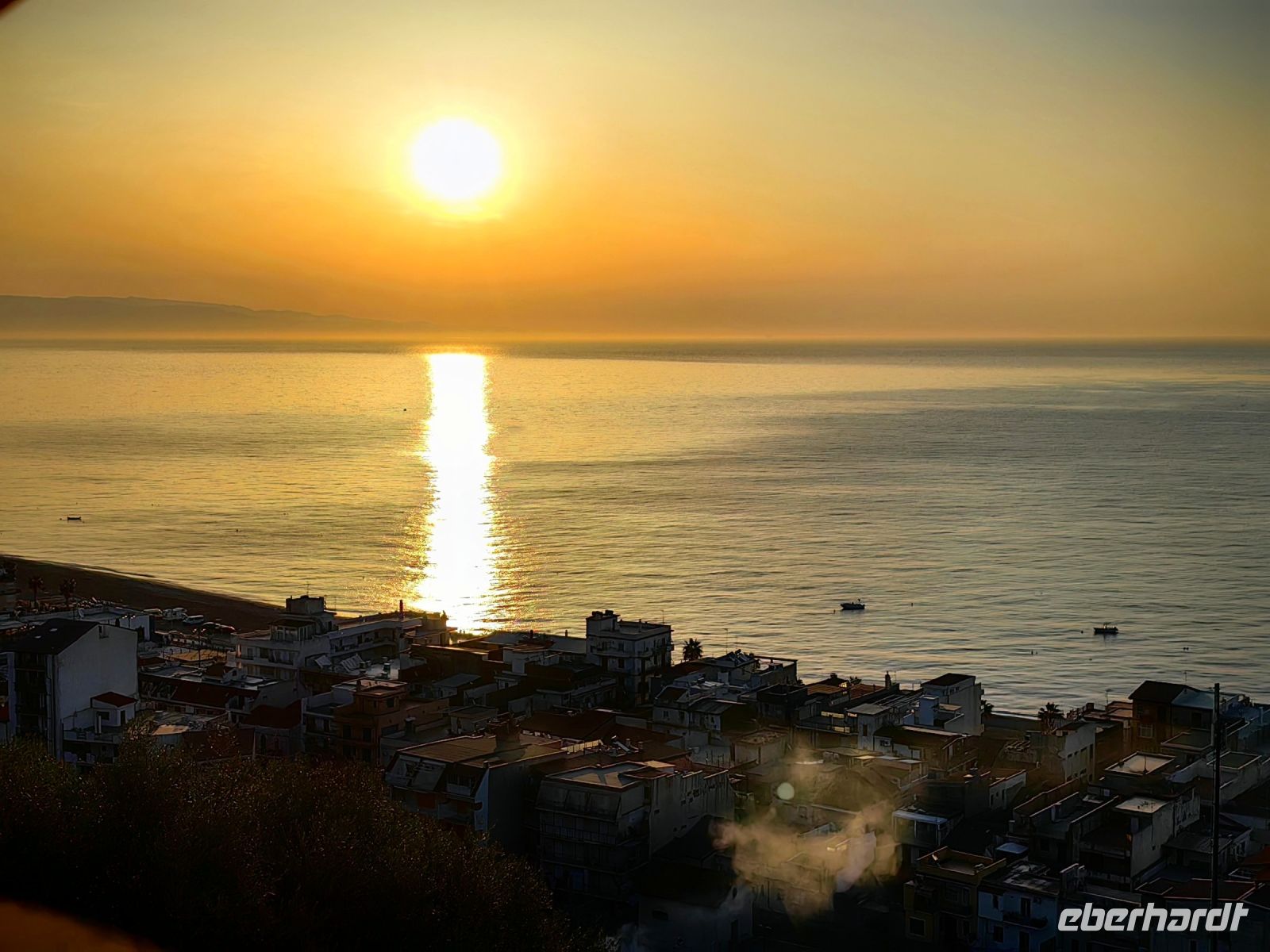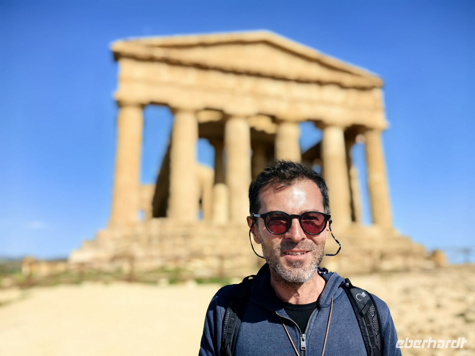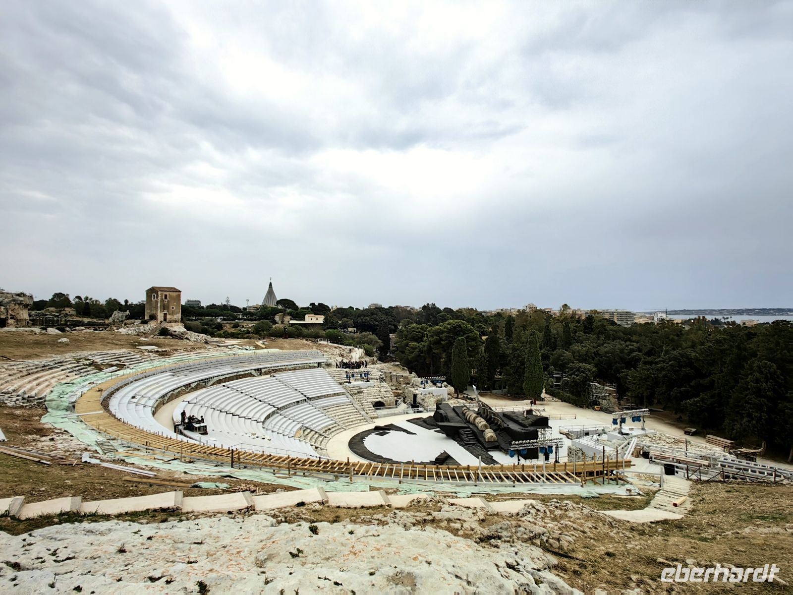 Wir steigen den Hügel weiter hinauf, um das Theater zu besuchen. Es wurde etwa in der Mitte des 3. Jahrhunderts vor Christus errichtet und befindet sich auf dem Kamm des dem Tempel gegenüber liegenden etwa 440 Meter hohen Hügels. Sieben keilförmige, mit Travertin gepflasterte Treppenaufgänge unterteilen die Sitzreihen in Blöcke, die horizontale Unterteilung hingegen erlaubte es den Zuschauern, von einem Block zum anderen zu wandern. Das Theater bot einst 3.000 Personen Platz. Heutzutage findet hier jedes Jahr im Sommer das Dionisiache-Festival statt. Ein Gast und unser Camillo führen uns die grandiose Akustik mit einem Live-Ständchen von "Bella Ciao" vor und wir widmen uns den letzten Resten des gestrigen Marsala und blicken in die postkartengleiche Umgebung.