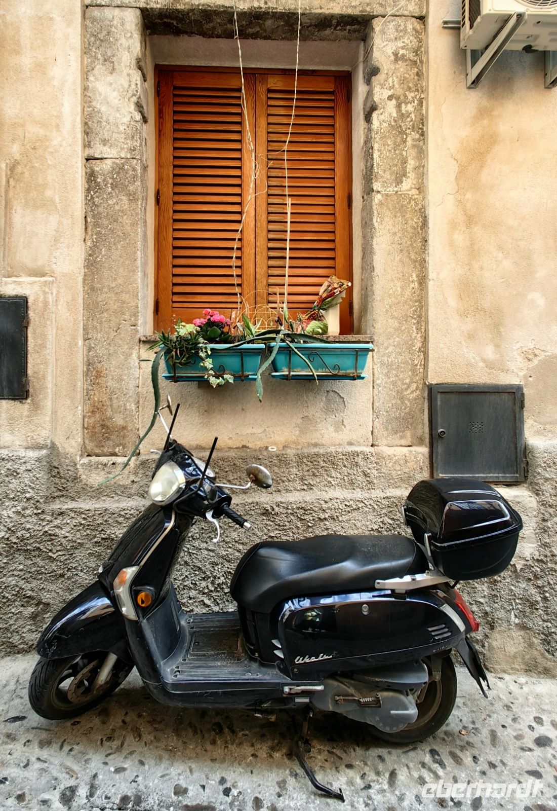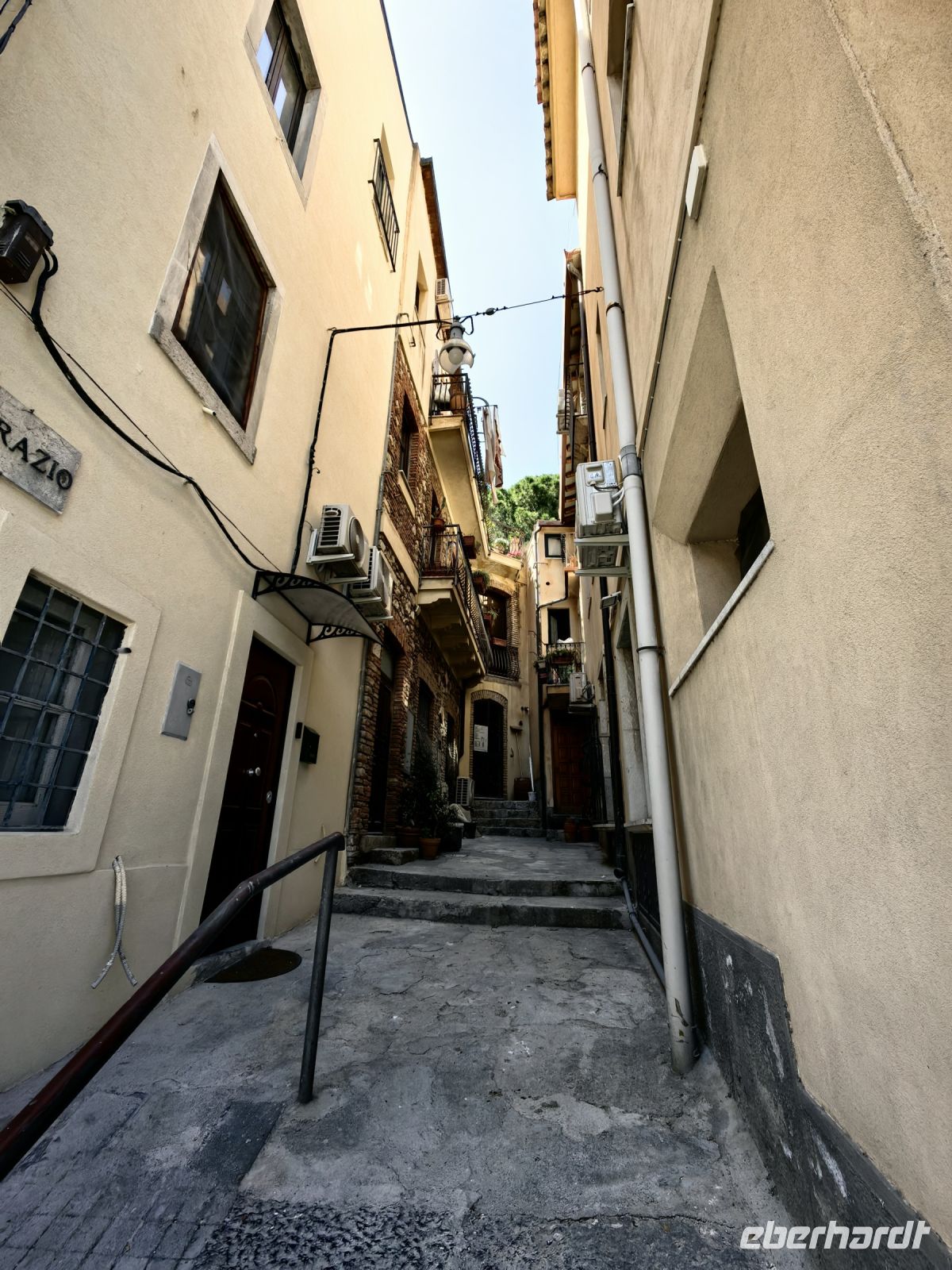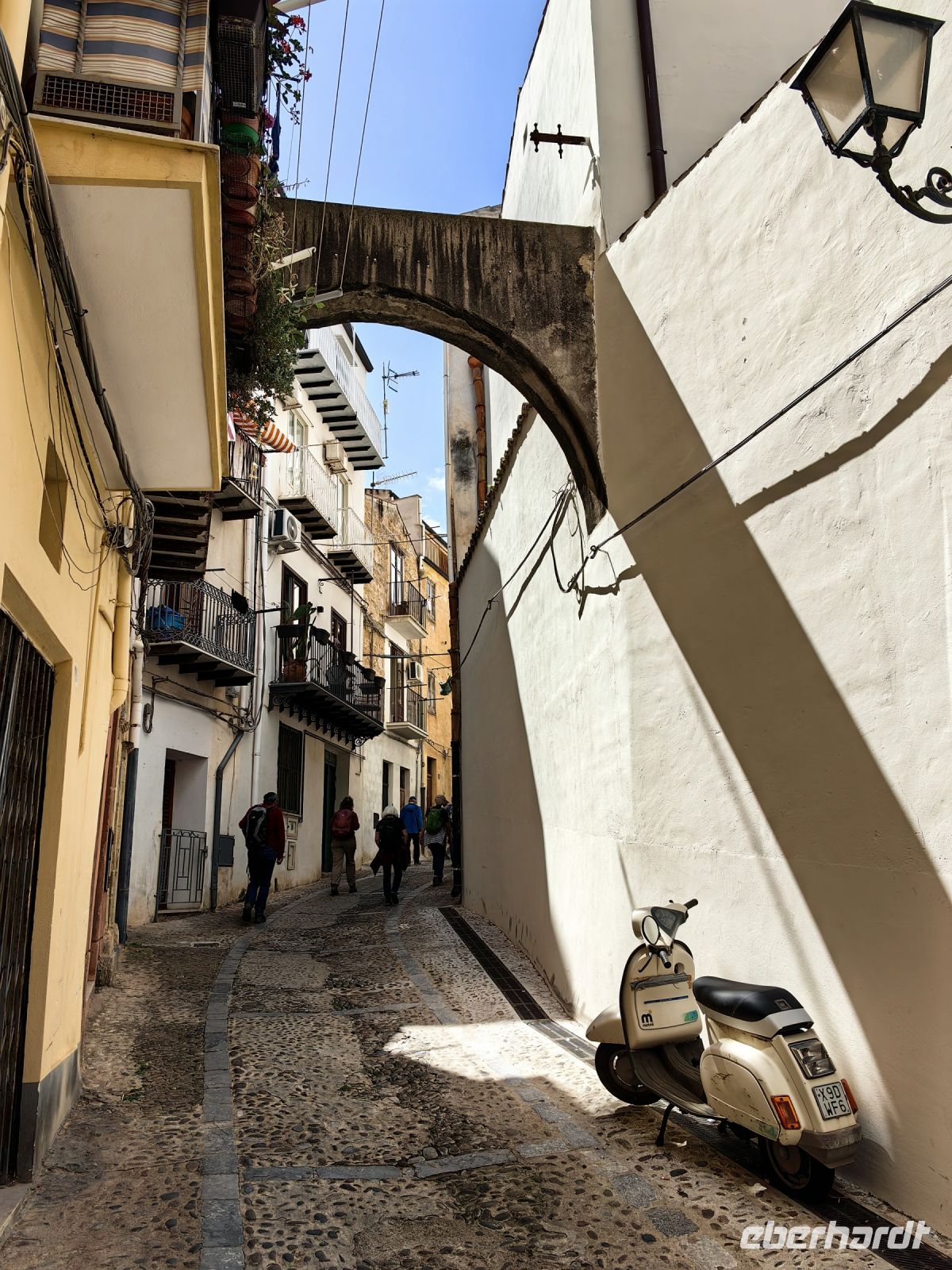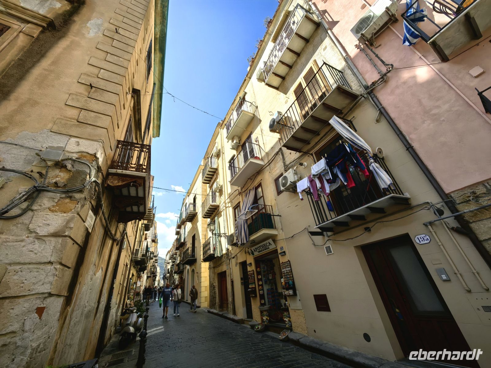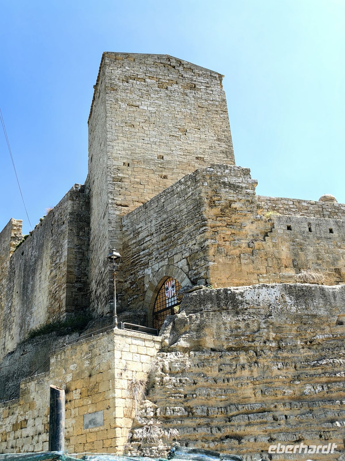 Nun laufen wir durch die urig, verwinkelten Gassen, die recht steil nach oben führen und von der Stadtmauer umgeben sind. Ganz oben ragt das Castello di Venere heraus, welches im 12. und 13. Jahrhundert erbaut wurde. Einst befand sich an diesem Ort ein Venustempel, die Karthager weihten ihn der Astarte, die Phönizier der Gottheit Toruc, für die Griechen war es die Aphrodite und für die Römer die Venus, auf italienisch Venere. Daher stammt auch der heutige Name: Castello Venere. Durch die Eroberung der Normannen um 1076 wurde dieser Venustempel zu einem Schloß umfunktioniert und sieht mit seinen eckigen Zinnen trutzig und uneinnehmbar aus.