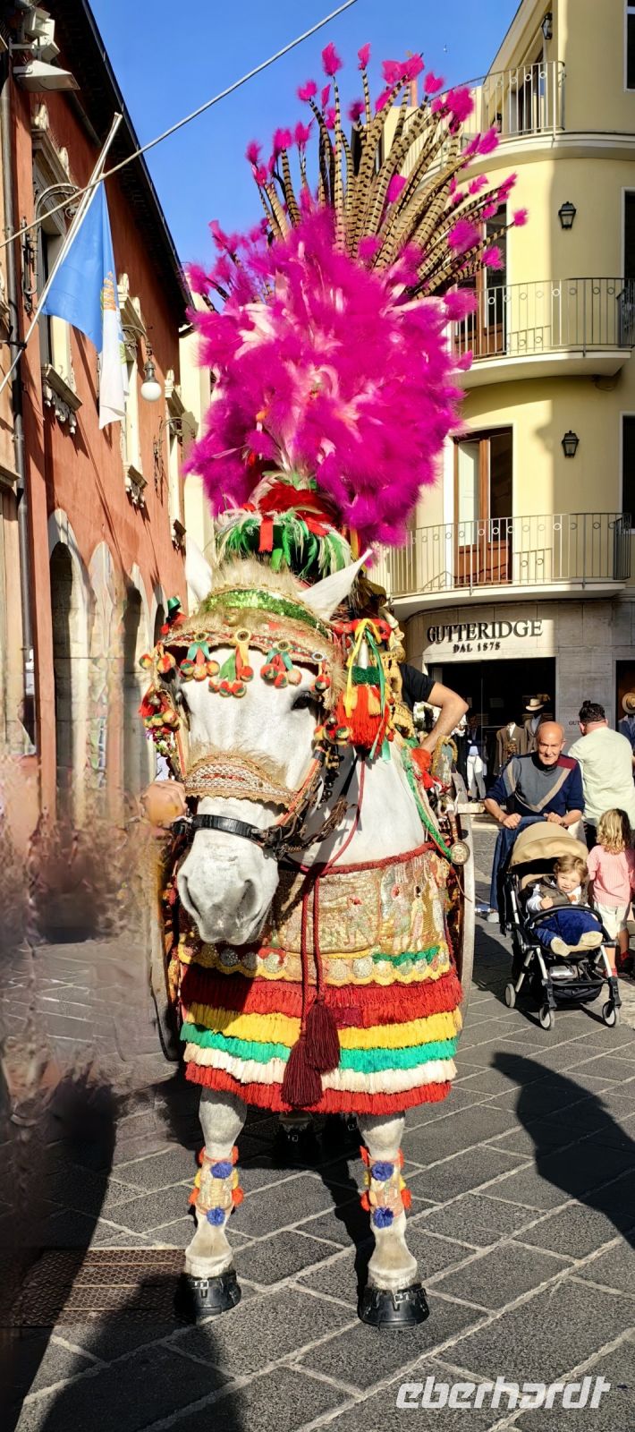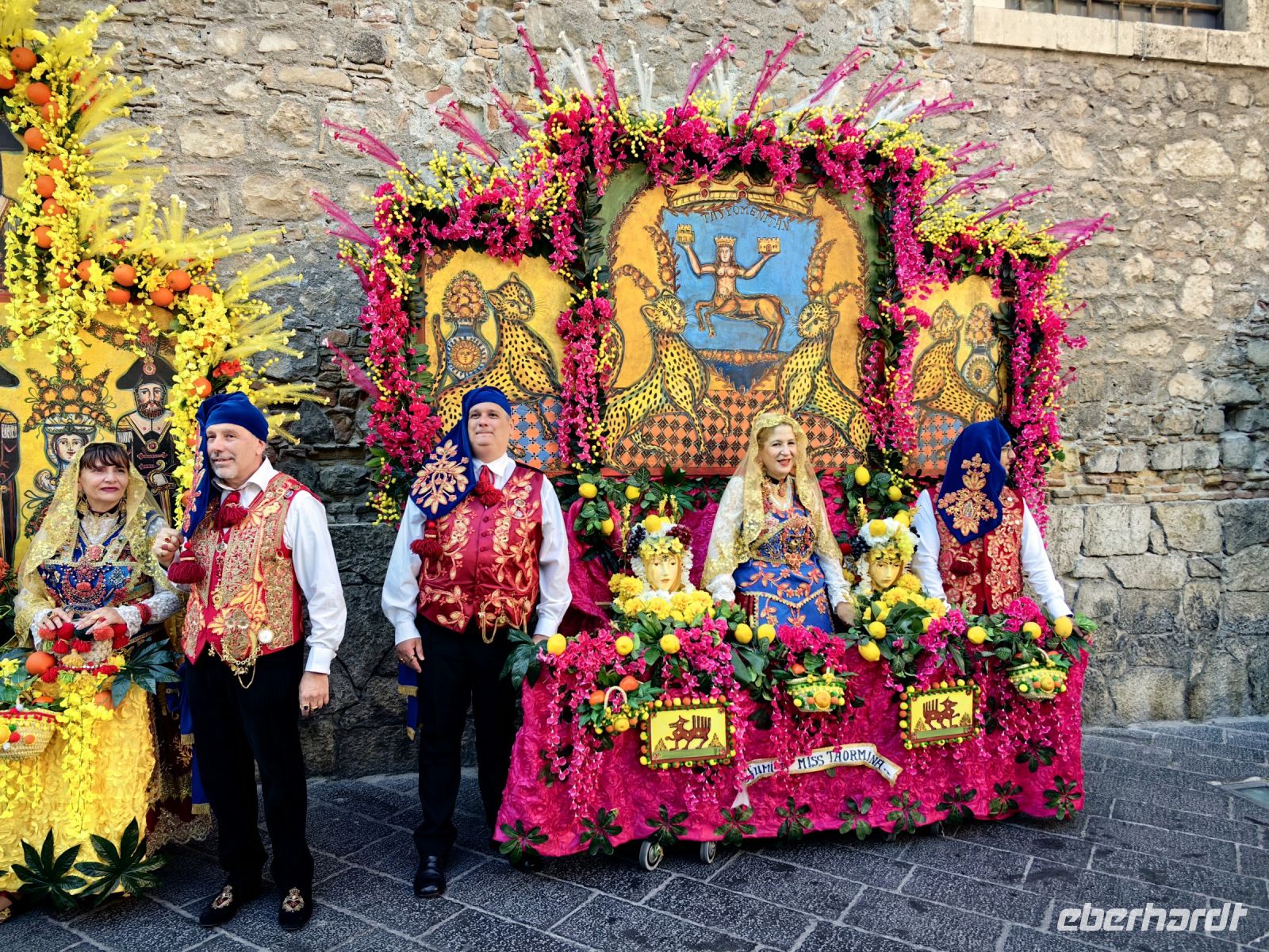 Nun laufen wir über die von unzähligen kleinen Geschäften gesäumte Corso Umberto und verweilen kurz auf der Piazza IX Aprile, wo durch den Frühlingsumzug sehr viel los ist und wir aufpassen müssen, daß wir keinen Gast verlieren. Leider ist es spät geworden und wir müssen zum Hotel zurückfahren. Einige Gäste hätten trotz der anstrengenden Wanderung sicher gern noch ein paar Stunden das Spektakel der kostümierten Frühlingsfeiernden genossen.