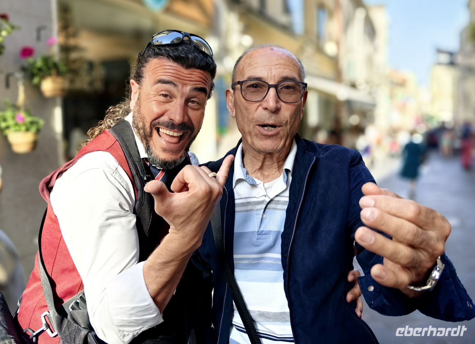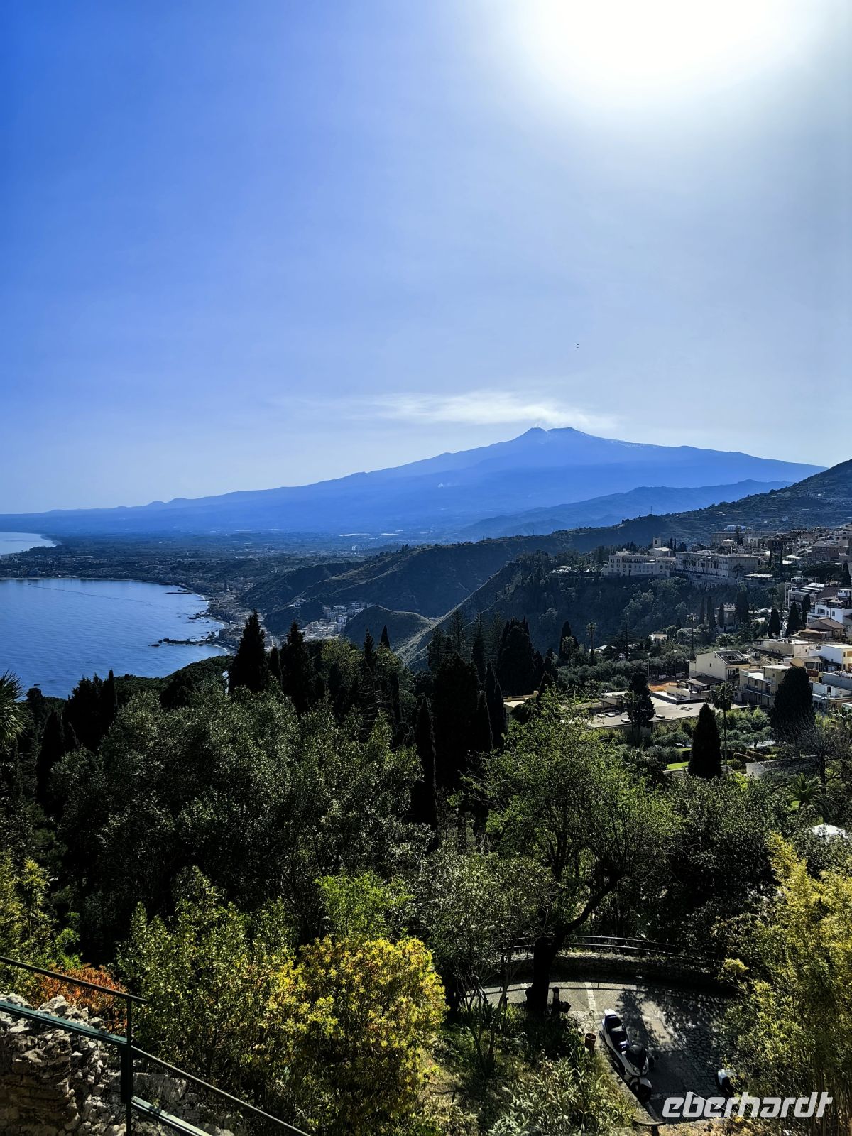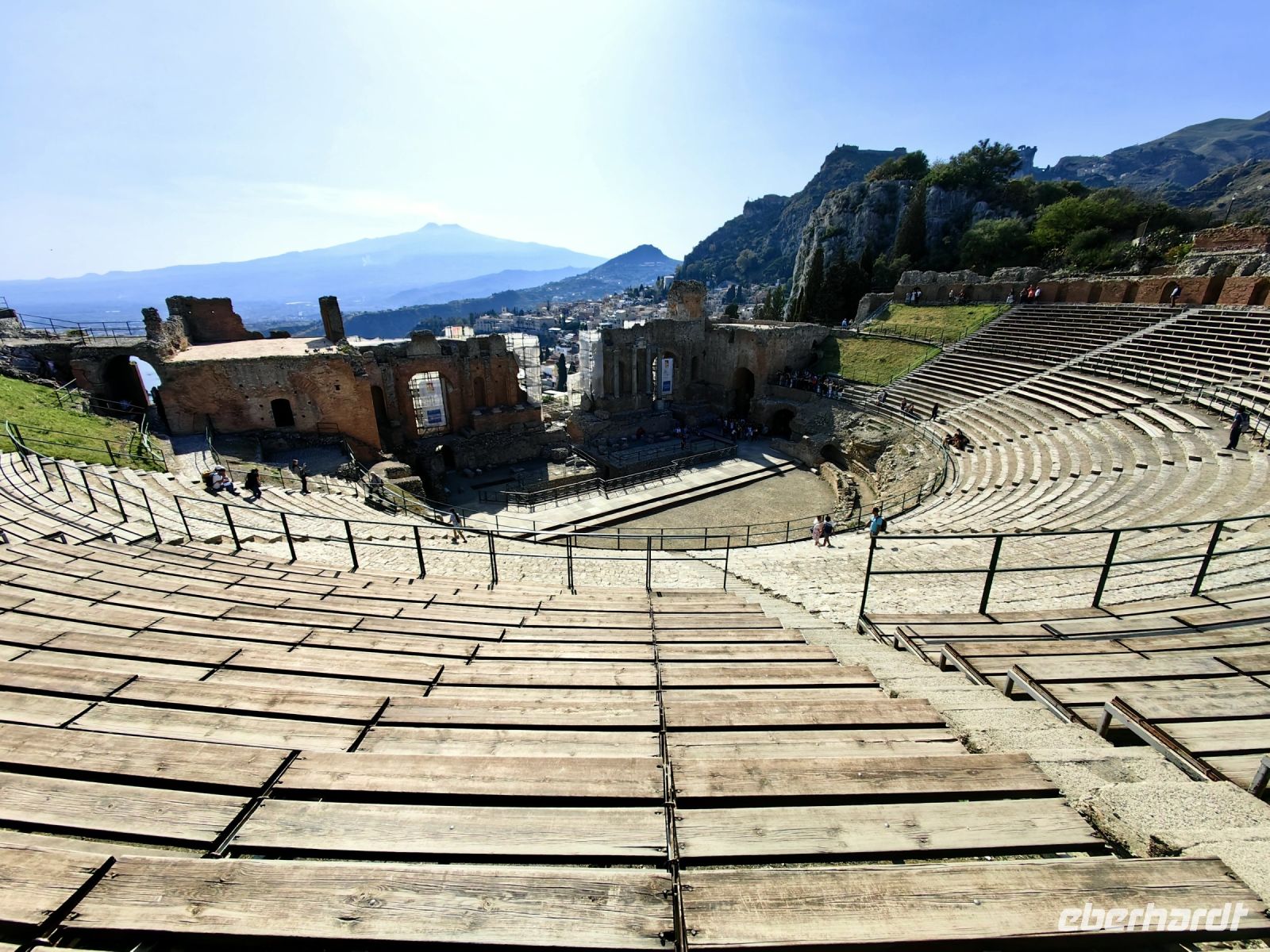 Am Nachmittag treffen wir uns wieder und schauen uns gemeinsam das antike Teatro Greco an, dessen spektakuläre Aussicht zum Ionischen Meer und zum Ätna uns begeistern. Das gut erhaltene Amphitheater mit Terrassen und intakten Steinwänden sowie die großen Säulen der Bühne sind sehr eindrucksvoll und wir können uns sehr gut vorstellen, wie es sein muß, heutzutage hier an einem lauen Sommerabend einer Opernaufführung oder einem Konzert beizuwohnen. Viele Einheimische kommen gern hierher, um die zahlreichen vulkanischen Aktivitäten des Ätna zu beobachten, der Blick ist einfach spektakulär.