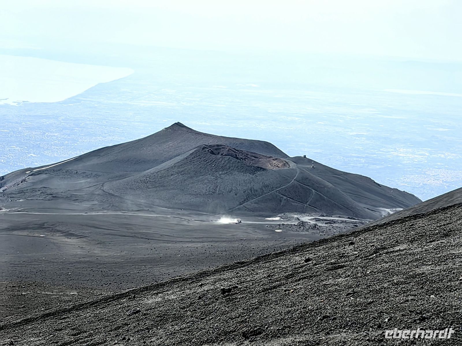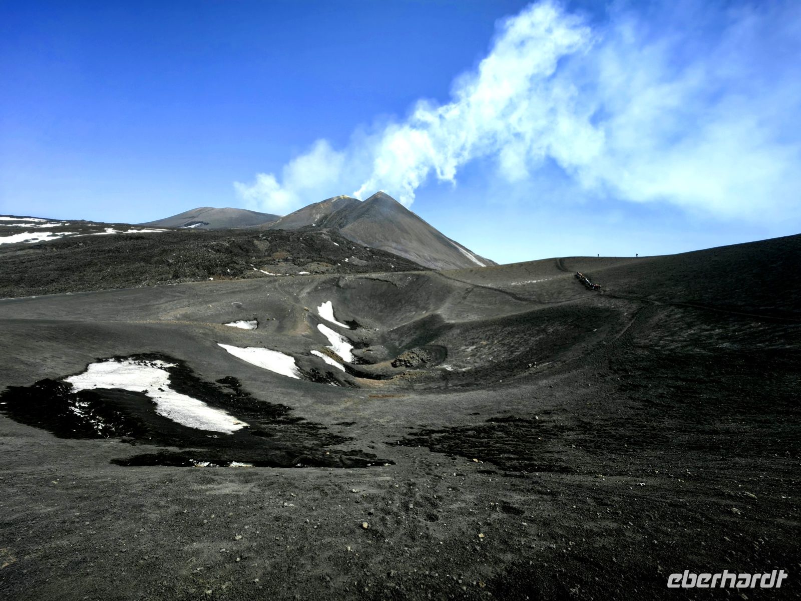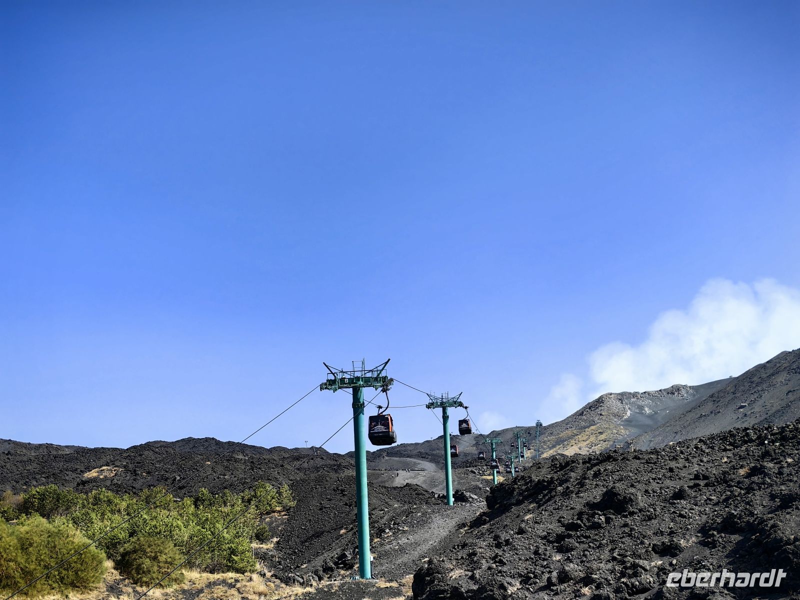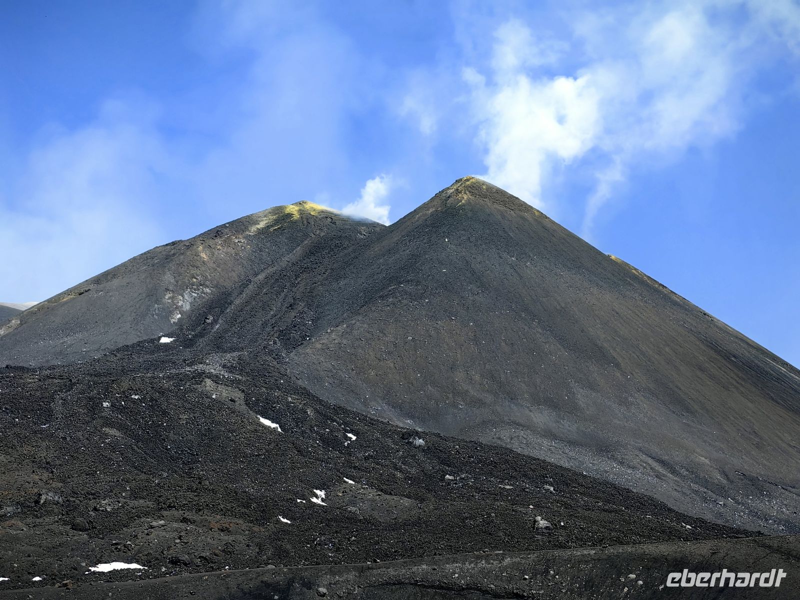 Heute ist es endlich soweit, wir werden den Wächter Siziliens aus nächster Nähe erleben. Das Wetter könnte nicht besser sein, kein Wölkchen ist am Himmel zu sehen und wir sind alle wild entschlossen, so weit wie möglich nach oben zu kommen. Schon bei der Hinfahrt können wir die sehr spezielle Vegetation sehen, die nur hier um die Gipfel des Ätna herum wächst. Endemische Kiefern, sogar Buchen, baumhoher Ginster und natürlich Wein, Apfel- und Nußbäume gedeihen auf der Lavaerde prächtig. Von der Südwestseite aus erheben wir uns in luftige Höhen mit der Seilbahn und danach geht es mit riesigen Jeeps weiter, die auf dem pulverisierten Lavastaub fahren können. Unterhalb der vier Hauptkrater verlassen wir das Mobil und bewegen uns in einer Höhe um die 3.000 Meter nun zu Fuß über die Lavafelder weiter. Übrigens ist es im Italienischen nicht DER Ätna, sondern DIE. Sogar die Höhe des Vulkans variiert, je nachdem, wann der letzte Ausbruch war und wieviel Lava ausgetreten ist. 2022 war die höchste Erhebung 3.357 Meter hoch. Europas größter tätiger Vulkan hat eine unglaubliche Fläche von 1.170 Quadratkilometern eingenommen und mittlerweile gibt es vier Gipfelkrater: den Hauptkrater, den direkt daneben liegenden Bocca Nuova, der 1968 entstand, den Nordostkrater von 1911 und den Südostkrater von 1979. In jüngster Vergangenheit brach die Lava allerdings nicht aus diesen Gipfelkratern heraus, sondern an den Flanken des Bergkegels und so entstanden etwa 400 Nebenkrater.
