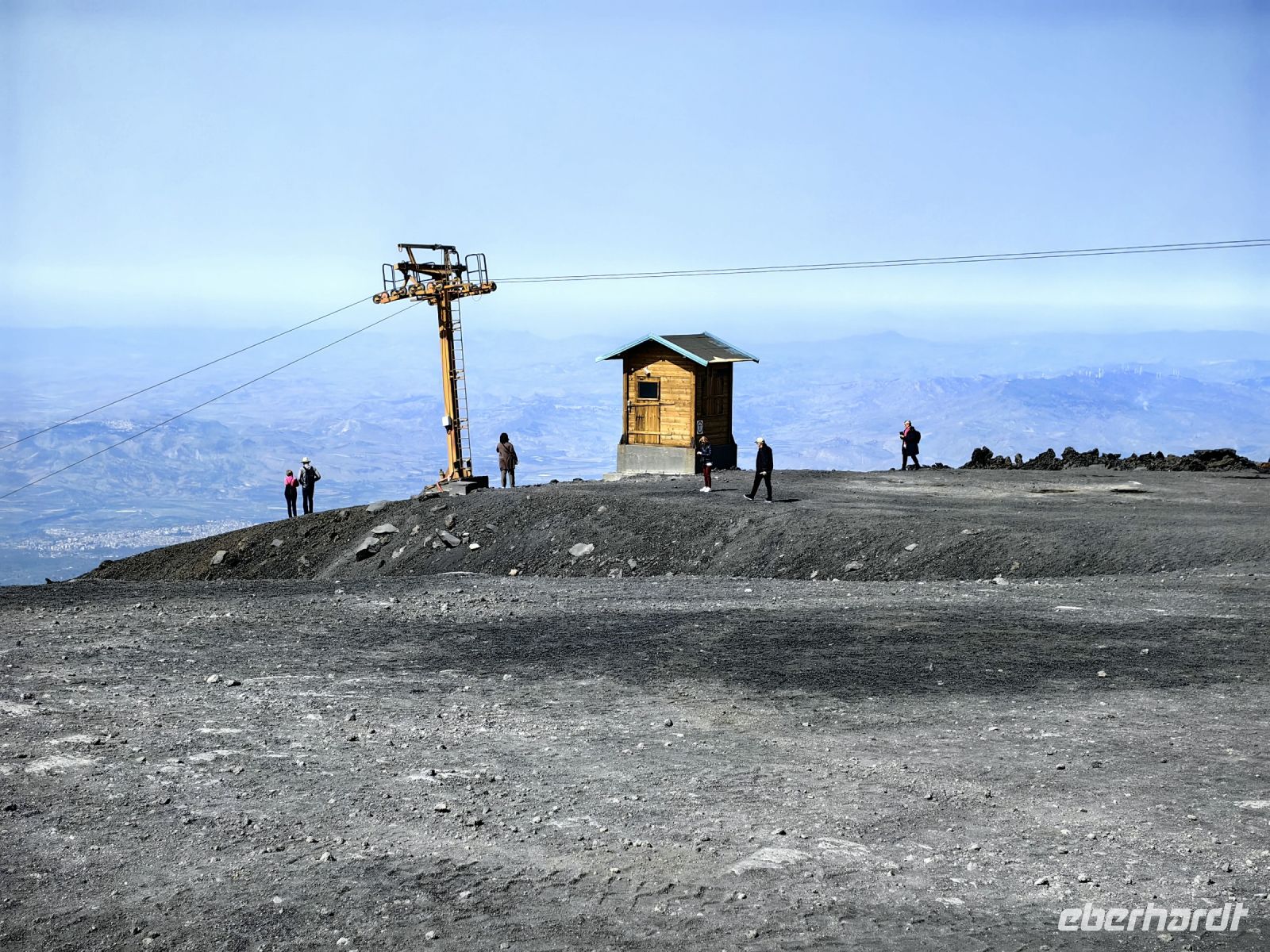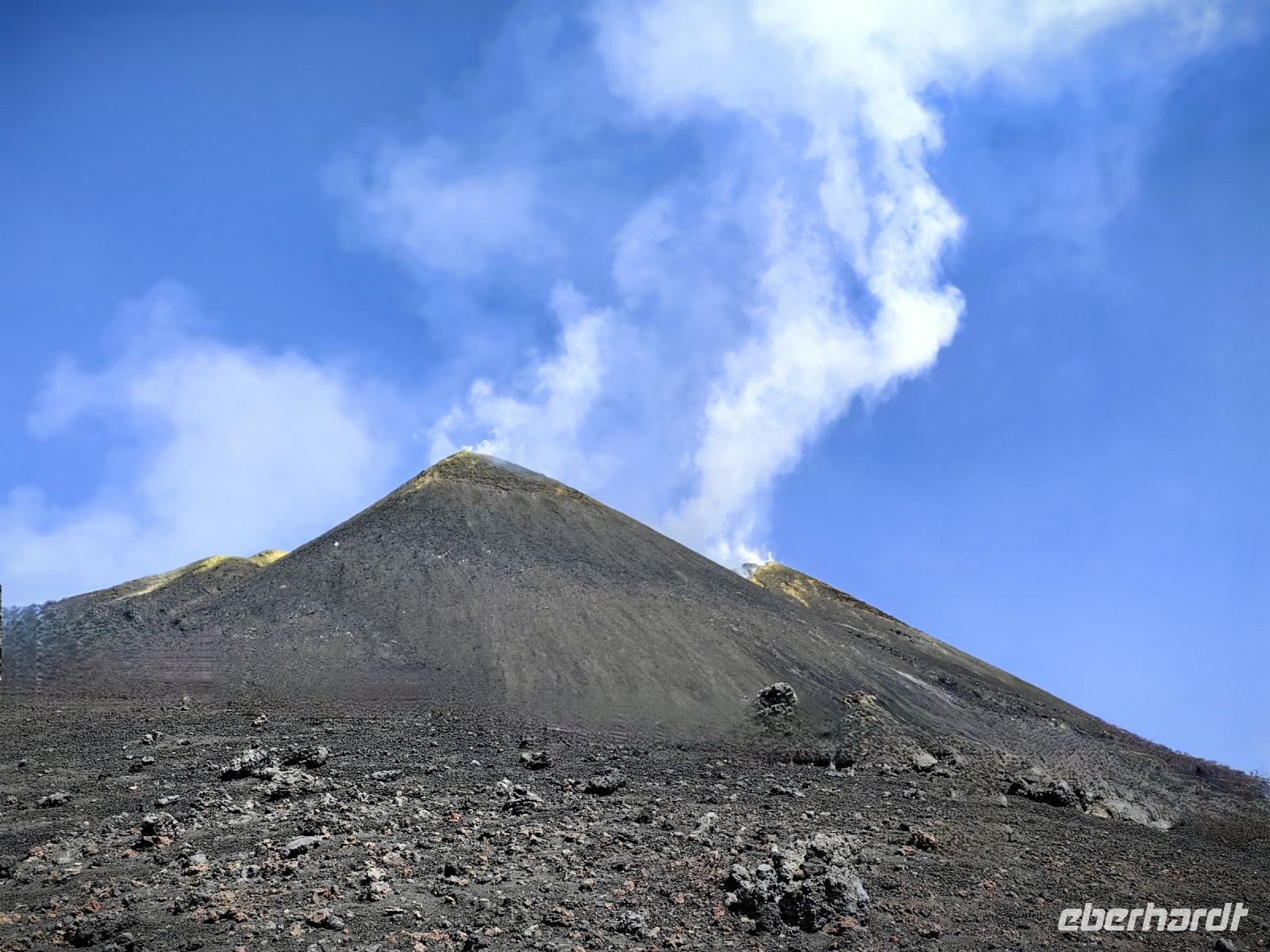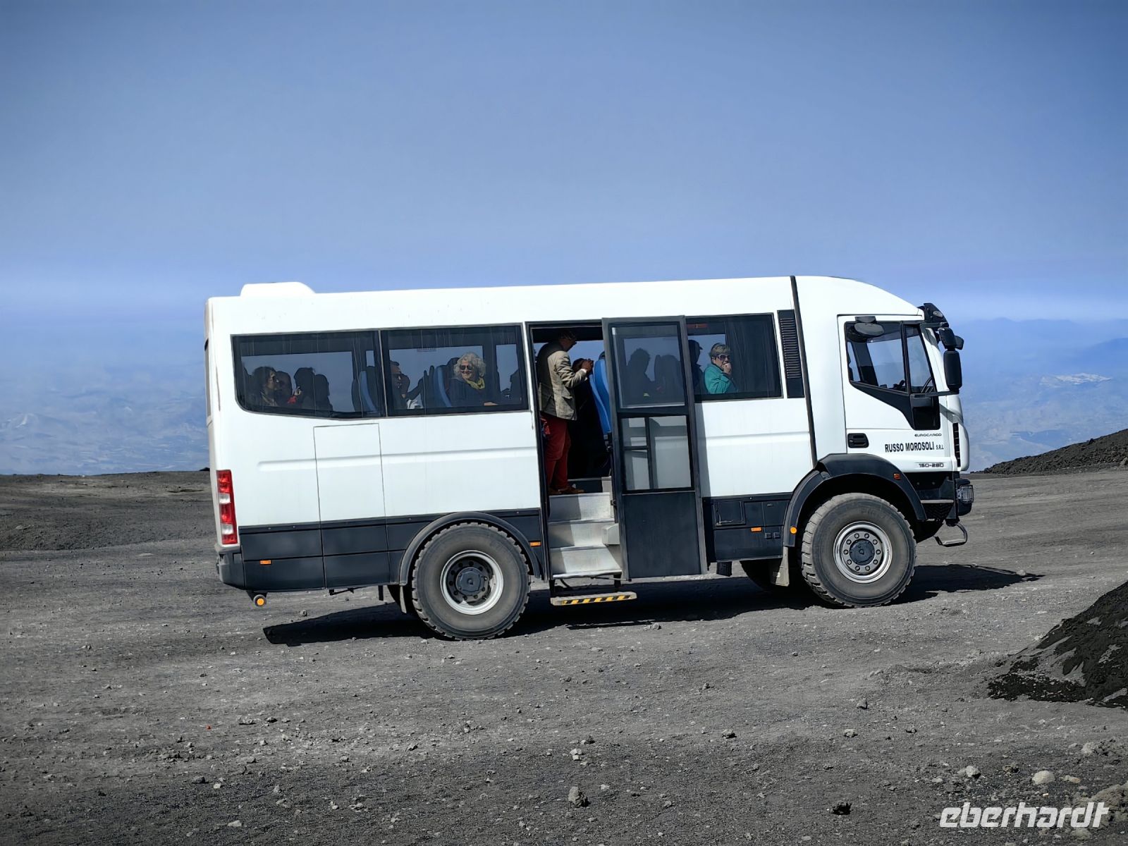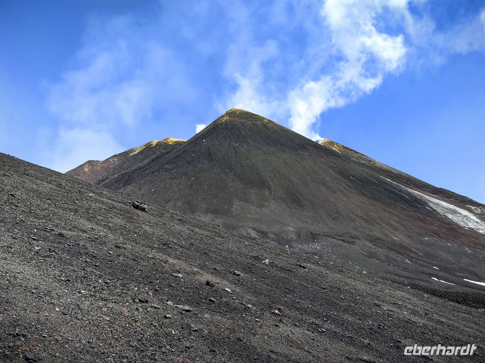 Heute ist es endlich soweit, wir werden den Wächter Siziliens aus nächster Nähe erleben. Das Wetter könnte nicht besser sein, kein Wölkchen ist am Himmel zu sehen und wir sind alle wild entschlossen, so weit wie möglich nach oben zu kommen. Schon bei der Hinfahrt können wir die sehr spezielle Vegetation sehen, die nur hier um die Gipfel des Ätna herum wächst. Endemische Kiefern, sogar Buchen, baumhoher Ginster und natürlich Wein, Apfel- und Nußbäume gedeihen auf der Lavaerde prächtig. Von der Südwestseite aus erheben wir uns in luftige Höhen mit der Seilbahn und danach geht es mit riesigen Jeeps weiter, die auf dem pulverisierten Lavastaub fahren können. Unterhalb der vier Hauptkrater verlassen wir das Mobil und bewegen uns in einer Höhe um die 3.000 Meter nun zu Fuß über die Lavafelder weiter. Übrigens ist es im Italienischen nicht DER Ätna, sondern DIE. Sogar die Höhe des Vulkans variiert, je nachdem, wann der letzte Ausbruch war und wieviel Lava ausgetreten ist. 2022 war die höchste Erhebung 3.357 Meter hoch. Europas größter tätiger Vulkan hat eine unglaubliche Fläche von 1.170 Quadratkilometern eingenommen und mittlerweile gibt es vier Gipfelkrater: den Hauptkrater, den direkt daneben liegenden Bocca Nuova, der 1968 entstand, den Nordostkrater von 1911 und den Südostkrater von 1979. In jüngster Vergangenheit brach die Lava allerdings nicht aus diesen Gipfelkratern heraus, sondern an den Flanken des Bergkegels und so entstanden etwa 400 Nebenkrater.