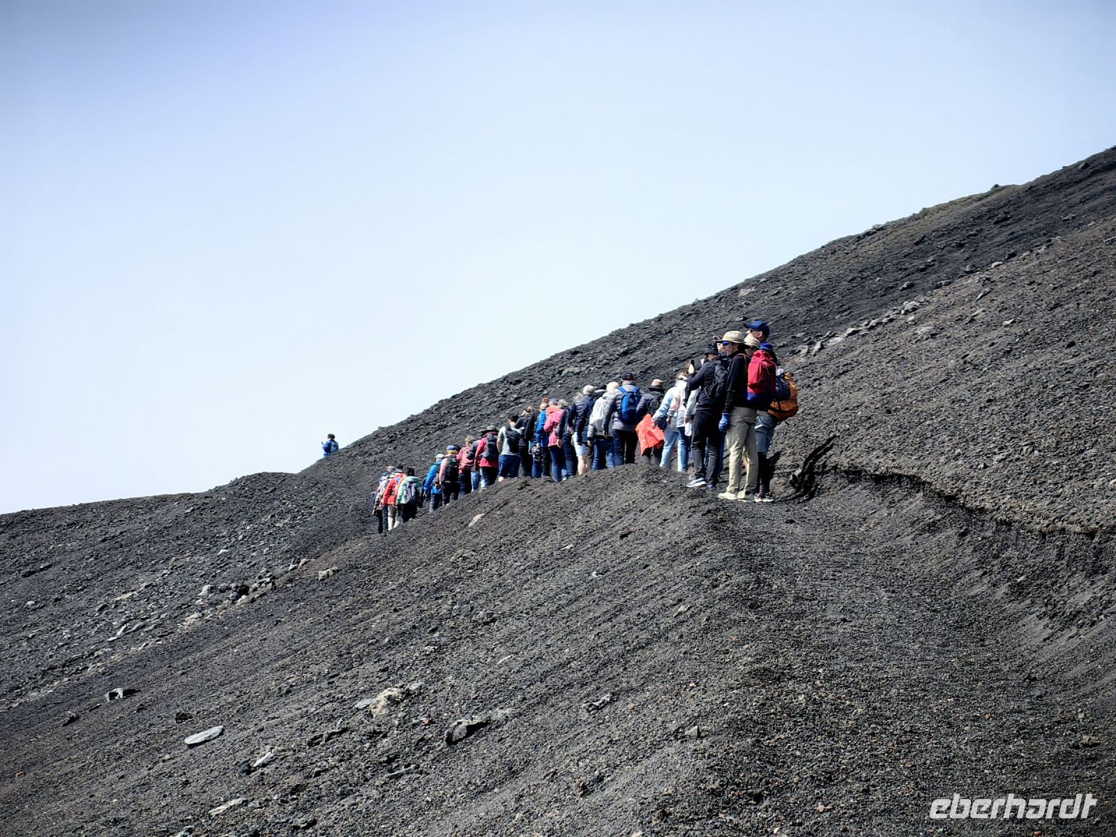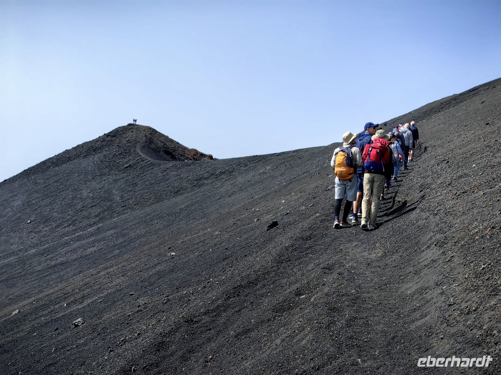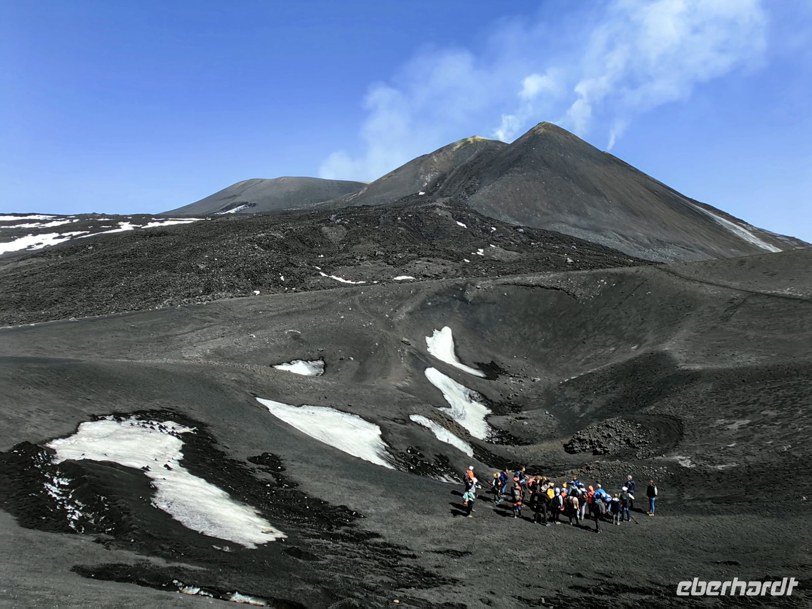 Wir marschieren in einer Reihe über die staubige dunkle Asche und sehen unzählige Kraterränder, Geröll und man kann die verschiedenen Farben der unterschiedlich alten Lavaschichten deutlich erkennen. Die Oberfläche ist porös, darunter befindet sich fester grauer Basalt, den man hier in Sizilien für den Hausbau und die Dekoration von Fassaden und Mauern verwendet. Leider sind die aufregenden Wolkenkringel, die der Ätna Anfang April diesen Jahres ausstieß, nicht mehr zu sehen. Trotzdem fasziniert diese Landschaft mit ihrer Einmaligkeit und die Blicke ins Tal und zur Küste sind spektakulär.