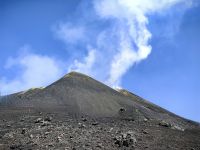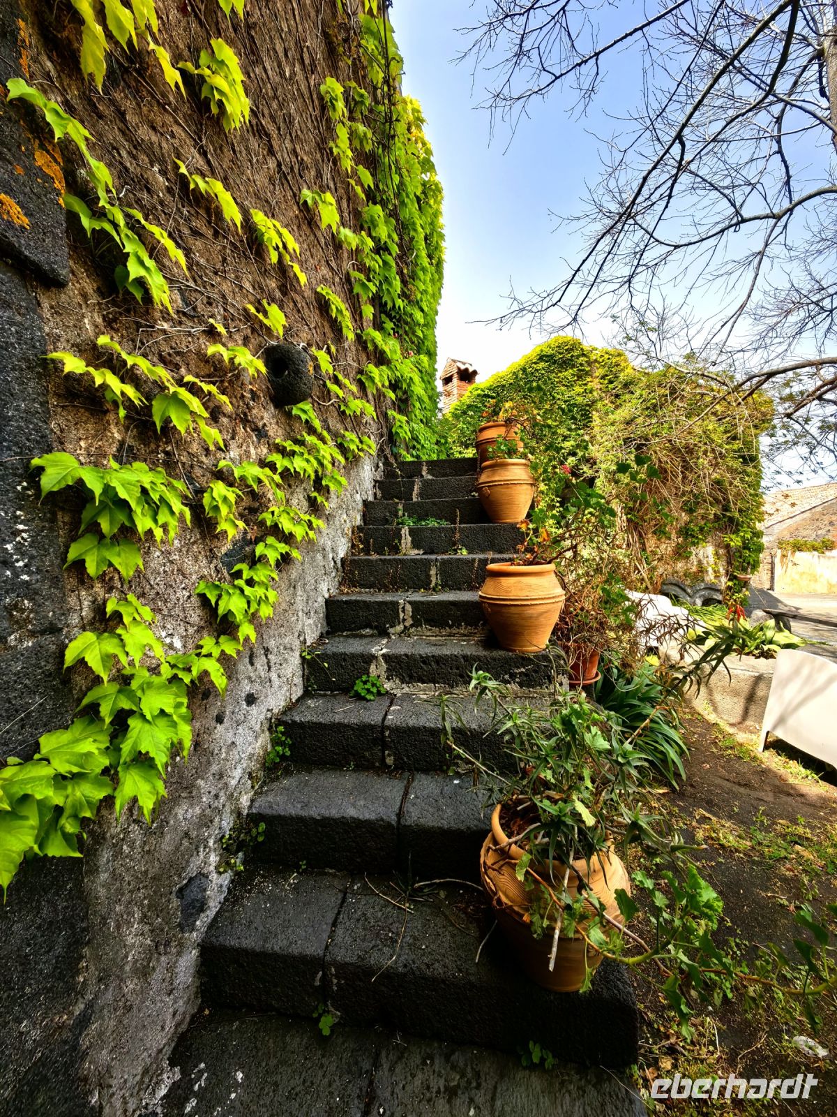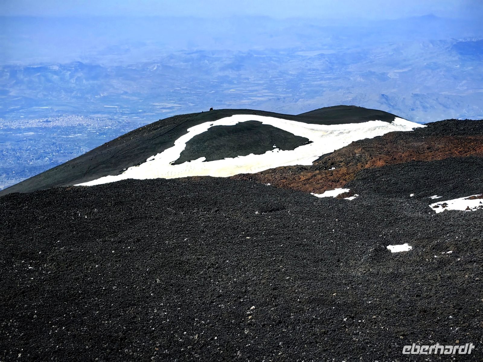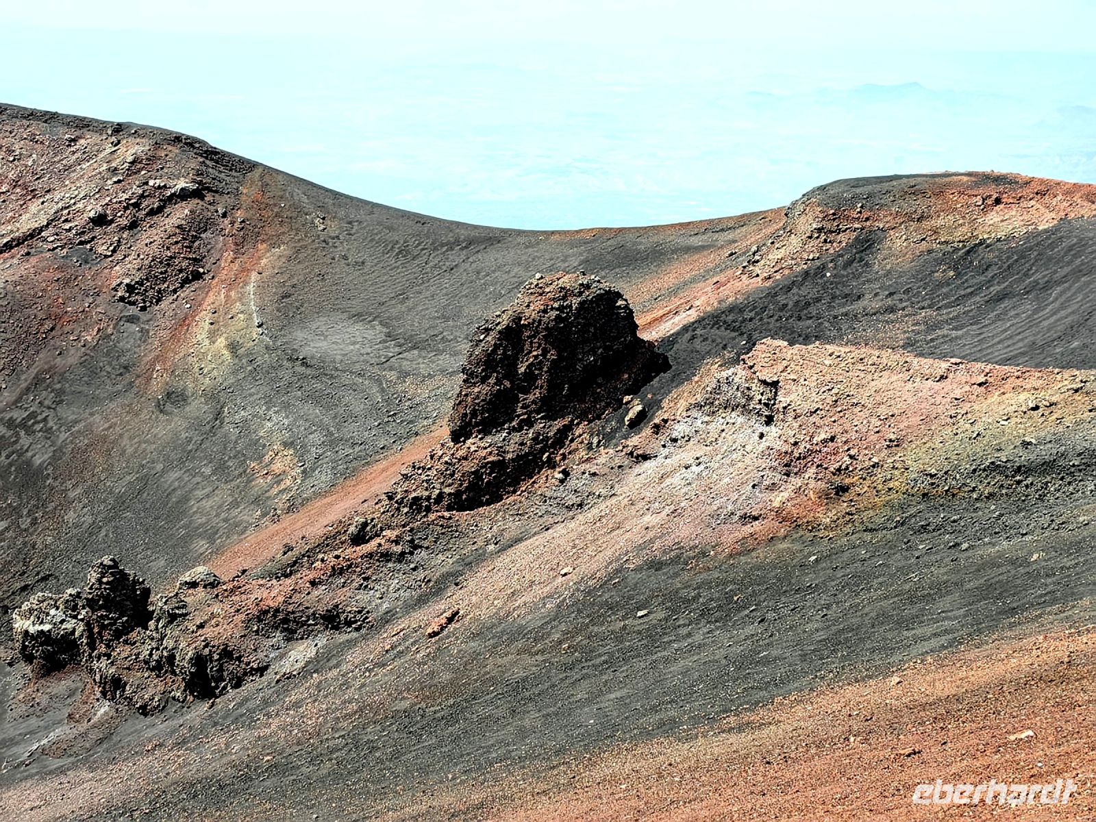 Wir marschieren in einer Reihe über die staubige dunkle Asche und sehen unzählige Kraterränder, Geröll und man kann die verschiedenen Farben der unterschiedlich alten Lavaschichten deutlich erkennen. Die Oberfläche ist porös, darunter befindet sich fester grauer Basalt, den man hier in Sizilien für den Hausbau und die Dekoration von Fassaden und Mauern verwendet. Leider sind die aufregenden Wolkenkringel, die der Ätna Anfang April diesen Jahres ausstieß, nicht mehr zu sehen. Trotzdem fasziniert diese Landschaft mit ihrer Einmaligkeit und die Blicke ins Tal und zur Küste sind spektakulär.