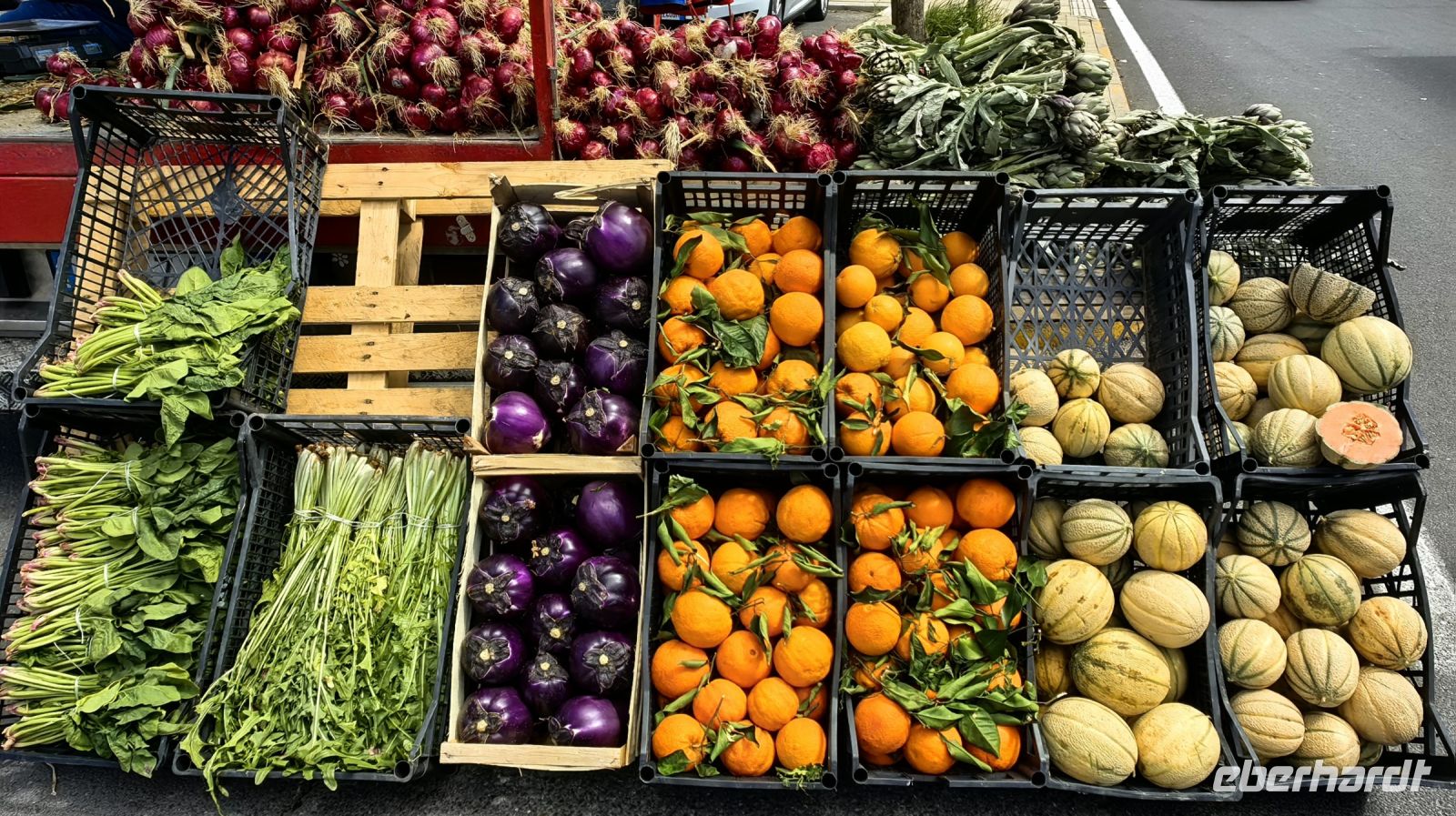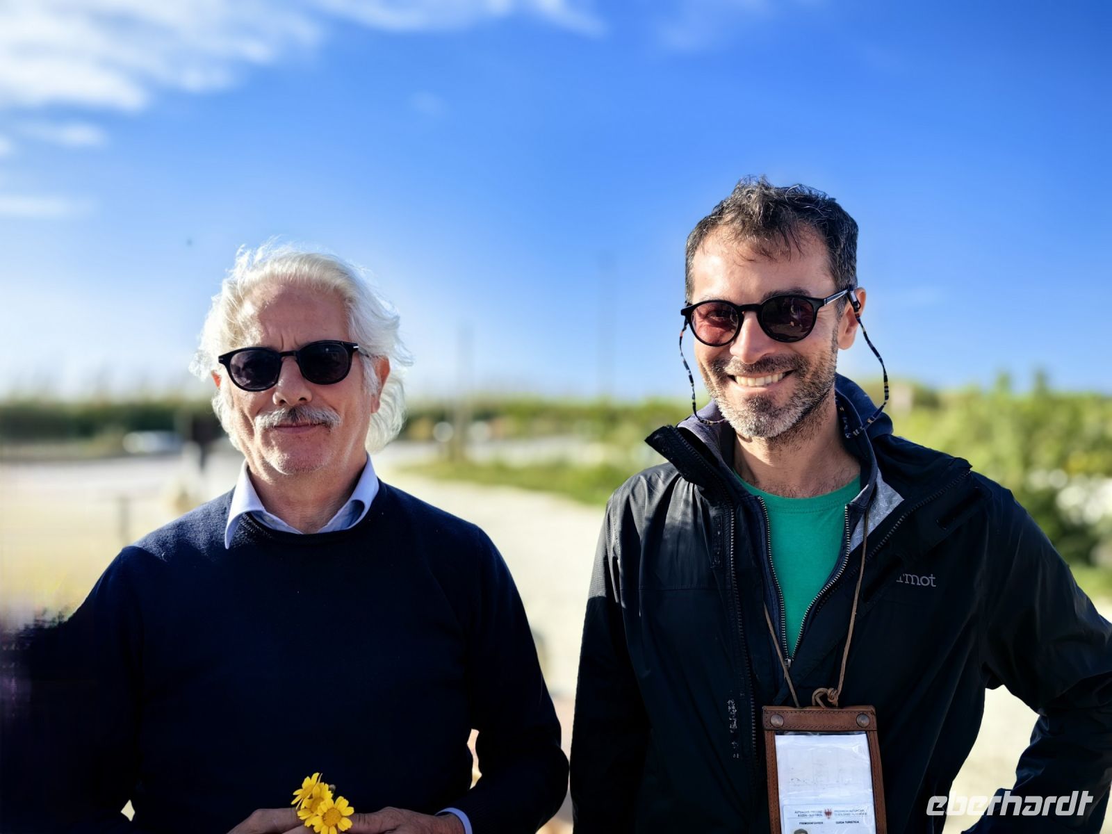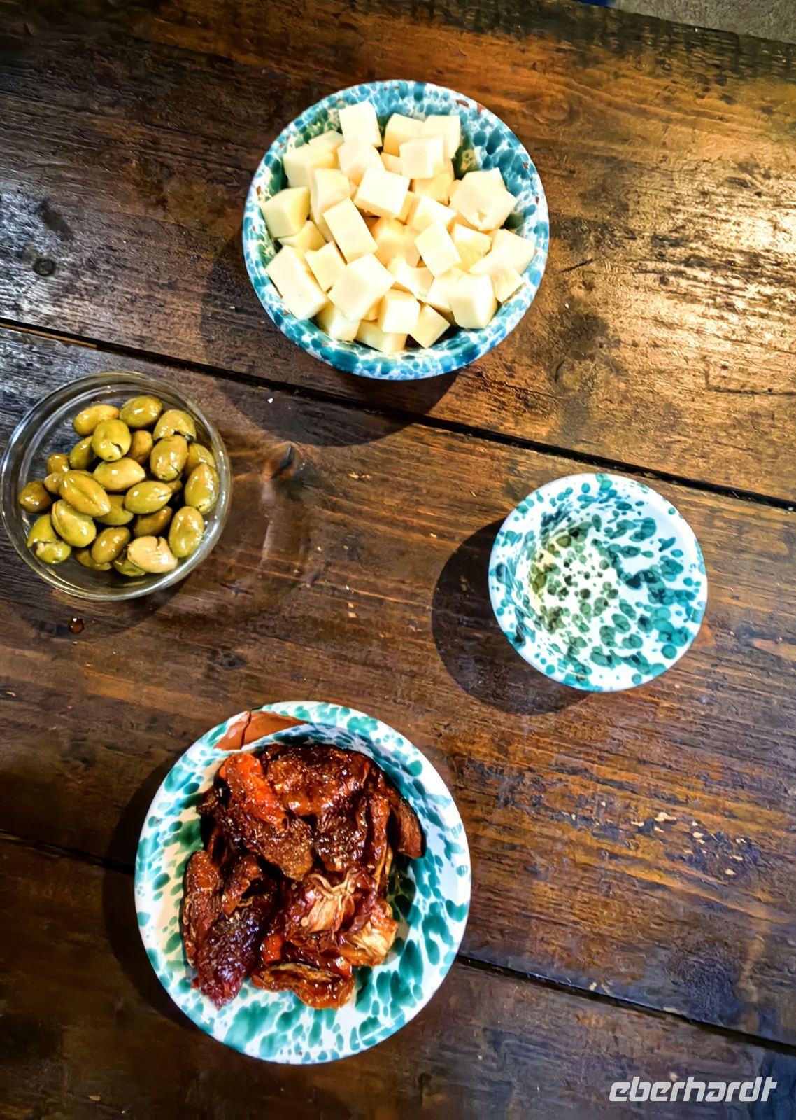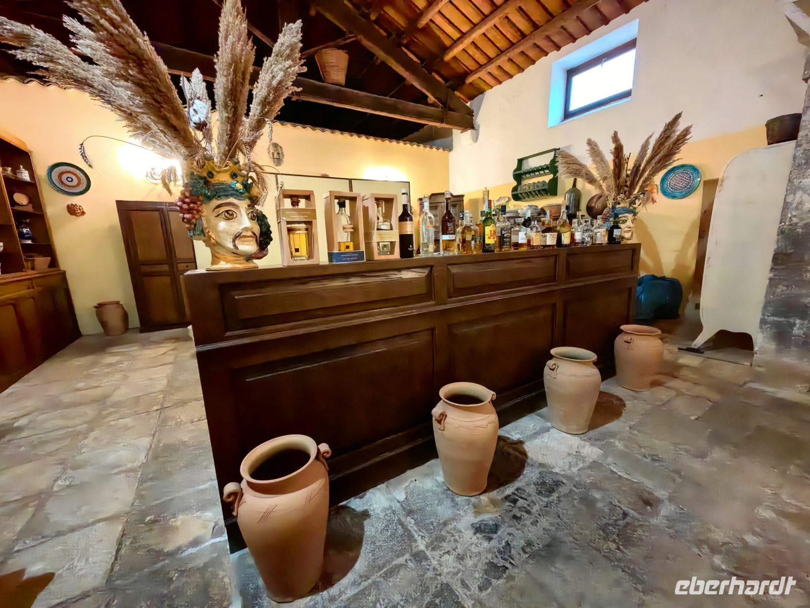 Nachdem wir uns unten auf der Plattform alle wieder zusammengefunden haben, fahren wir in das kleine Weingut La Sciarelle in Viagrande, wo wir die edlen Tropfen, die auf der Lavaerde prächtig gedeihen, verkosten dürfen. Dazu reicht man uns Pizzahäppchen, Avocadocreme, frisches Bauernbrot, Oliven und aromatische getrocknete Tomaten. Das lassen wir uns gefallen und genießen zum wiederholten Male den tollen Ausblick vom Weingut auf die umliegenden Weinstöcke, die reich behangenen Clementinenbäume und den dahinter am Horizont aufragenden Ätna.