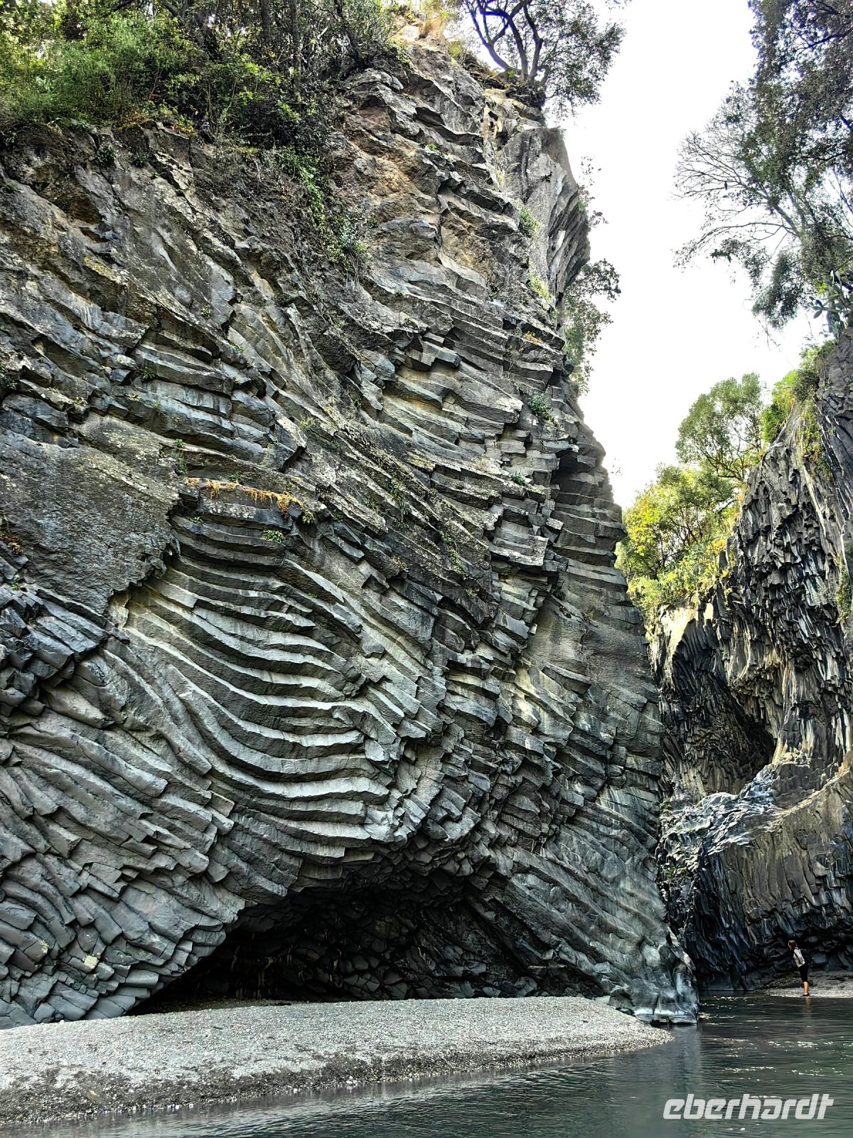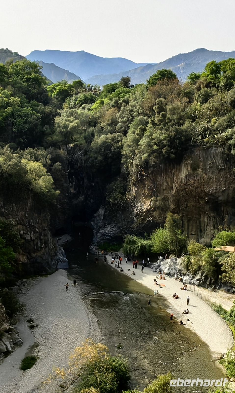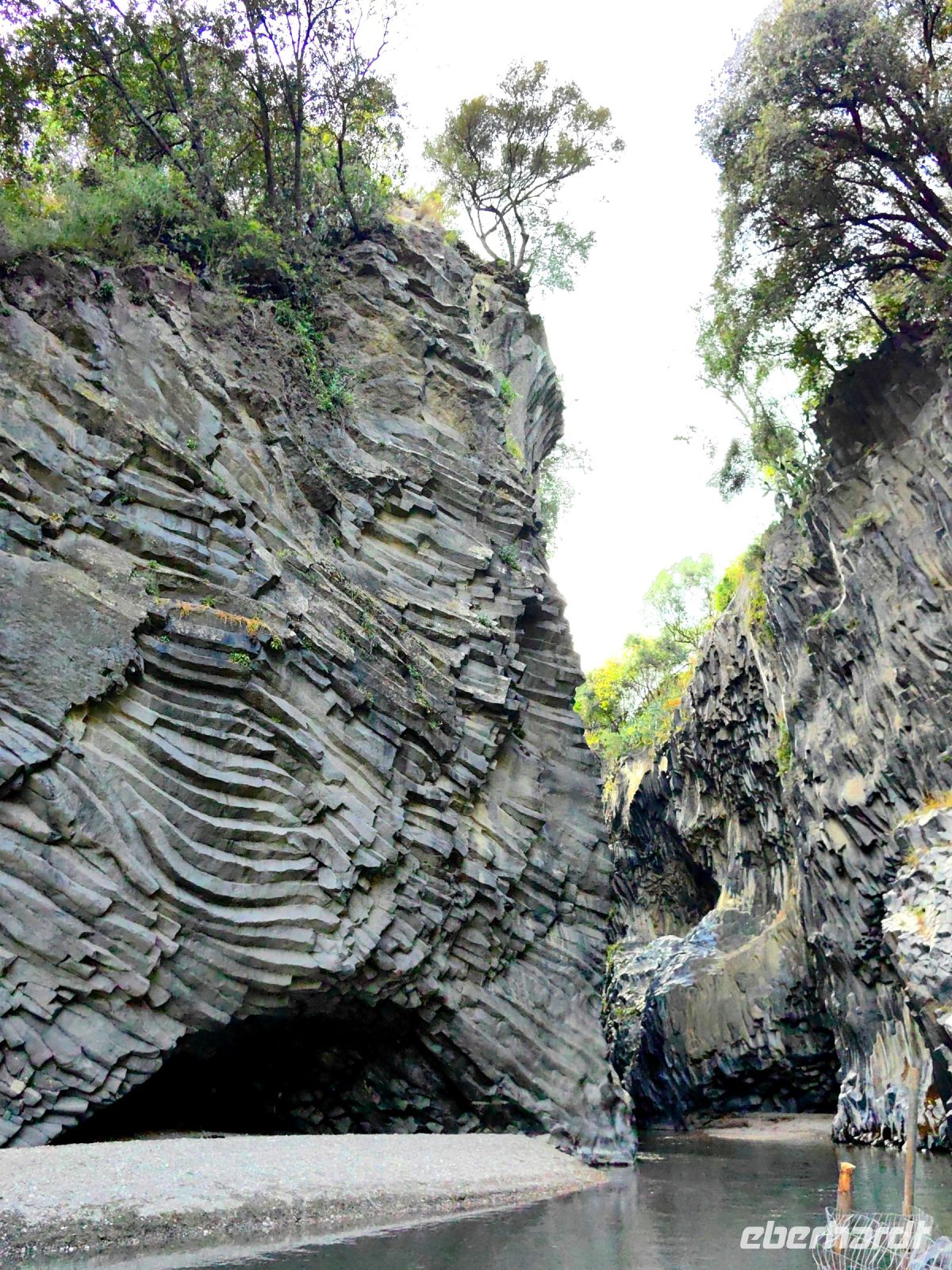 Nun wird es still im Bus und erst als wir die Alcantara-Schlucht erreichen, erwachen wir wieder. Diese spektakuläre Schlucht entstand, indem sich der gleichnamige Fluß durch Lavagestein des Ätna gefressen und interessante Srukturen hinterlassen hat. Die Besonderheit dieser Schlucht besteht darin, daß die Lava sich langsam abgekühlt hat und dadurch sehr hohe Felswände mit prismaartigen, fünfeckigen und sechseckigen Formen gebildet hat. Im Laufe der Jahrhunderte hat der Alcantara-Fluß mit seinem eiskalten klaren Wasser die Flußwände langsam erodiert und eine canyonähnliche Landschaft geschaffen. Im Nu haben wir die Schuhe ausgezogen und waten beherzt im kalten Wasser herum, um eine gute Position für ein tolles Foto zu finden und fühlen uns danach wie nach einer Kneippkur.