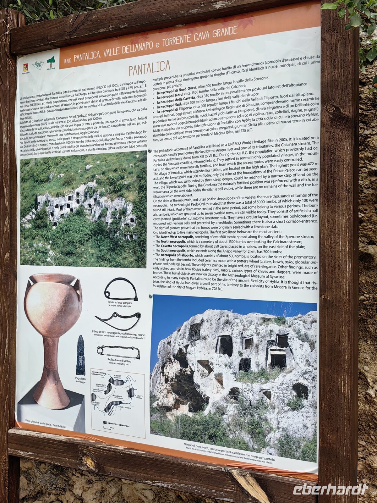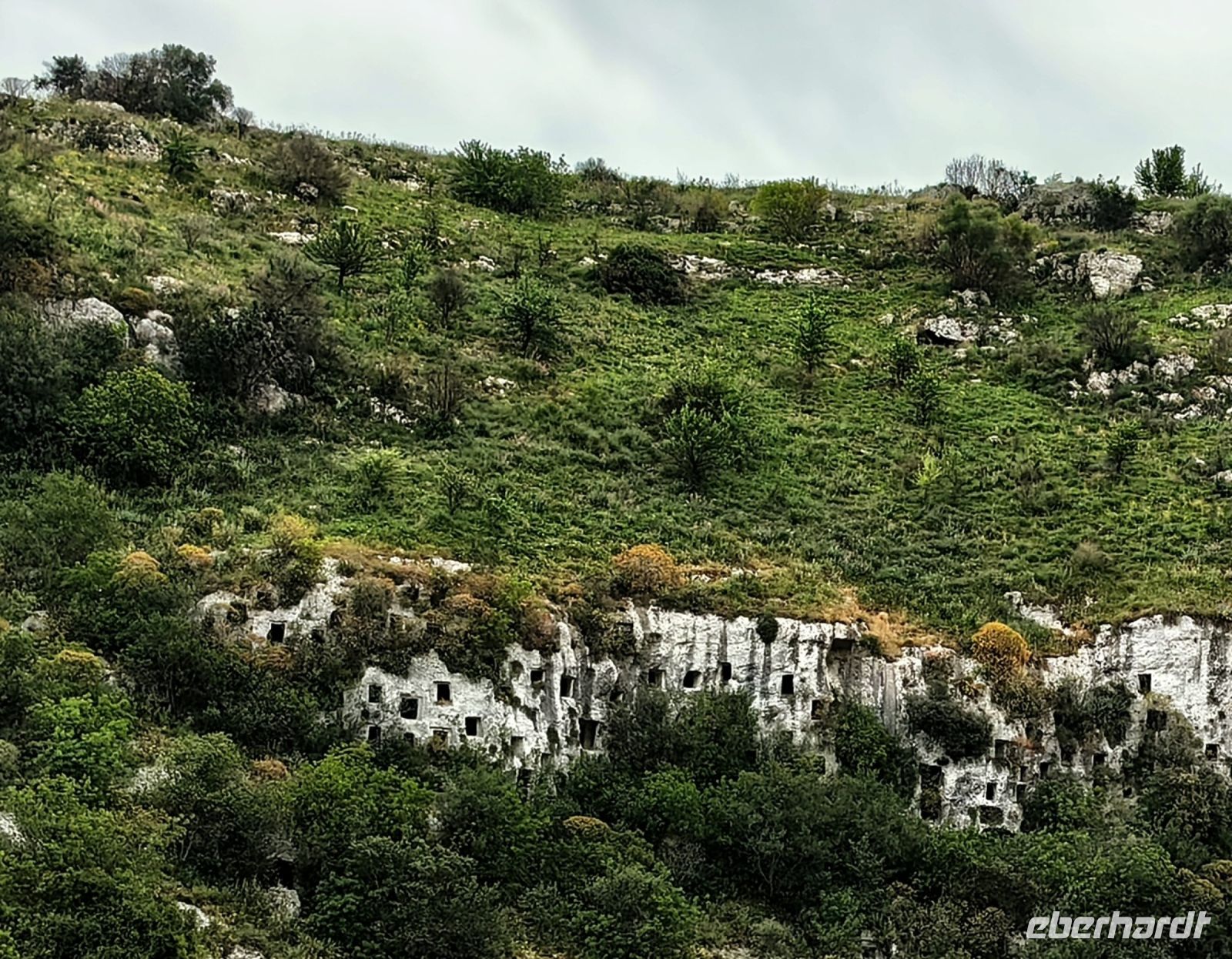 Nach etwa zwei Fahrstunden gen Südspitze der Insel erreichen wir das über 5.000 Hektar große Naturreservat Pantalica, eine Hochebene, welche seit 2005 zum UNESCO Weltkulturerbe gehört. In der ersten Hälfte des 13. vorchristlichen Jahrhunderts verschwanden mit der Ankunft der Sikuler und anderer italischer Volksstämme auf Sizilien alle bis dahin existierenden Küstensiedlungen. Die eingeborene Bevölkerung verließ das Meeresufer und suchte in den unwegsamen Berggegenden Zuflucht, wo sie sich besser verteidigen konnte und wo sie sich in großen Gruppen zusammenschloß. In dieser Zeit entstanden über 5.000 Höhlengräber, die in den Fels gehauen wurden. Das Gebiet um die Nekropole war in griechischer Zeit nie ganz bewohnt, erst in den ersten Jahrhunderten des Mittelalters fand die von den Invasionen durch die Berber, die Piraten und Araber geplagte Bevölkerung in der Nekropole einen sicheren Zufluchtsort, der nahezu uneinnehmbar war. In der späteren byzantinischen Zeit waren die Höhlen noch bewohnt. Wir schauen uns in der spektakulären Anapo-Schlucht die Überreste dieser Felswohnungen und Gräber an.