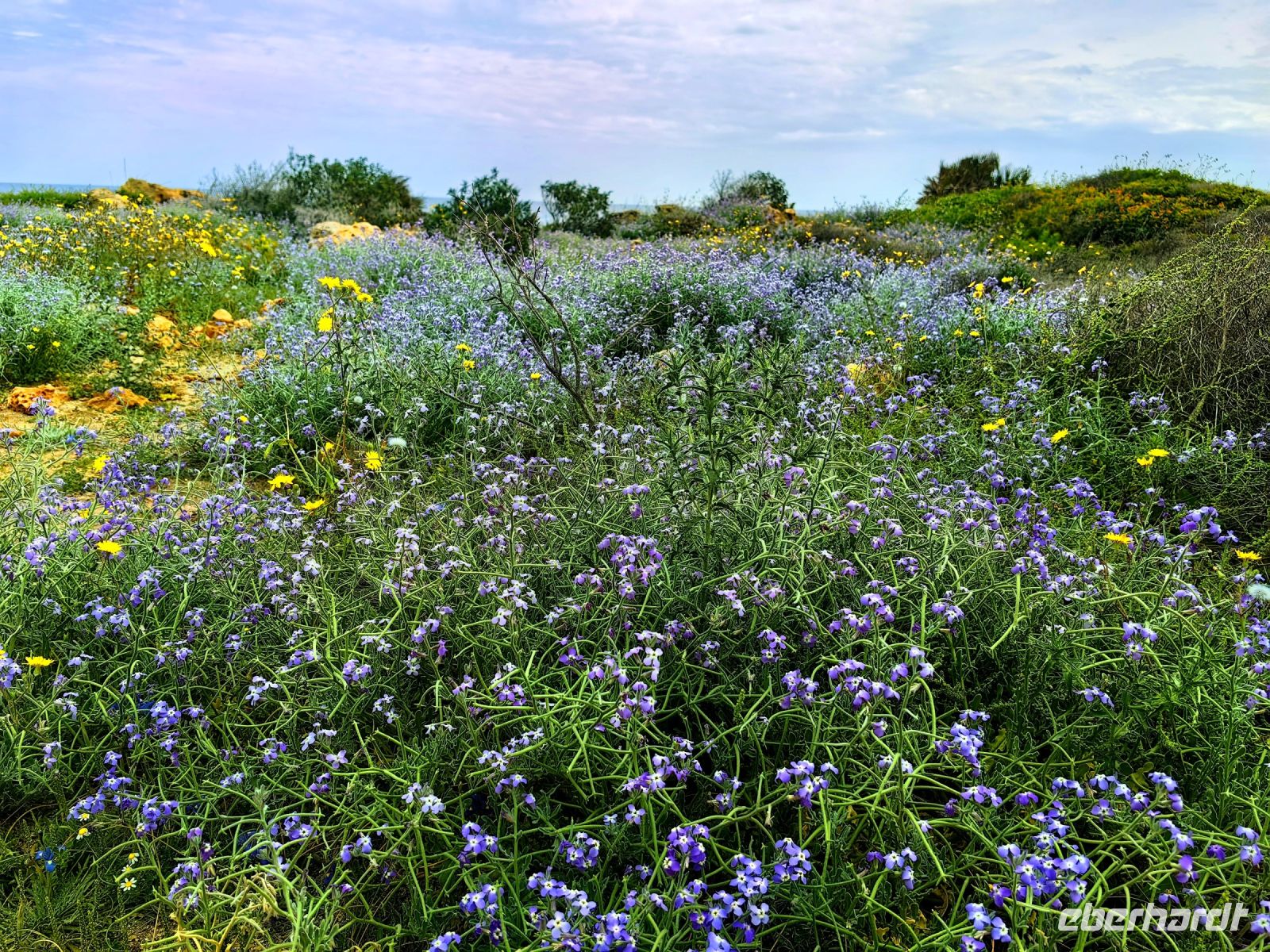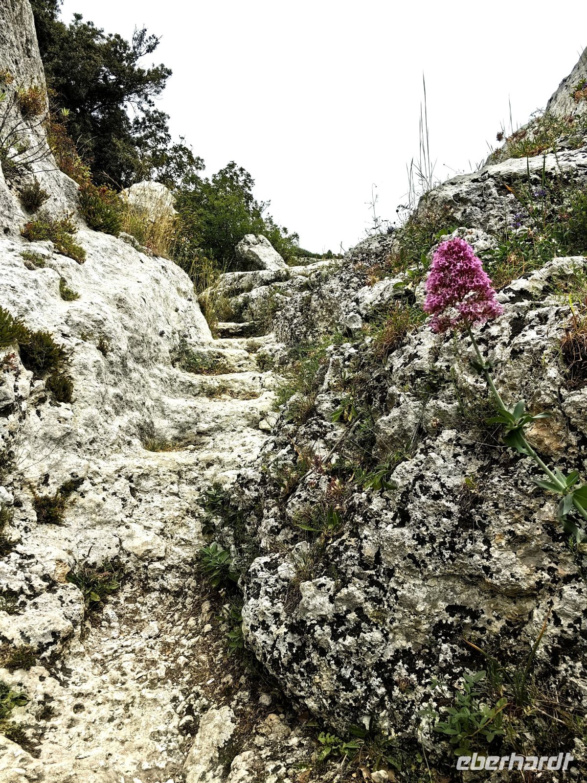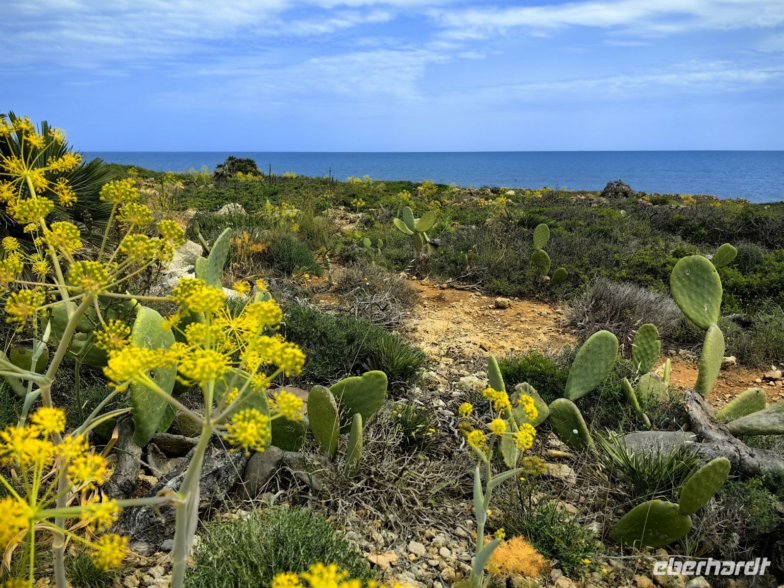 Wir laufen über Kalksteinfelsen, sehen Johannisbrotbäume, bunt blühende Wildblumen, die Eidechsen huschen vor uns eilig davon und es duftet nach Zitrusfrüchten.