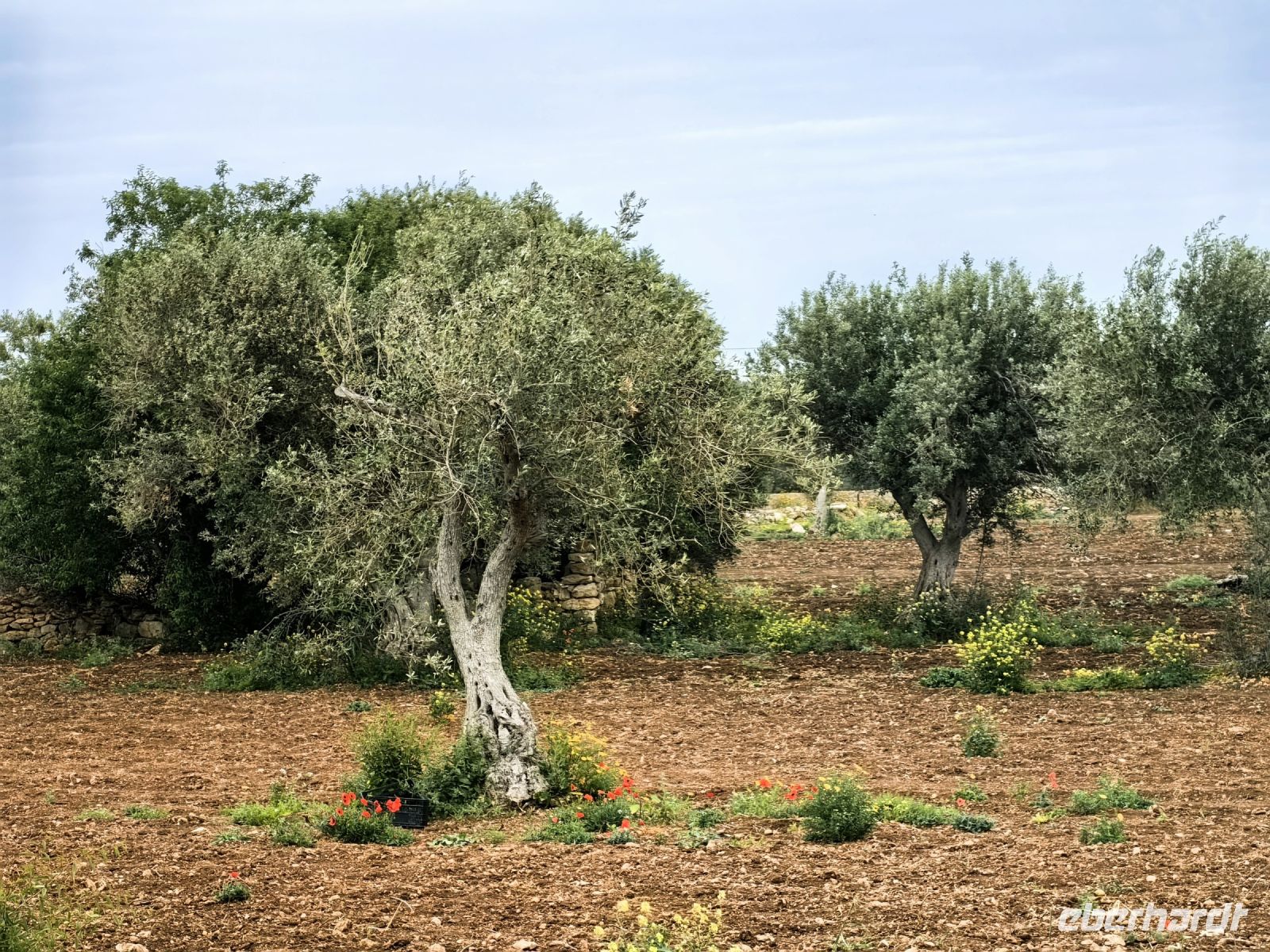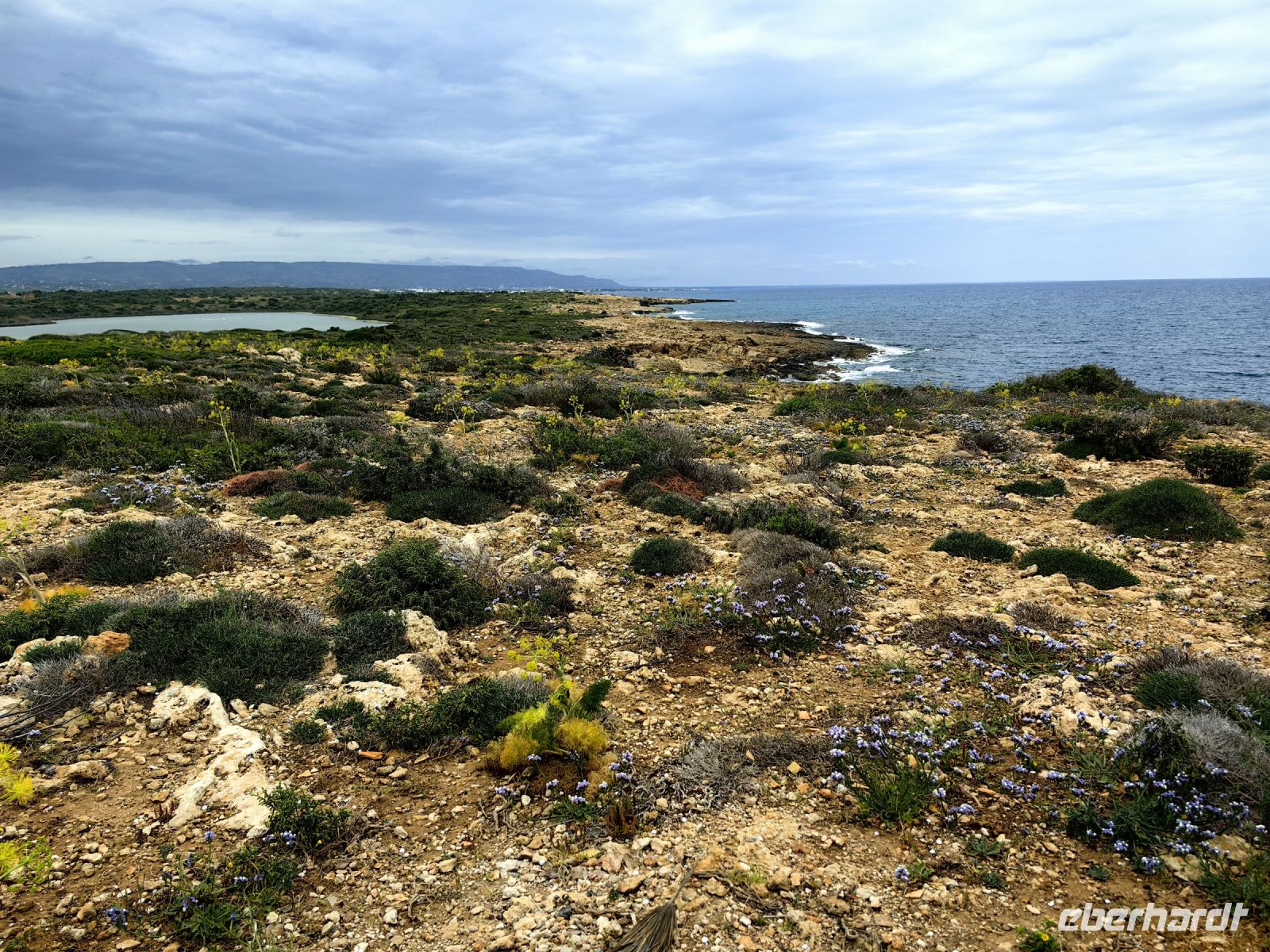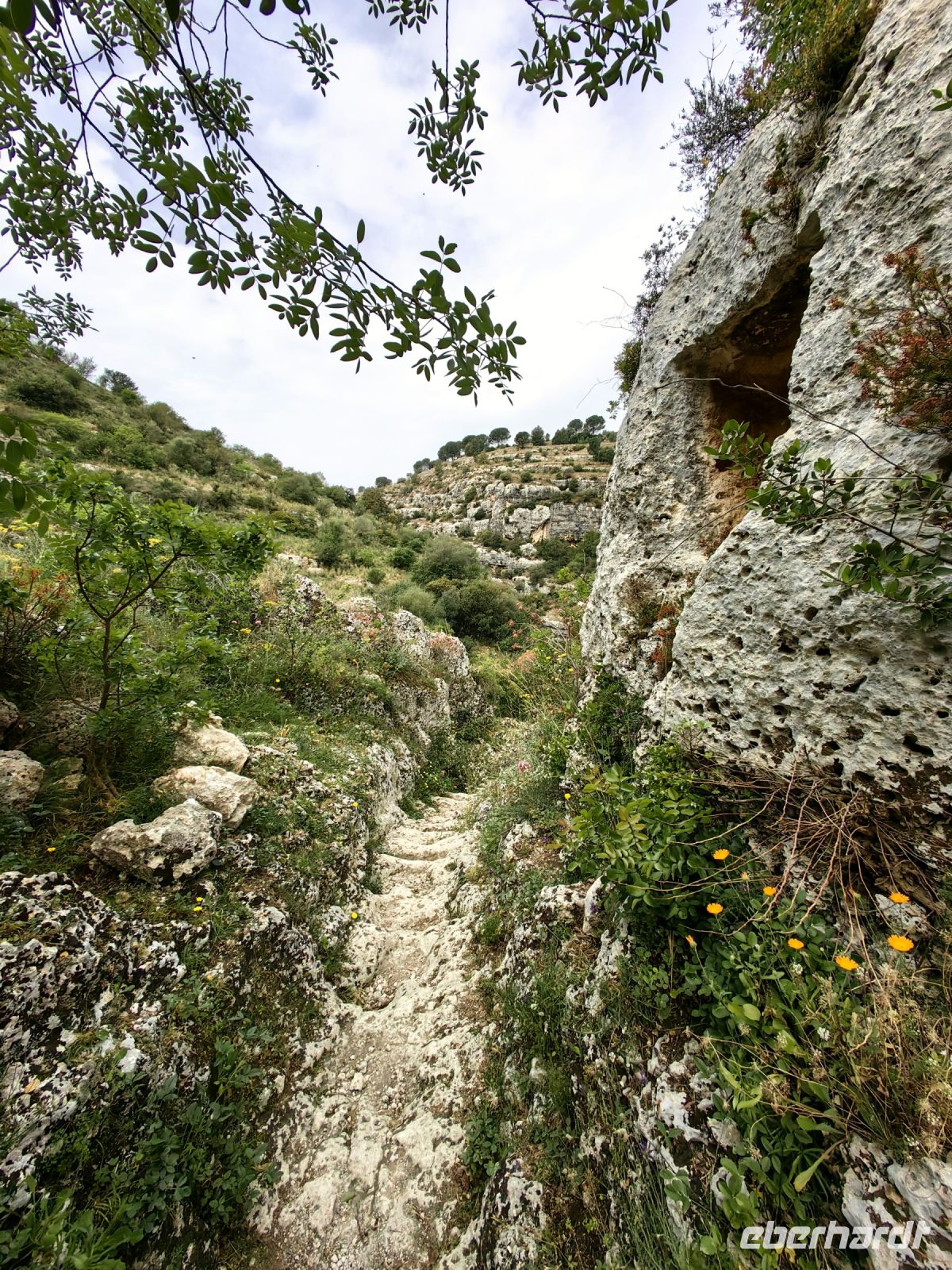 Wir laufen über Kalksteinfelsen, sehen Johannisbrotbäume, bunt blühende Wildblumen, die Eidechsen huschen vor uns eilig davon und es duftet nach Zitrusfrüchten.