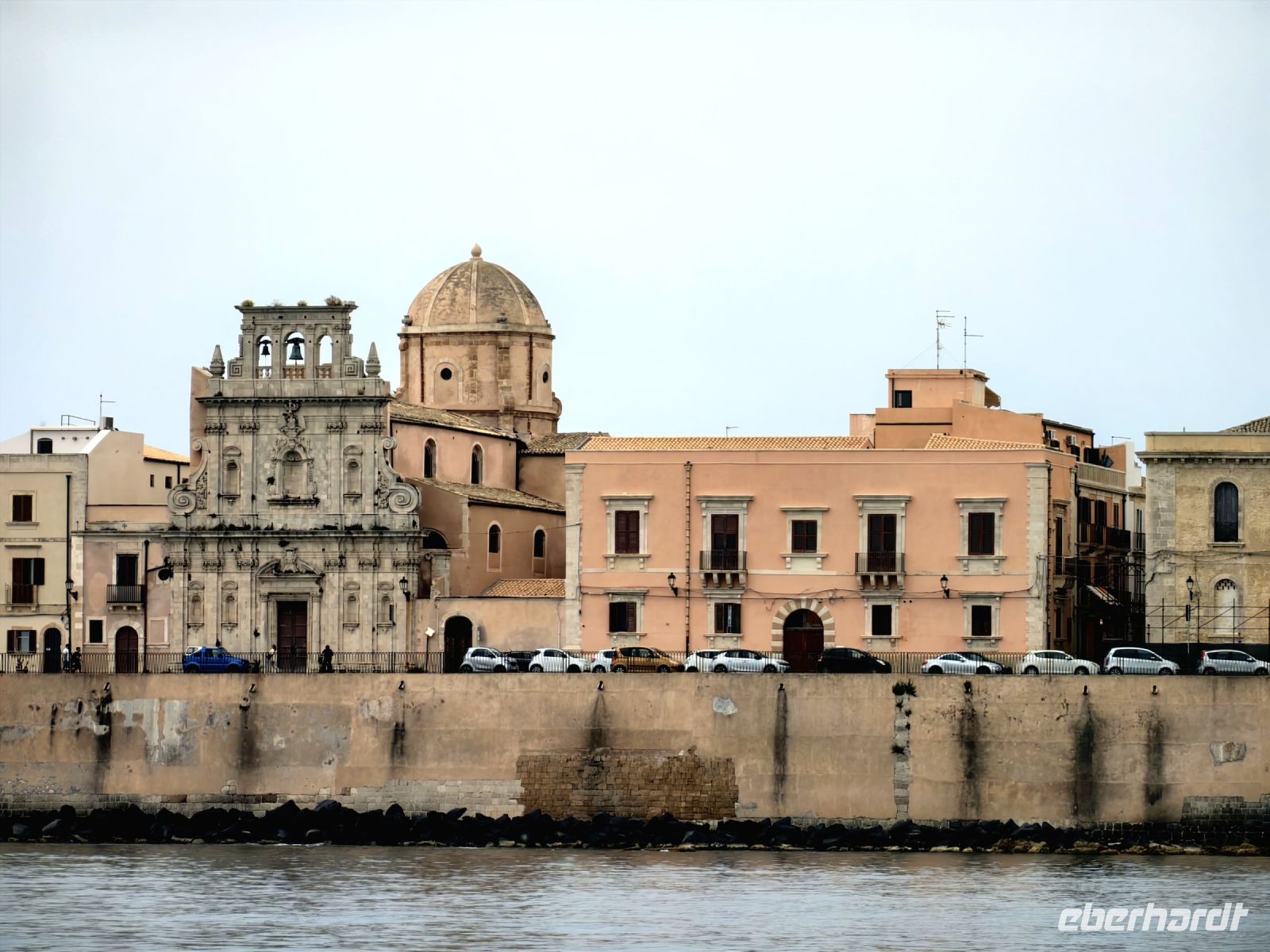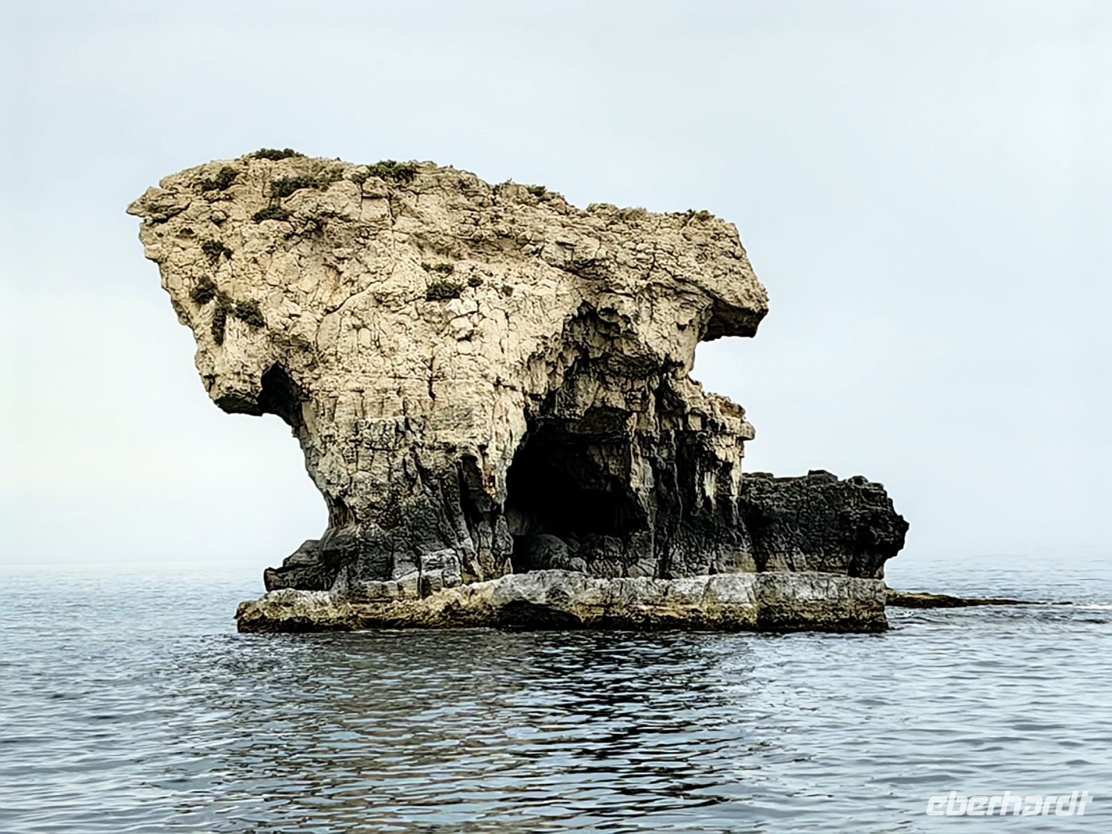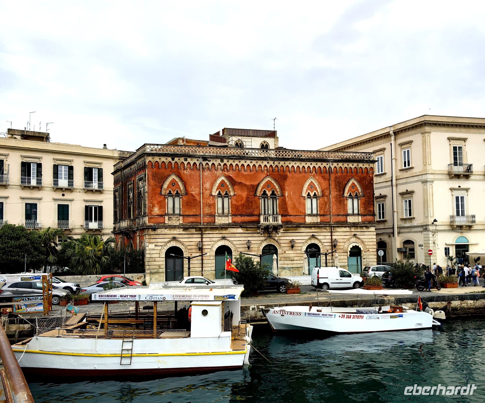 Nach dieser kurzen aber eindrucksvollen Wanderung fahren wir nach Syrakus mit seiner vorgelagerten Insel Ortygia. Am Tempel von Apollo, der im Jahre 570 vor Christus erbaut wurde, verweilen wir kurz, bevor wir uns in alle Richtungen der Altstadt verstreuen. Einige Gäste haben Hunger, andere Durst und einige auch Schaulust und Wissensdurst. Nach einer Stunde finden sich elf Gäste wieder zusammen, um eine Bootsfahrt an der Küste um die Stadt herum zu unternehmen. Obwohl die Sonne heute nicht scheint und das Licht trüb ist, genießen wir die Ausfahrt an den verschiedenen Grotten und Felsformationen entlang.