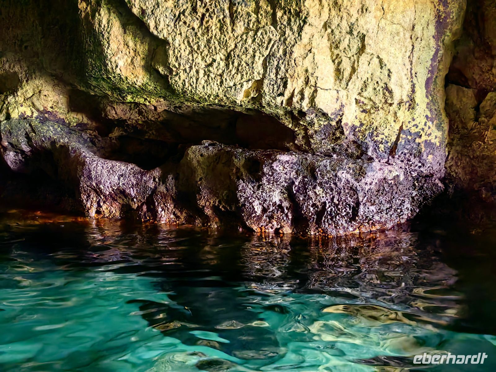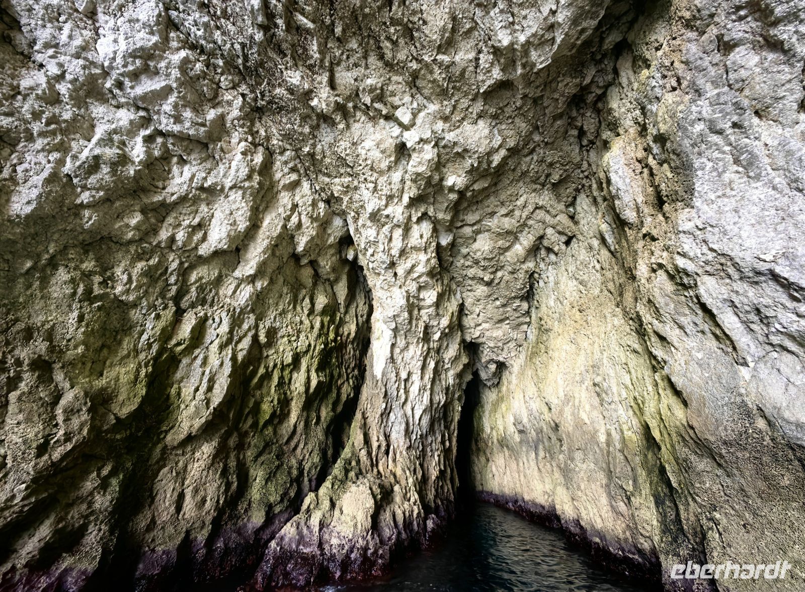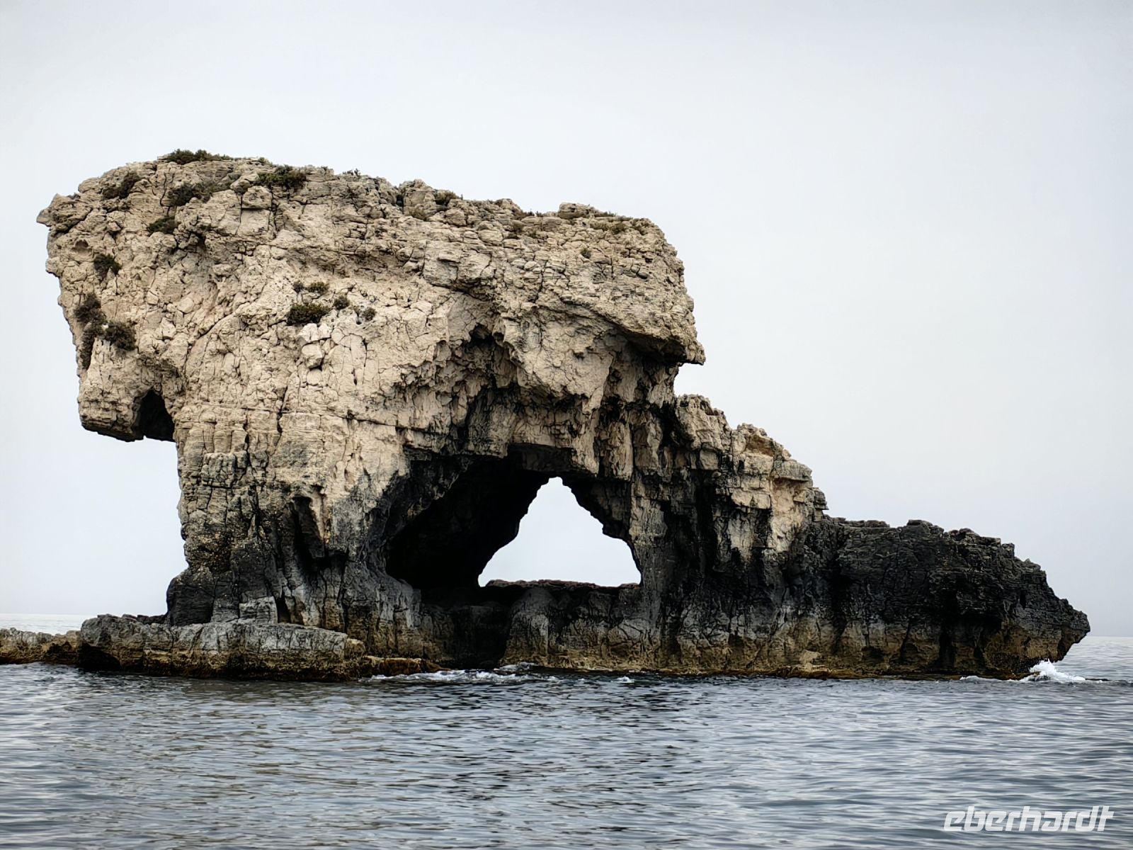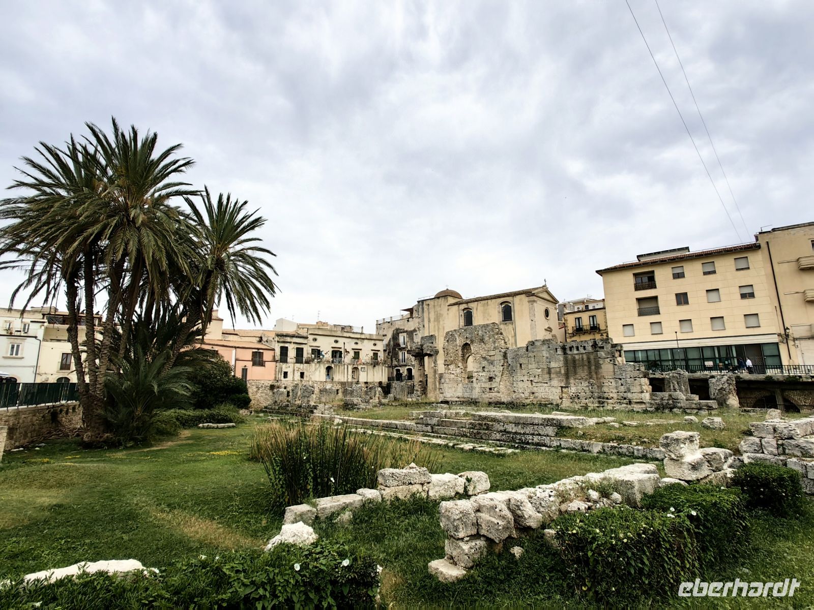 Nach dieser kurzen aber eindrucksvollen Wanderung fahren wir nach Syrakus mit seiner vorgelagerten Insel Ortygia. Am Tempel von Apollo, der im Jahre 570 vor Christus erbaut wurde, verweilen wir kurz, bevor wir uns in alle Richtungen der Altstadt verstreuen. Einige Gäste haben Hunger, andere Durst und einige auch Schaulust und Wissensdurst. Nach einer Stunde finden sich elf Gäste wieder zusammen, um eine Bootsfahrt an der Küste um die Stadt herum zu unternehmen. Obwohl die Sonne heute nicht scheint und das Licht trüb ist, genießen wir die Ausfahrt an den verschiedenen Grotten und Felsformationen entlang.