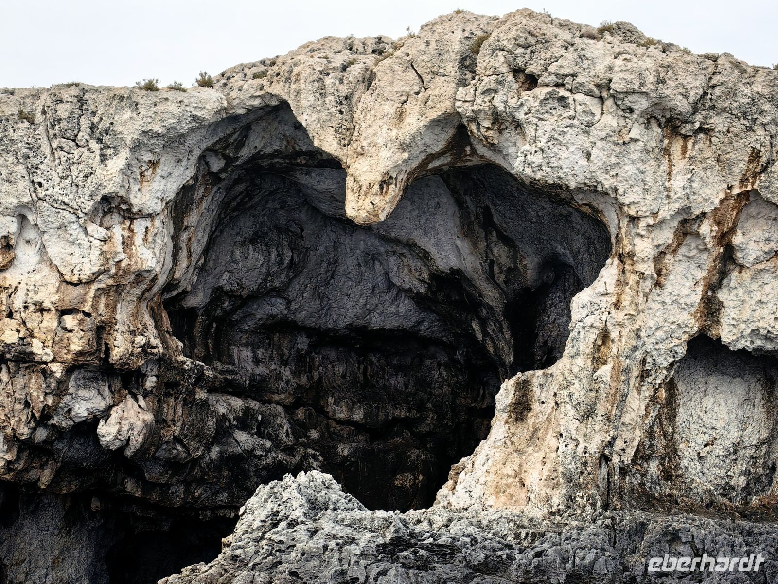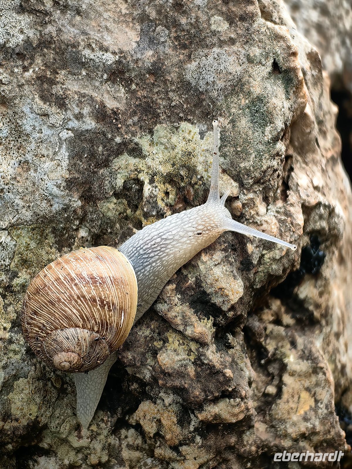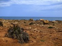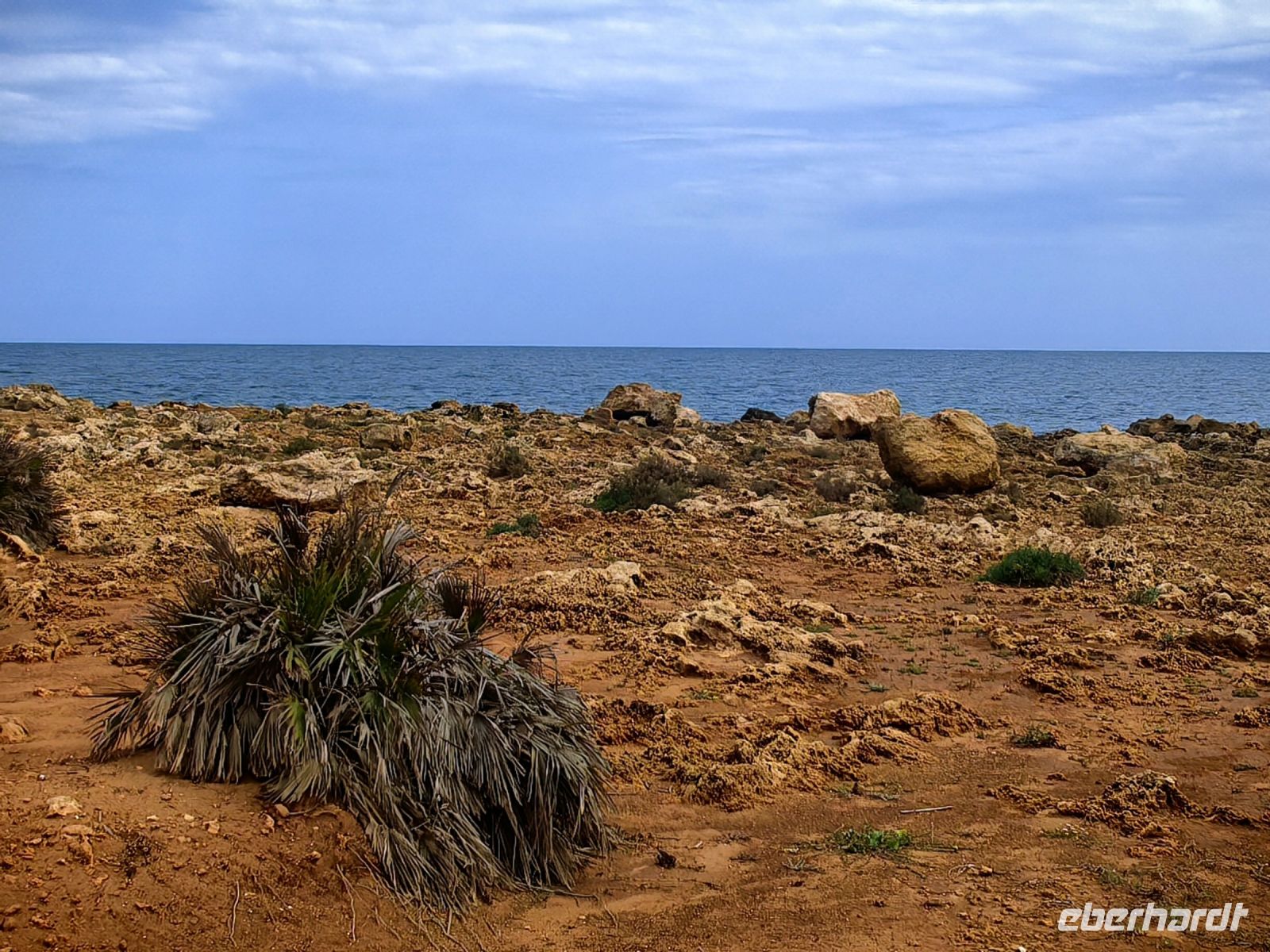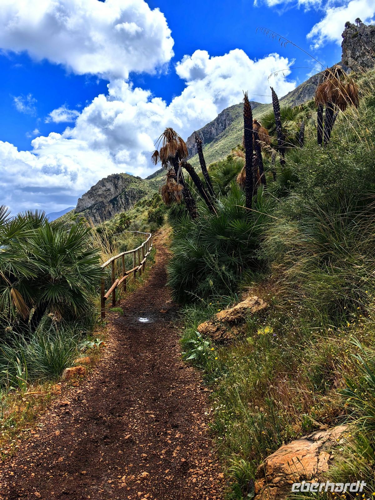 Nachdem wir den Eintritt gezahlt haben, kraxeln wir an der Küste entlang, der Weg ist steinig, aber spektakulär. Wir laufen auf und ab, bis wir die Uzzo-Grotte erreichen, die etwa 20 Meter hoch ist und früher als Unterschlupf oder Stallung der Ziegenhirten genutzt wurde. Weiter entlang schlängelt sich der Weg an schroffen Kalkfelsen und über vom Wasser ausgewaschen Rinnen. Die mediterrane Flora wird von Oliven- und Johannesbrotbäumen, endemischen Zwergpalmen (Chamaerops humilis) und Mannabäumen geprägt, aus denen ein Süßstoff hergestellt wird. Dazwischen blühen Mohnblumen, Disteln, wilde Kamille und nach den Regenschauern kommen überall Schnecken hervor. Im Reservat finden Falken, Geier und Adler ideale Lebensbedingung, leider läßt sich keiner dieser schönen Vögel am Himmel blicken.