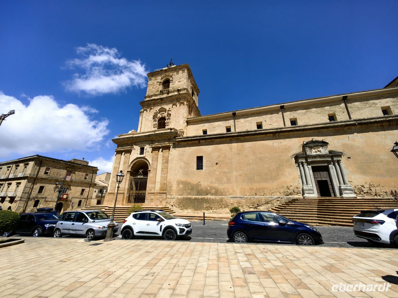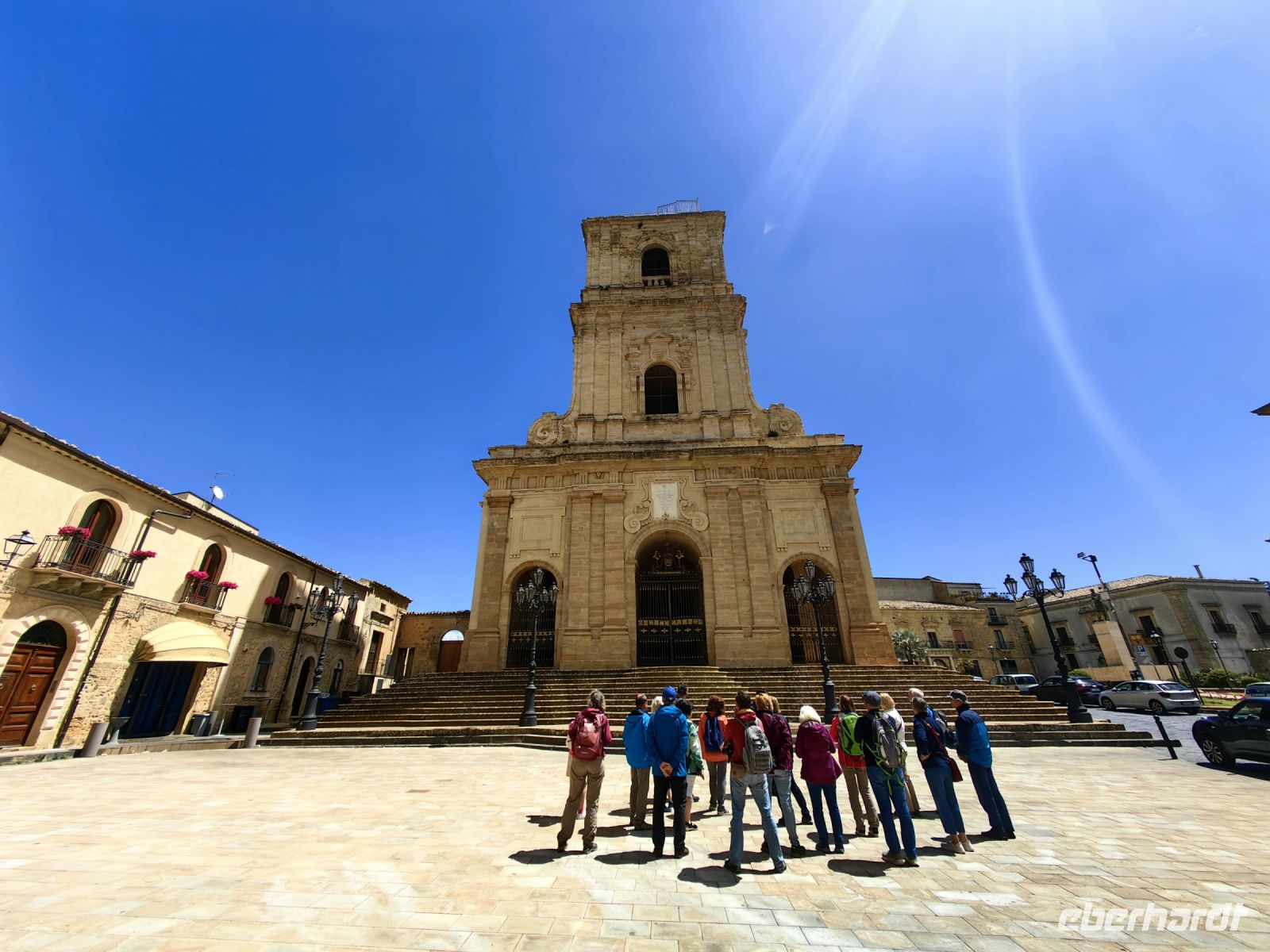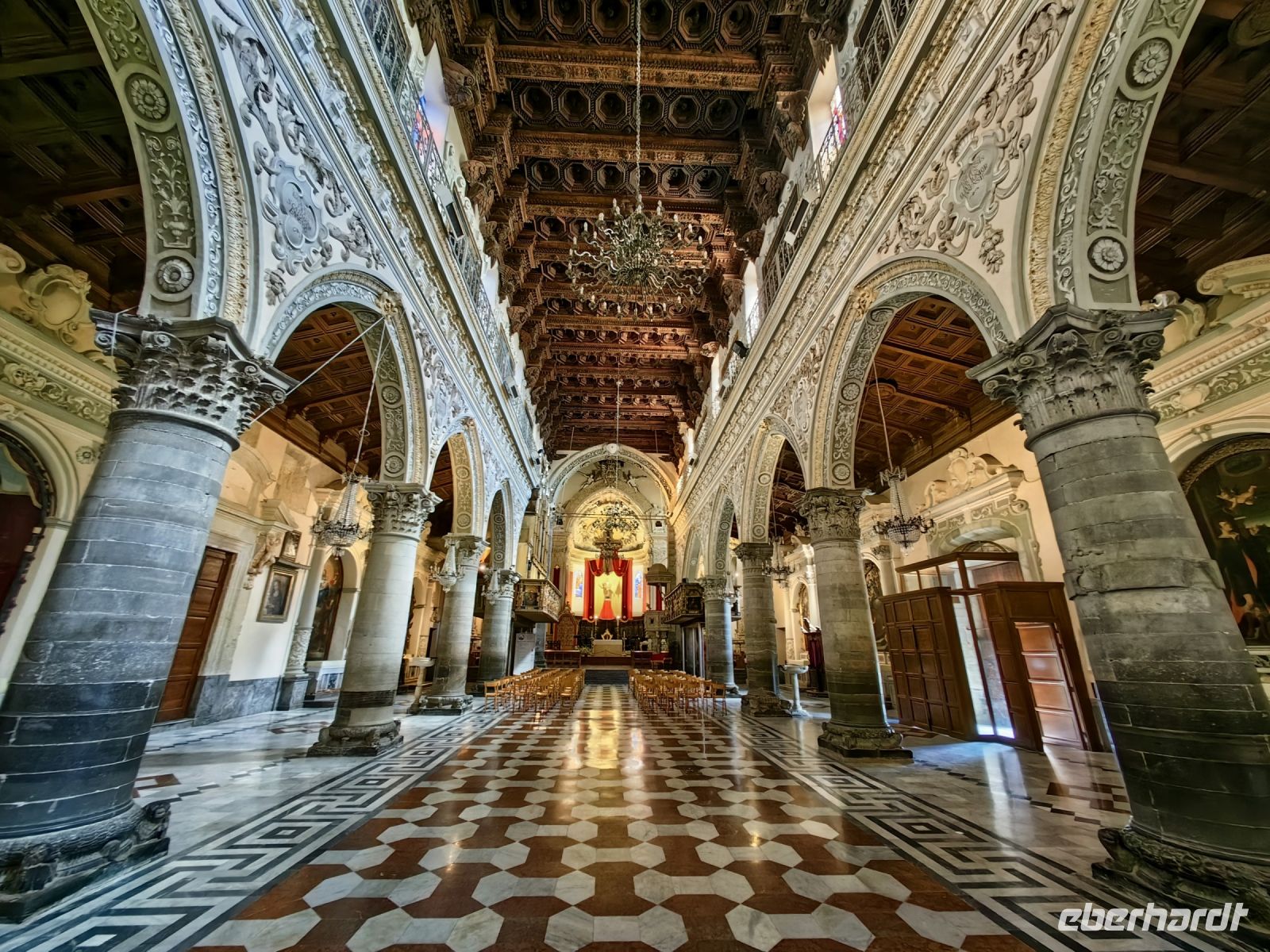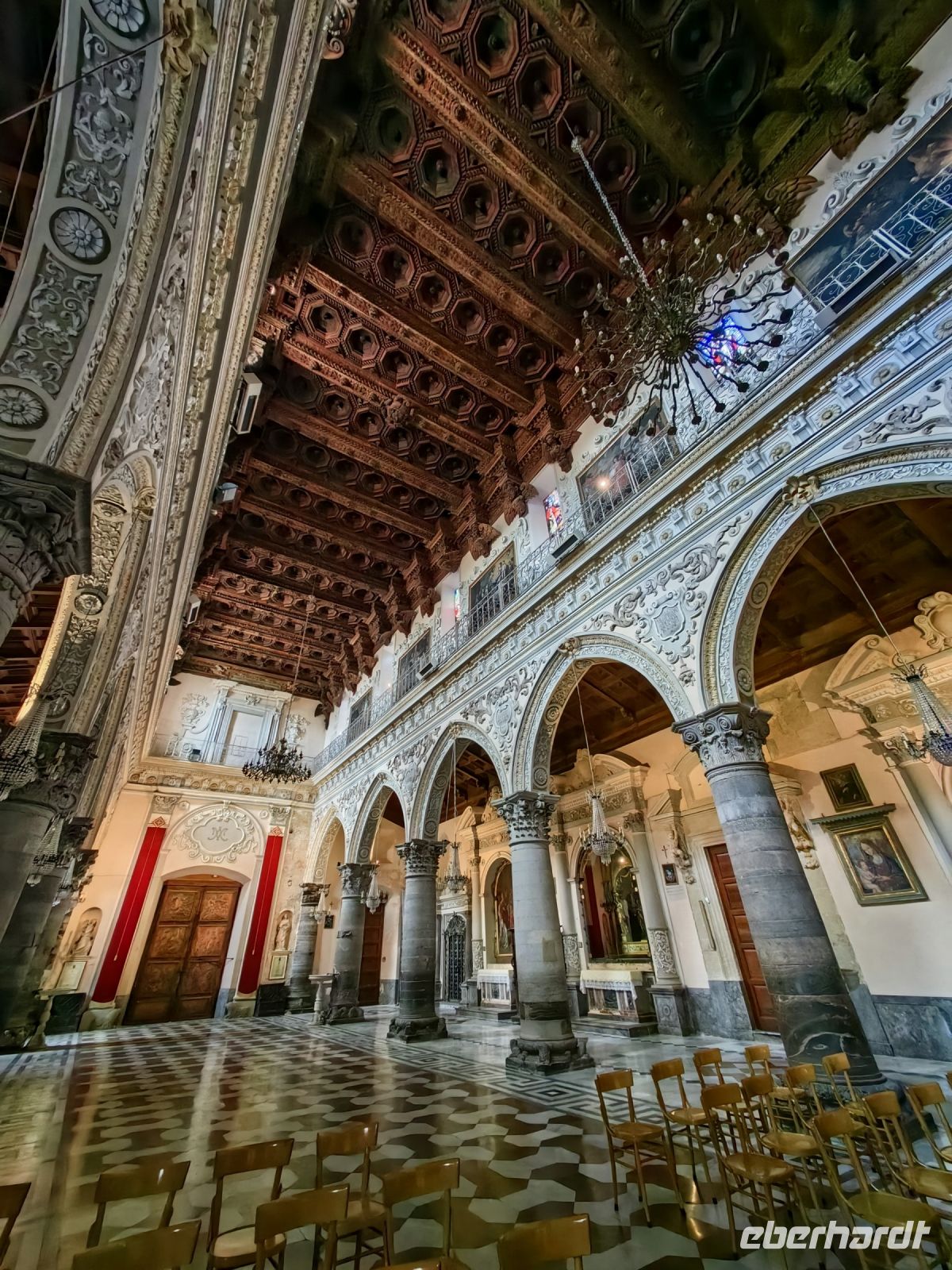 In der Oberstadt besuchen wir die imposante Kathedrale Maria Santissima della Visitazione. Die drei innen liegenden Schiffe werden vor allem durch die Holzkassettendecke geprägt und durch dicke Säulen aus schwarzem Basalt getrennt.