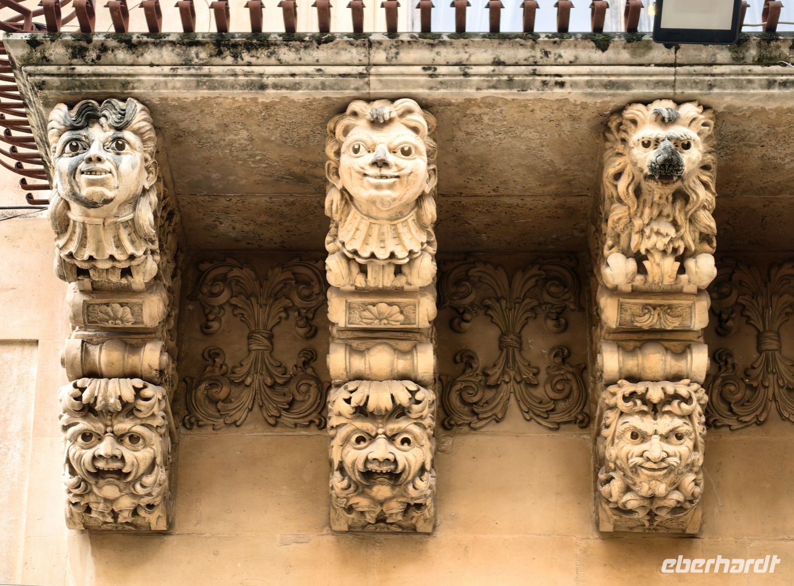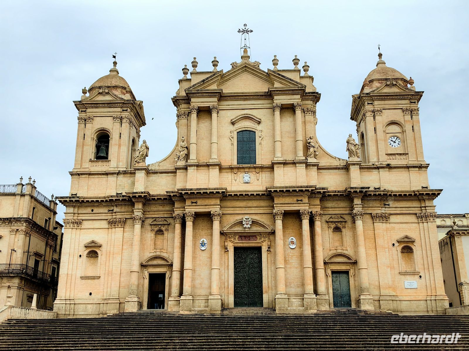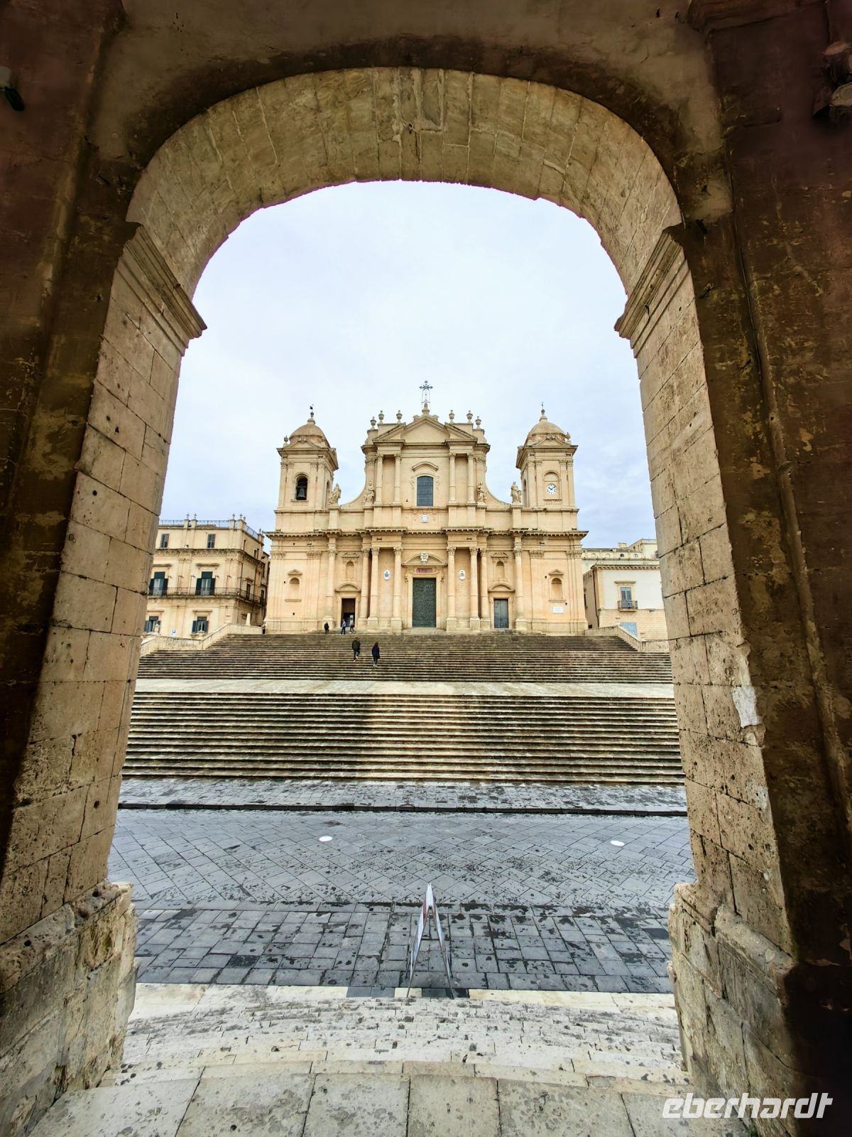 Noto ist noch ein echter Insidertip, eine ruhige, idyllische Kleinstadt mit vielen sehenswerten Gebäuden im Stil des Barock. Bevor die Stadt zum Weltkulturerbe avancierte, war sie weitestgehend unbekannt. Nachdem ein Erdbeben 1693 den Ort vollständig zerstört hatte, baute man die Stadt im wunderschönen sizilianischen Barockstil wieder auf. Durch das königliche Stadttor Porta Reale treten wir ein und besichtigen zuerst die Chiesa di San Francesco d´ Assisi all´ Immacolata. Innen ist diese Kirche recht schlicht für italienische Verhältnisse. Weiter laufen wir zur Kathedrale San Nicolo, dem zentralen Dom der Stadt. Zusammen mit dem gegenüber liegenden Palazoo Ducezio und den seitlichen hufeisenförmigen Baumdächern ergibt sich eine majestätische Harmonie. Nun biegen wir in die Hauptstraße, den Corso Vittorio Emanuele ab und bewundern die vielen barocken Details an Gebäuden und Balkonen.