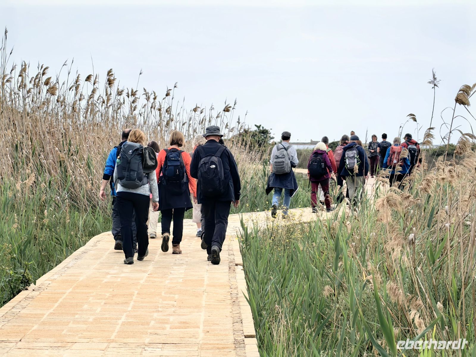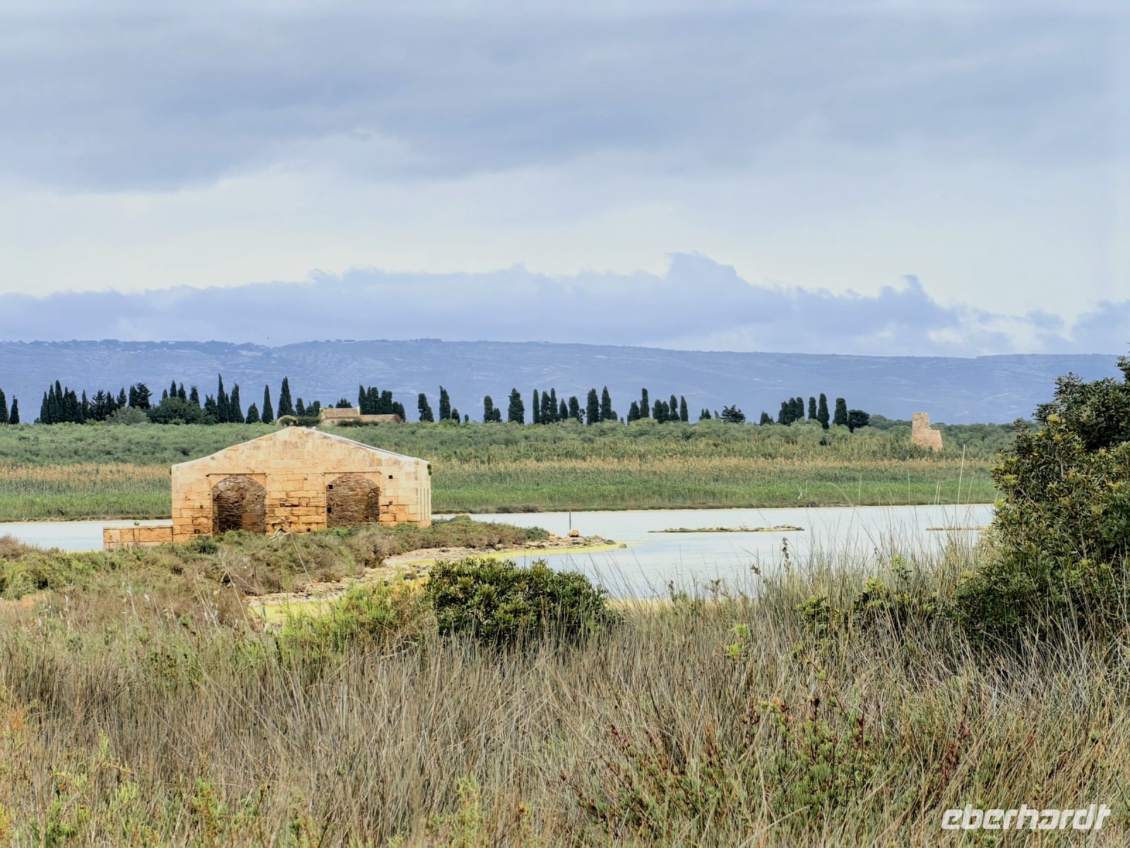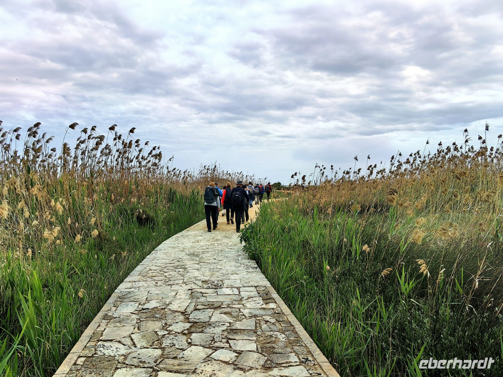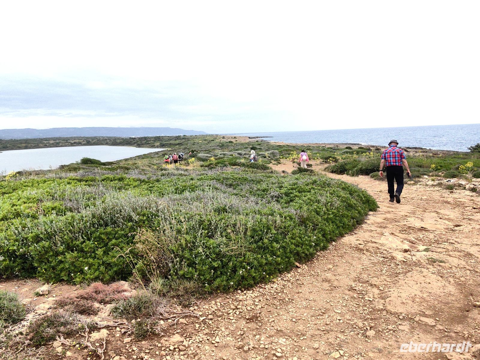 Nach der Stärkung erkunden wir den Küstenweg des insgesamt 1.500 Hektar großen Naturreservats. Die Vegetation rechts und links wird von Wacholder, wildem Thymian und Fenchel dominiert und die Bienen umschwirren die großen gelben Fenchelblüten. In den ausgedehnten Sumpfgebieten des Parks sehen wir Flamingos stehen. Etliche Zugvögel machen hier Zwischenstation auf ihren Wanderungen nach Afrika. Das Reservat ist einzigartig, da es biologisch unterschiedliche Biotope umfaßt: Fels- und Sandküste, Mittelmeer-Macchia, Moorgebiete, Salinen, Heidelandschaften und bebaute Felder. Da es heute weder auf noch ab geht, müssen wir nicht auf den Weg achten und können uns ganz der Umgebung, den Düften der Kräuter und den Tierbeobachtungen widmen.