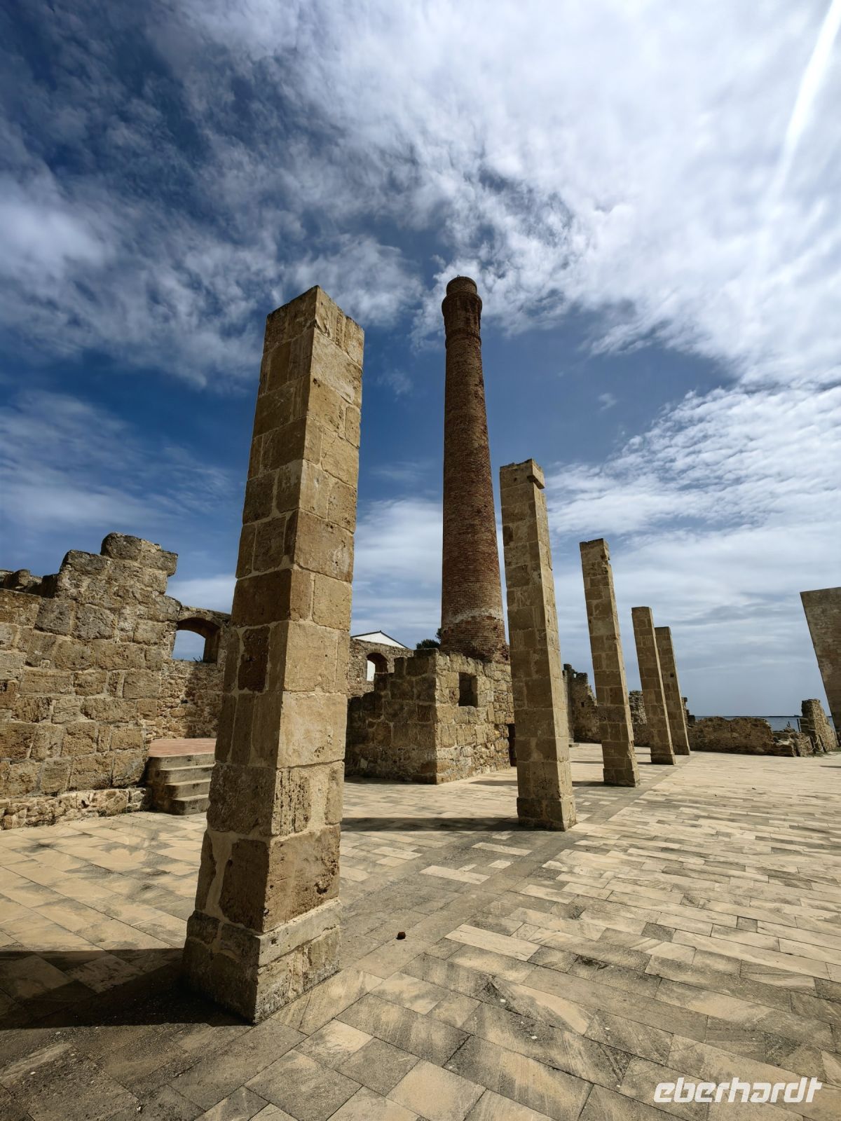Mittags hat es aufgehört zu regnen und wir brechen zum Naturschutzgebiet Vendicari auf. Dieser Küstenstreifen ist ein wahres Paradies für Naturliebhaber und besonders Vogelliebhaber kommen voll auf ihre Kosten. Vorbei an Clementinen-, Zitronen- und Olivenbäumen laufen wir zum Parkeingang und sehen sogleich die Tonnara di Vendicari oder auch Bajuto die einstige Thunfischfabrik, wo man diese riesigen Fische fing und gleich verarbeitete. Die Fische, die nahe genug ans Ufer kamen, wurden mit Hilfe von Netzen so geleitet, daß sie praktisch bis in das Todesbecken hineingeleitet wurden. Der Thunfischfang hat in dieser Region eine lange vorchristliche Tradition, bereits die Phönizier wußten das delikate Filet zu schätzen und die Araber vervollkommneten die Fangmethode. Die Kulisse dieser Fabrikruine ist so einzigartig, daß wir uns entschließen, hier zu picknicken.