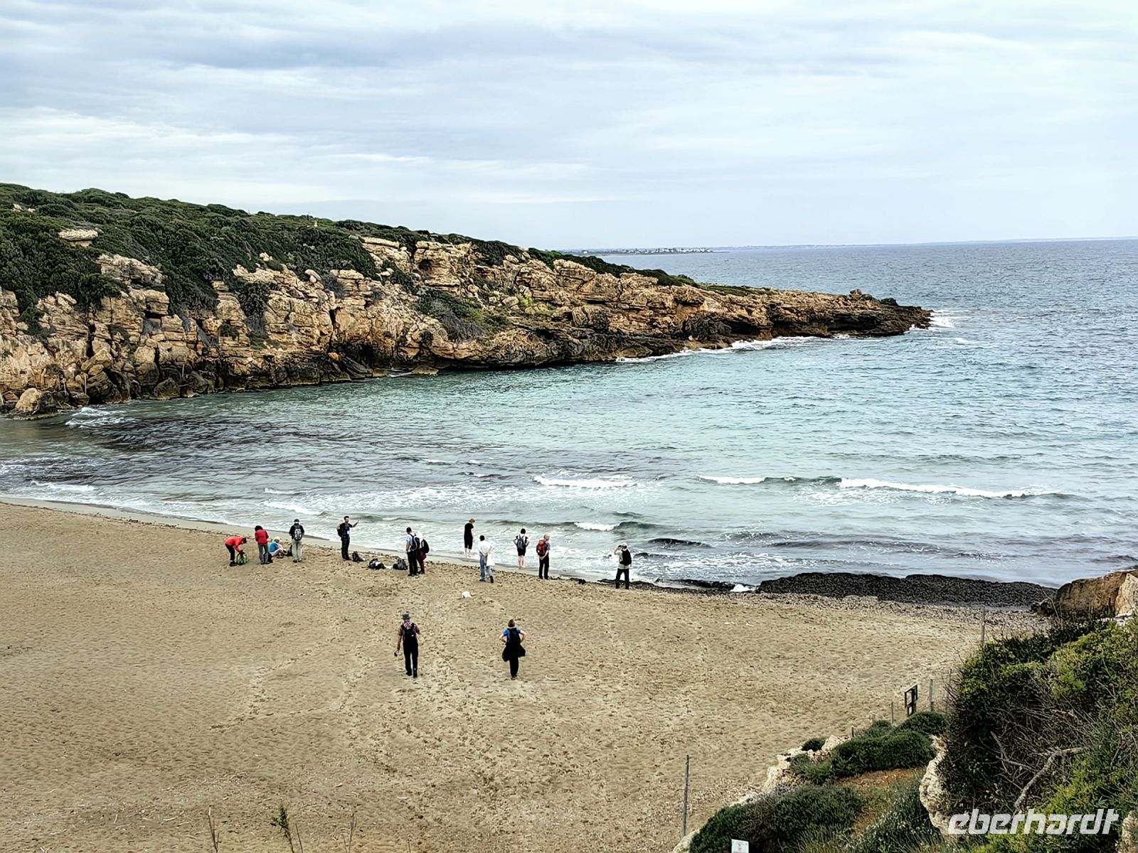 Als wir einen Strand erreichen, trauen sich sogar zwei Gäste in die noch kalten Fluten, die anderen strecken sich oder halten die Füße ins Wasser, bevor wir wieder zurück zum Ausgang laufen.