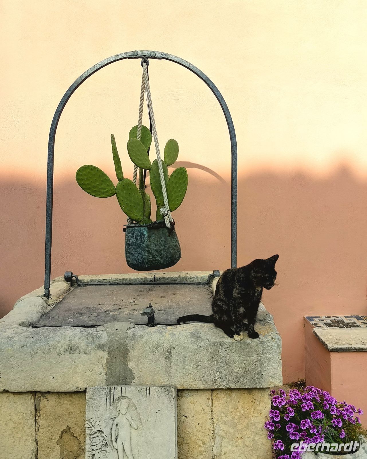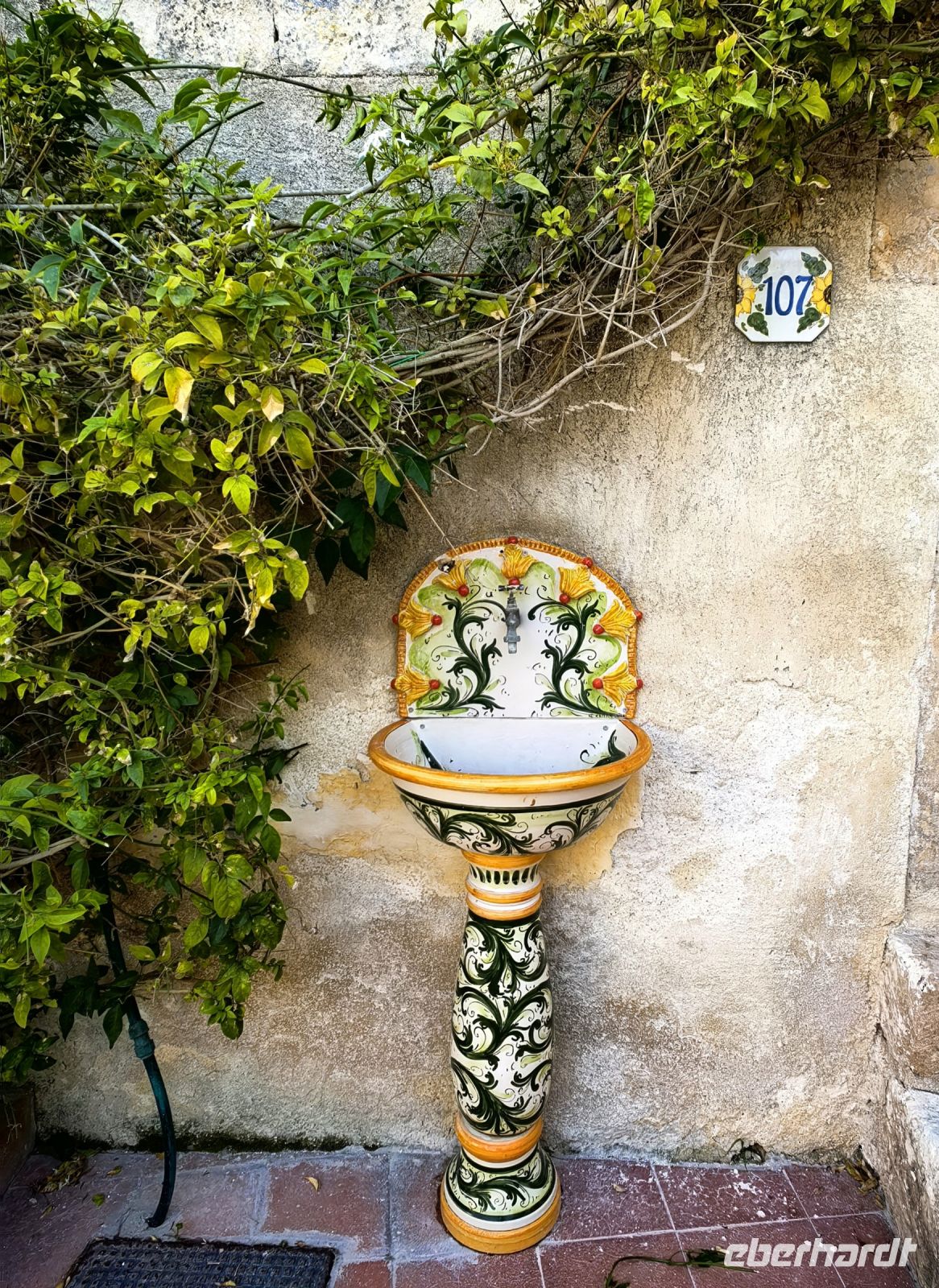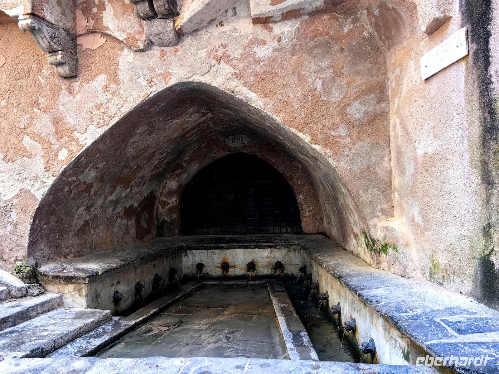 Durch enge Gassen in denen, ganz wie es das Klischee will, die Wäsche zum Trocknen draußen weht, zwängen wir uns zu einer mittelalterlichen Waschstelle hindurch. Hier traf man sich, plauderte und nebenher wusch man seine Kleidung. Noch heute sprudelt aus kleinen Löwenköpfen das Wasser und im Hochsommer ist dieses schattige Plätzchen bei den Einheimischen begehrt.