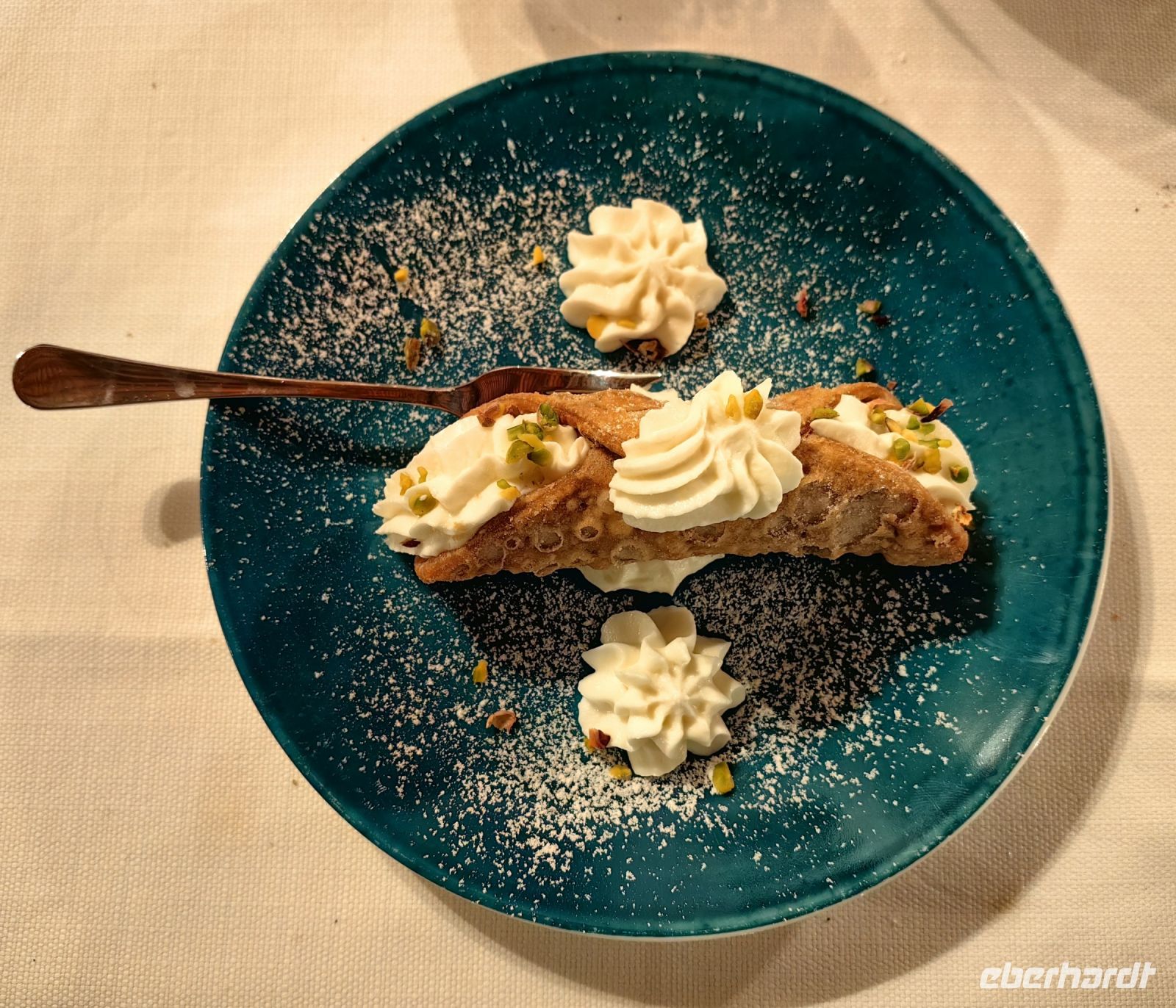 In unserer Freizeit probieren einige Gäste typische sizilianische Cannoli und Cassatine, zwei Süßigkeiten, die aus den Mandeln der Umgebung hergestellt werden.