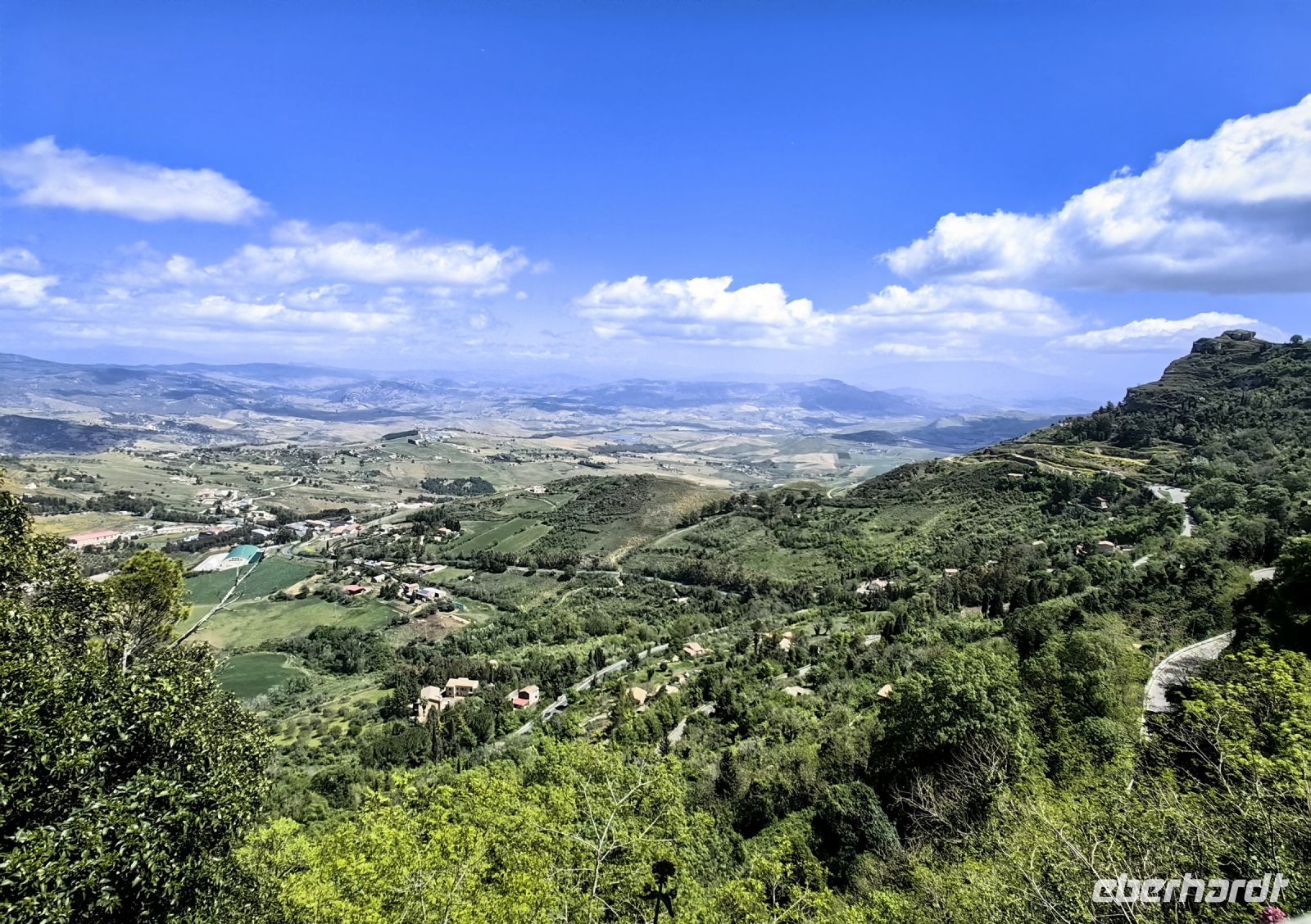 Zur Mittagszeit erreichen wir Enna, wo wir zuerst den sagenhaften Rundblick genießen, sind wir doch hier auf dem Dach Siziliens, der höchstgelegenen Stadt der Insel. In luftiger Höhe von 931 Metern auf dem Monte Giuliano siedelten bereits in prähistorischer Zeit die Sikaner und Sikeler. Die Griechen, die Sizilien seit dem 7. Jahrhundert vor Christus entdeckt hatten, fanden die strategische Berglage und den fruchtbaren Boden äußerst attraktiv. Aber auch für die folgenden Stämme der Karthager und anschließend die Römer war Enna begehrenswert. Die Römer gingen als Sieger aus den Punischen Kriegen hervor und versklavten die dort lebenden griechischen Bauern. Die Unterdrückung dieser Sklaven war so groß, daß sich diese im Jahr 139 vor Christus wehrten und den ersten Sklavenaufstand unter Eumus organisierten. Nach dem Zerfall des römischen Reiches übernahmen die Byzantiner und danach die Araber 859 die Macht über Enna und brachten neue Pflanzen mit: Orangen-, Zitronen- und Mandarinenbäume, Melonen, Zuckerrohr und Reis. Ihre Einflüsse auf die Baukultur sind heute noch im Stadtbild präsent. Unter der normannischen Herrschaft ab 1088 erlebt ganz Sizilien und insbesondere Enna eine Zeit der wirtschaftlichen Blüte. Das Geheimnis bestand im friedlichen Zusammenleben der Kulturen, die sich in ihrer Vielfalt und ihrem Wissen gegenseitig bereicherten. 1202 wurde der berühmte Mittelalterkaiser Friedrich der II., Enkel Barbarossas, König von Sizilien. Er hinterließ den Torre Federico II und das Castello di Lombardia, welches hoch oben auf dem Felsen thront. Leider ist es, als wir ankommen, von Bauzäunen umringt, es wird gerade ein neuer Parkplatz errichtet und wir können nur ein paar Blicke durch den Bauzaun werfen.