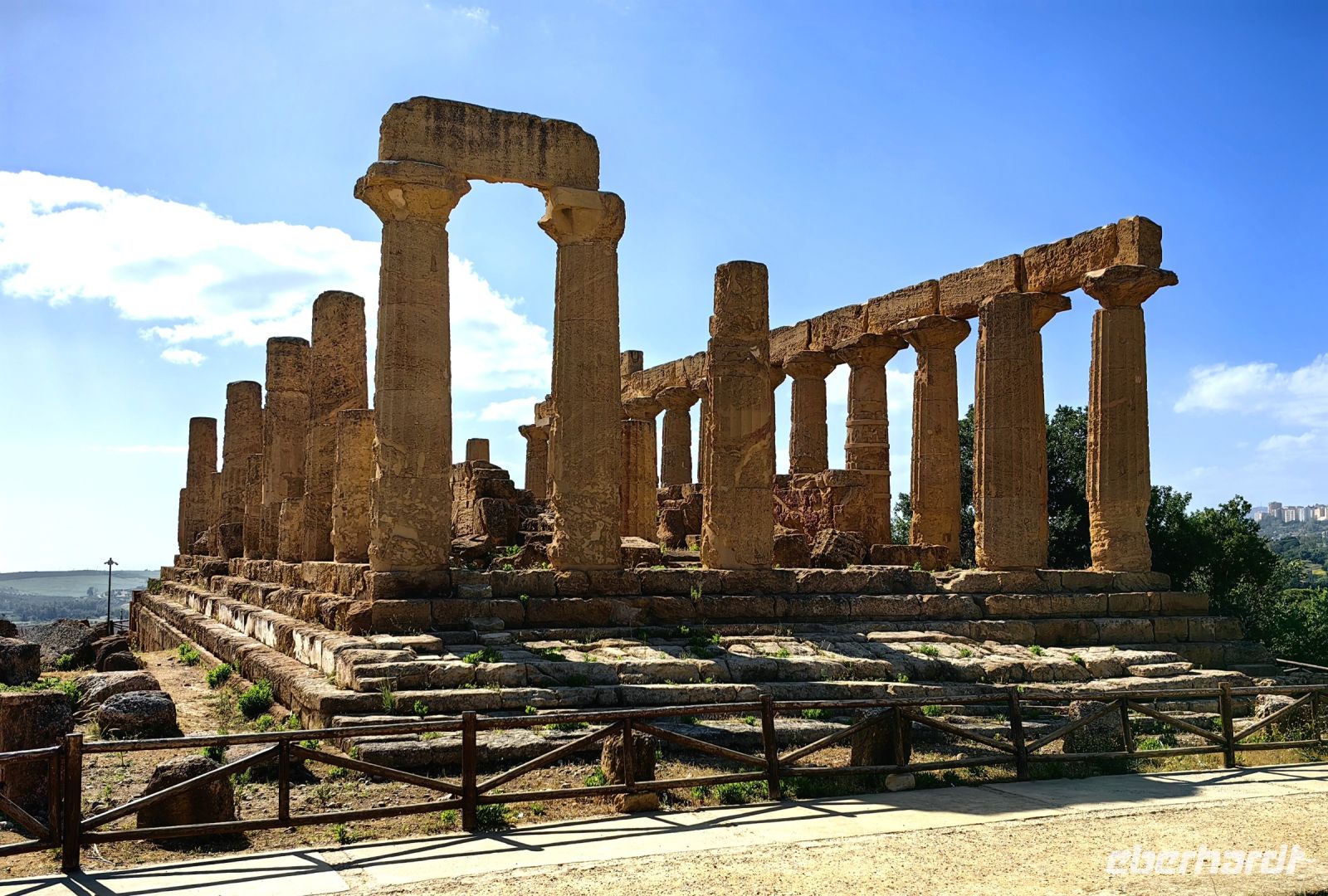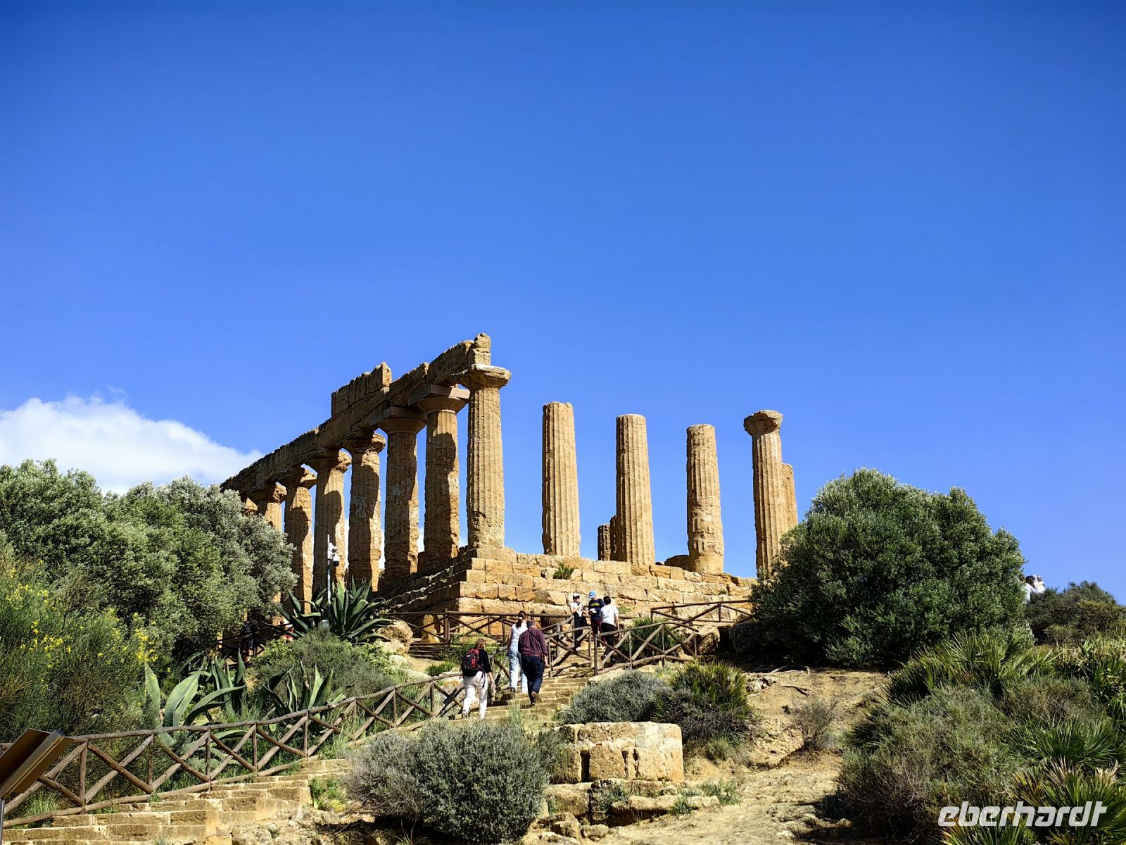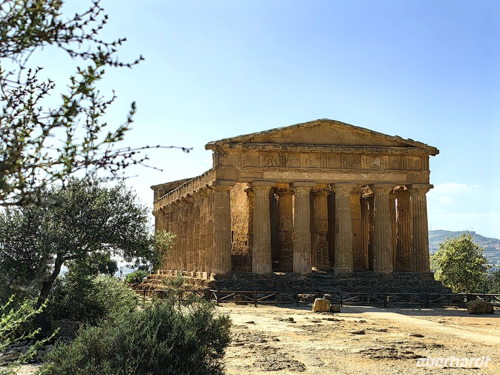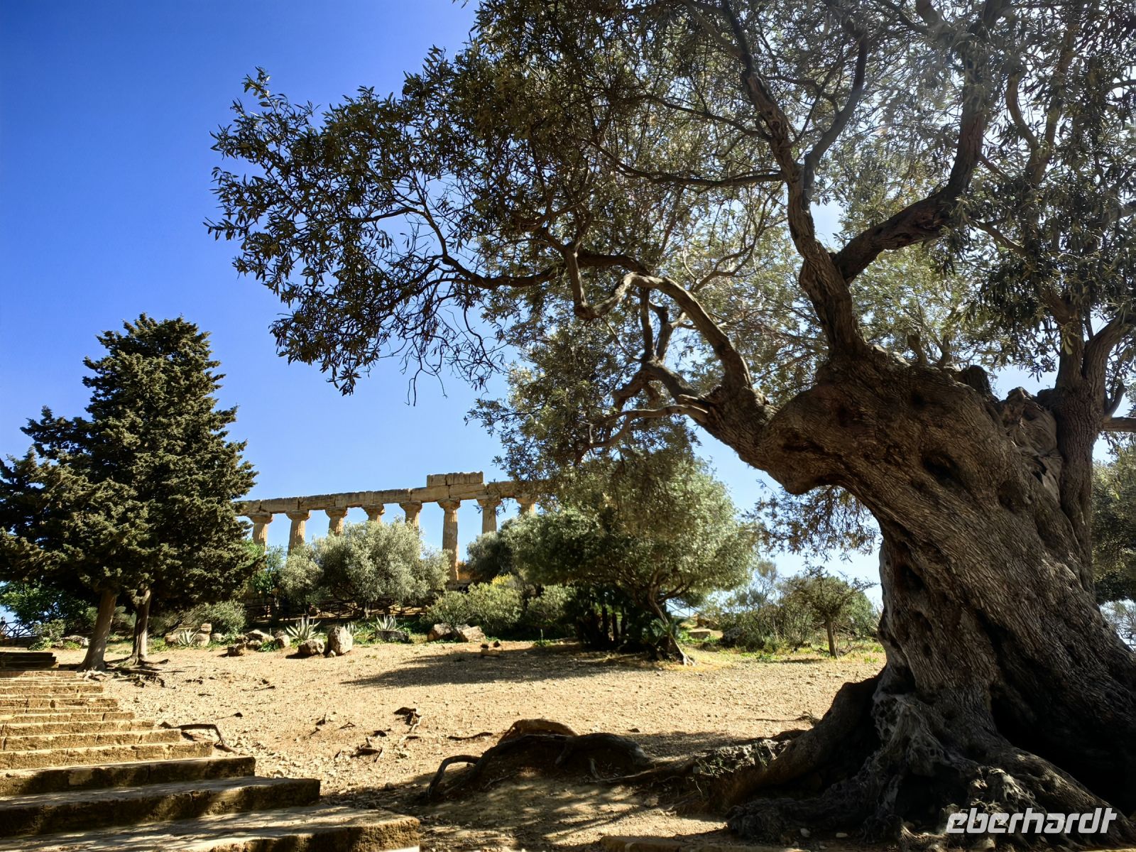 Am Nachmittag erreichen wir die archäologische Stätte von Agrigent oder griechisch Akragas, die zum UNESCO Weltkulturerbe gehört. Zwischen dem 8. und dem 5. Jahrhundert vor Christus wurden an den Küsten Süditaliens von griechischen Siedlern zahlreiche Kolonien gegründet, die schnell zu Macht und Einfluß gelangten, bis sie im 3. Jahrhundert vor Christus von den Römern erobert wurden und an Macht und Reichtum verloren. Im Gegensatz zu anderen griechischen Kolonien wurde Agrigent erst spät, nämlich im Jahre 581 vor Christus von Siedlern aus Kreta und Rhodos gegründet. Durch seine strategisch gute Lage, die den Handel mit dem reichen Karthago begünstigte und durch seine ausgedehnte landwirtschaftliche Nutzfläche im Hinterland brachte es das griechische Akragas schnell zu Reichtum und war nach Syrakus für einige Jahrhunderte die zweitgrößte Stadt Siziliens. Im Jahre 210 vor Christus wurde Akragas von den Römern erobert, die es fortan Agrigentum nannten. Als 829 nach Christus die Araber nach Agrigentum kamen, war von der reichen antiken Stadt nur noch ein unbedeutendes Dorf geblieben. Heute können wir nur erahnen, wie mächtig und eindrucksvoll die Tempel in der Antike gewirkt haben müssen. Die gesamte Anlage besteht aus einer Reihe von dorischen Tempeln, die im 5. Jahrhundert vor Christus errichtet wurden und die Macht und den Reichtum der damaligen griechischen Kolonie widerspiegelten. Der wichtigste von ihnen ist der Concordiatempel. Im antiken Garten von Bonamorone flanieren wir zwischen Rosmarin- und Lavendelhecken entlang und sehen zum ersten Mal in Sizilien Granatapfelbäume.