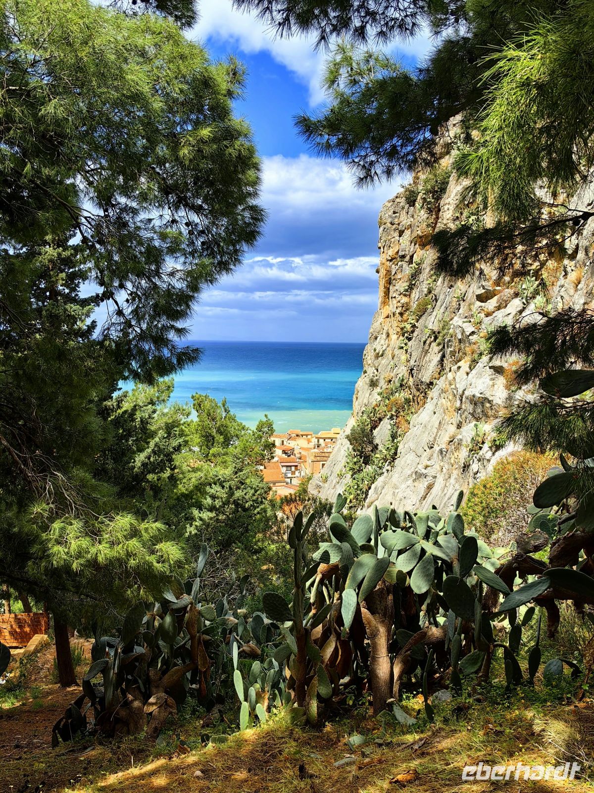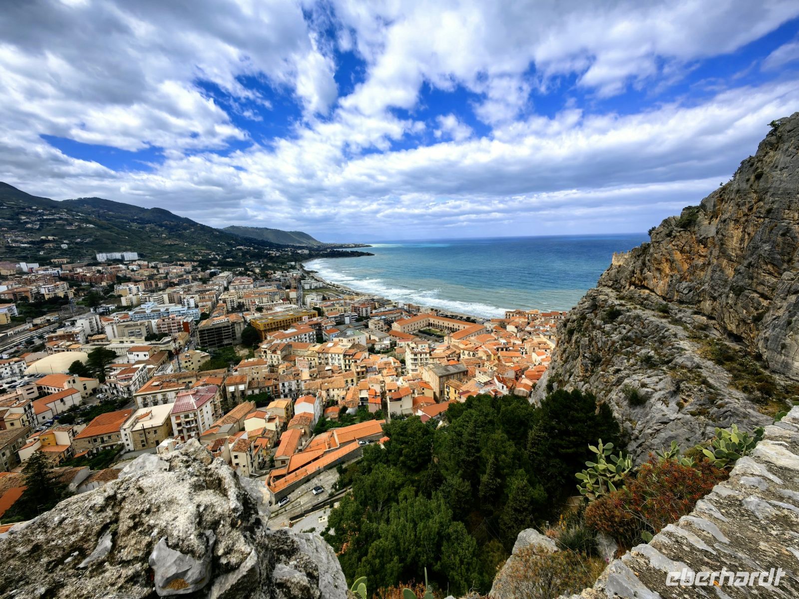 Obwohl der Hausberg von Cefalu nur 268 Meter über dem Meer herausragt, kommen wir ganz schön ins Schwitzen. Ein Teil des Felsens ist durch zinnenbewehrte Mauern aus dem Mittelalter überbaut worden, die im 15. Jahrhundert fertig gestellt wurden. Auf dem Gipfel sehen wir die Reste einer mittelalterlichen Burg aus dem 12. bis 14. Jahrhundert und der Blick zwischen den Burgzinnen hindurch ist atemberaubend. Wir pausieren und genießen.