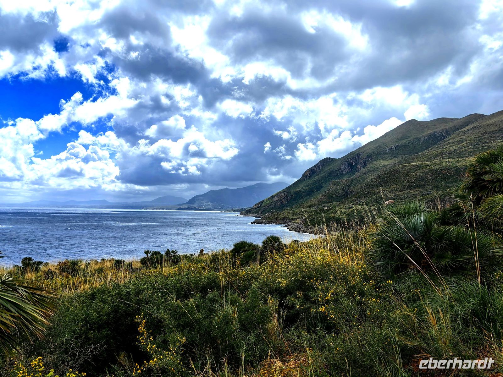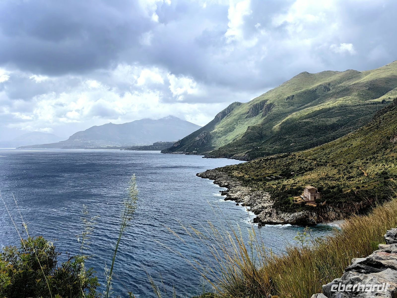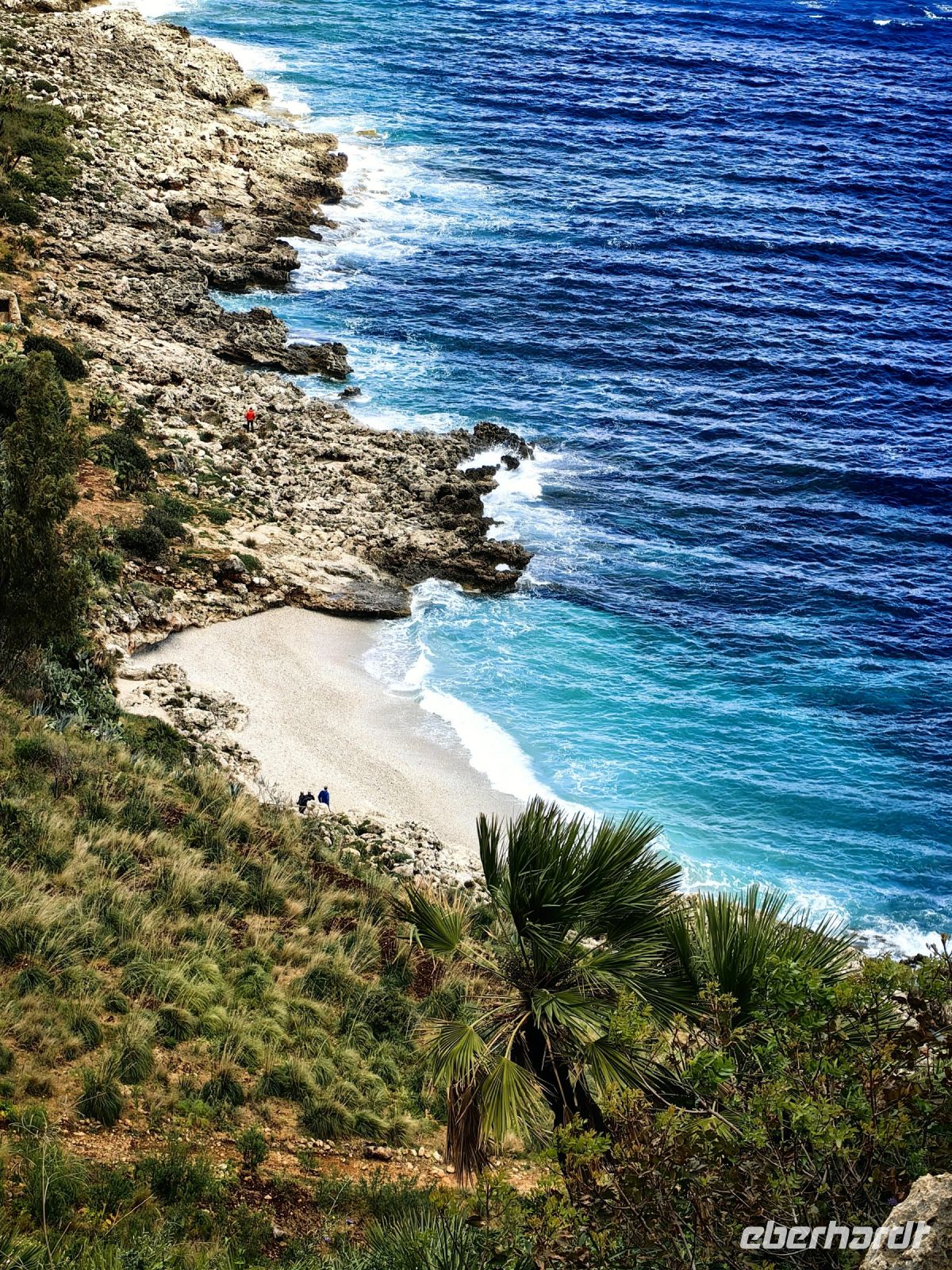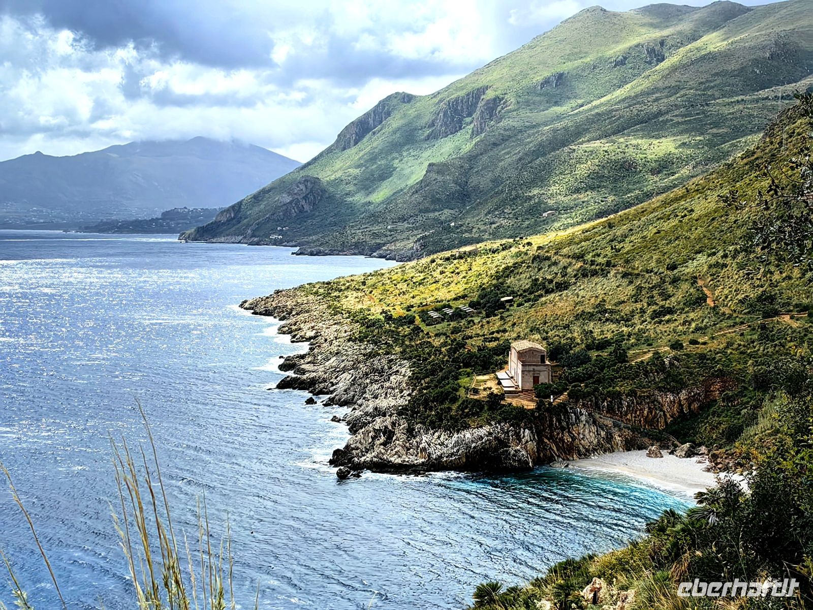 In den vergangenen Jahrhunderten lebten hier sowohl Bauern als auch Schmuggler in kleinen Dörfern, die die vielen Höhlen zur Lagerung ihrer Waren nutzten. Als Ende der 1970er Jahre der Bau einer Autostraße entlang einer der landschaftlich schönsten Küstenstrecken von Castellammare del Golfo bis San Vito lo Capo geplant wurde, gab es erhebliche Bürgerproteste. Daraufhin lenkte tatsächlich die Regierung ein und errichtete am 6. Mai 1981 das erste Naturreservat der Insel. Insgesamt umfaßt das Gebiet 1.600 Hektar und einen sieben Kilometer langen Küstenstreifen mit kleinen sandigen Buchten und rauen Kalkfelsen. Dadurch avancierte das Reservat zu einem der beliebtesten Orte der ganzen Insel, um herrliche Panoramablicke auf das Meer zu genießen, zu wandern oder zu baden. Da es heute recht kühl ist, ab und an sogar regnet und die dichten Wolken teilweise die Sonne verdecken, verzichten wir auf den Badespaß und widmen uns ganz der wilden Natur und den Ausblicken.