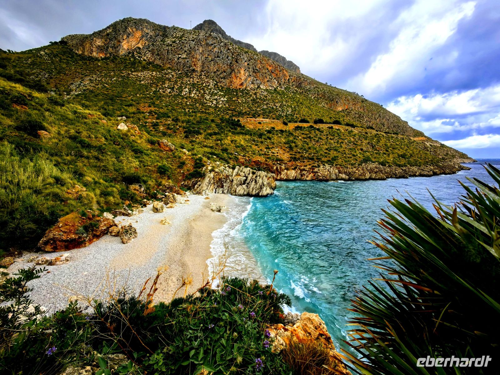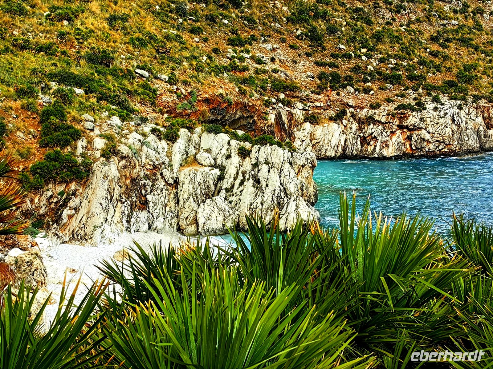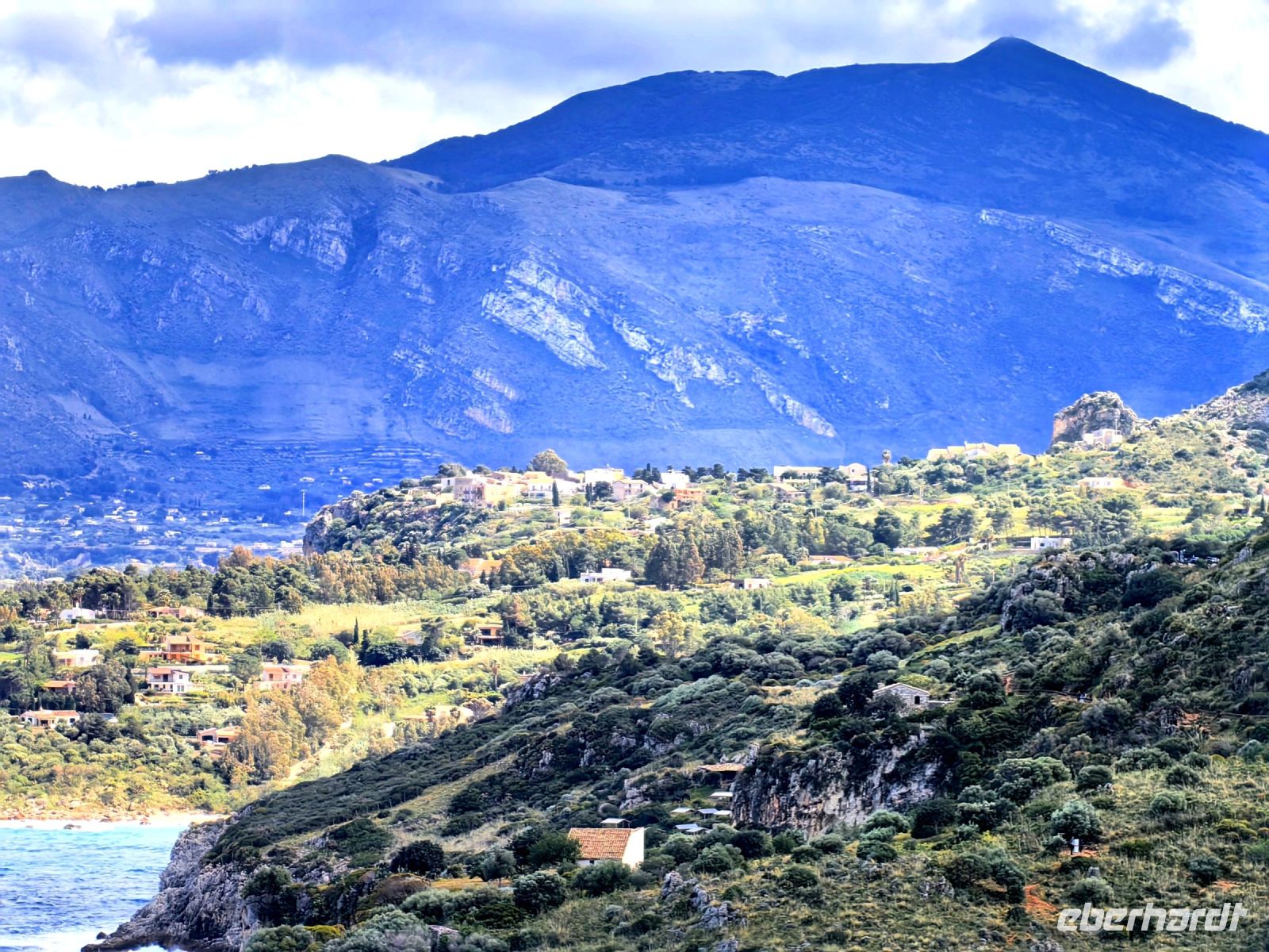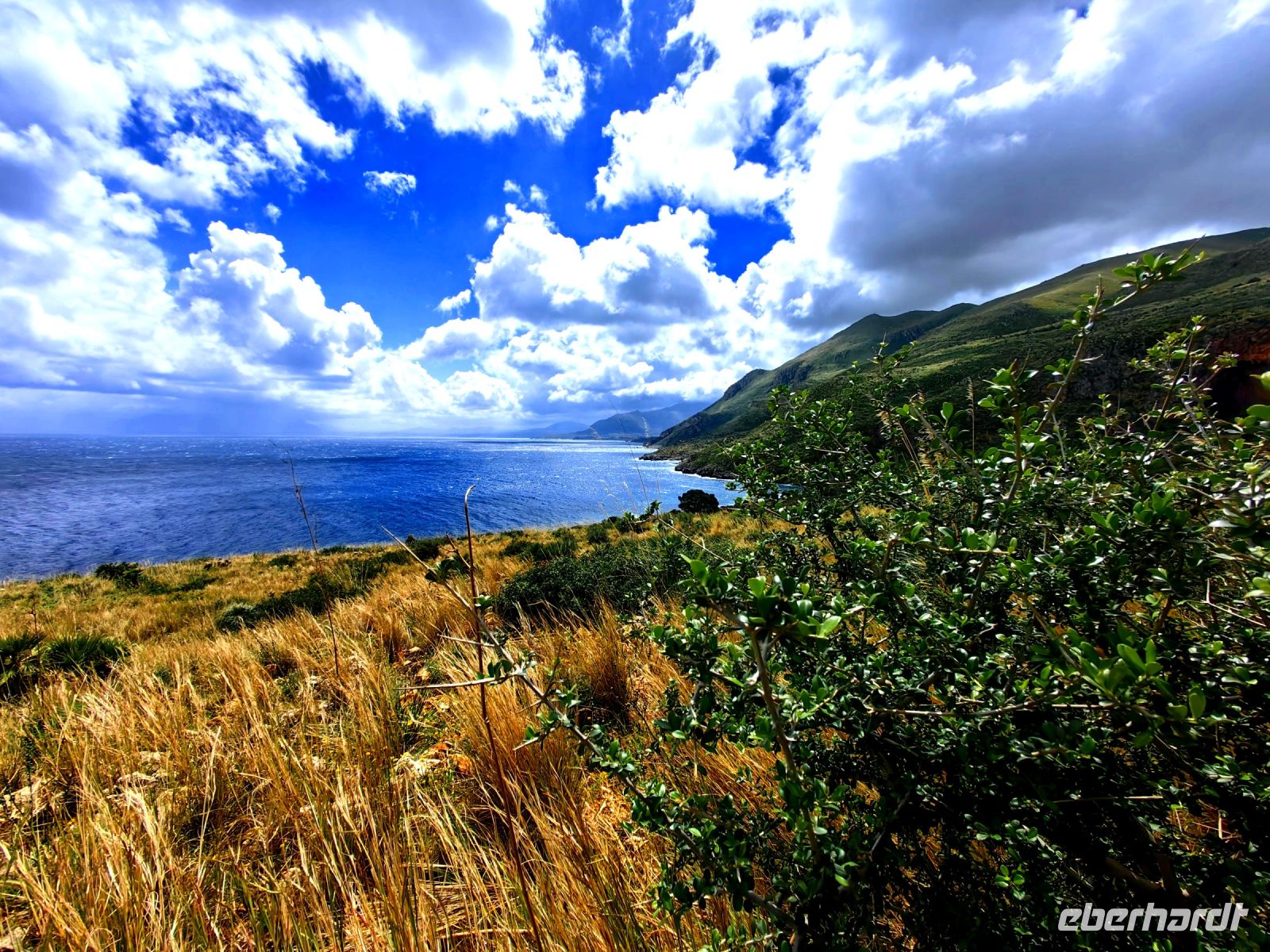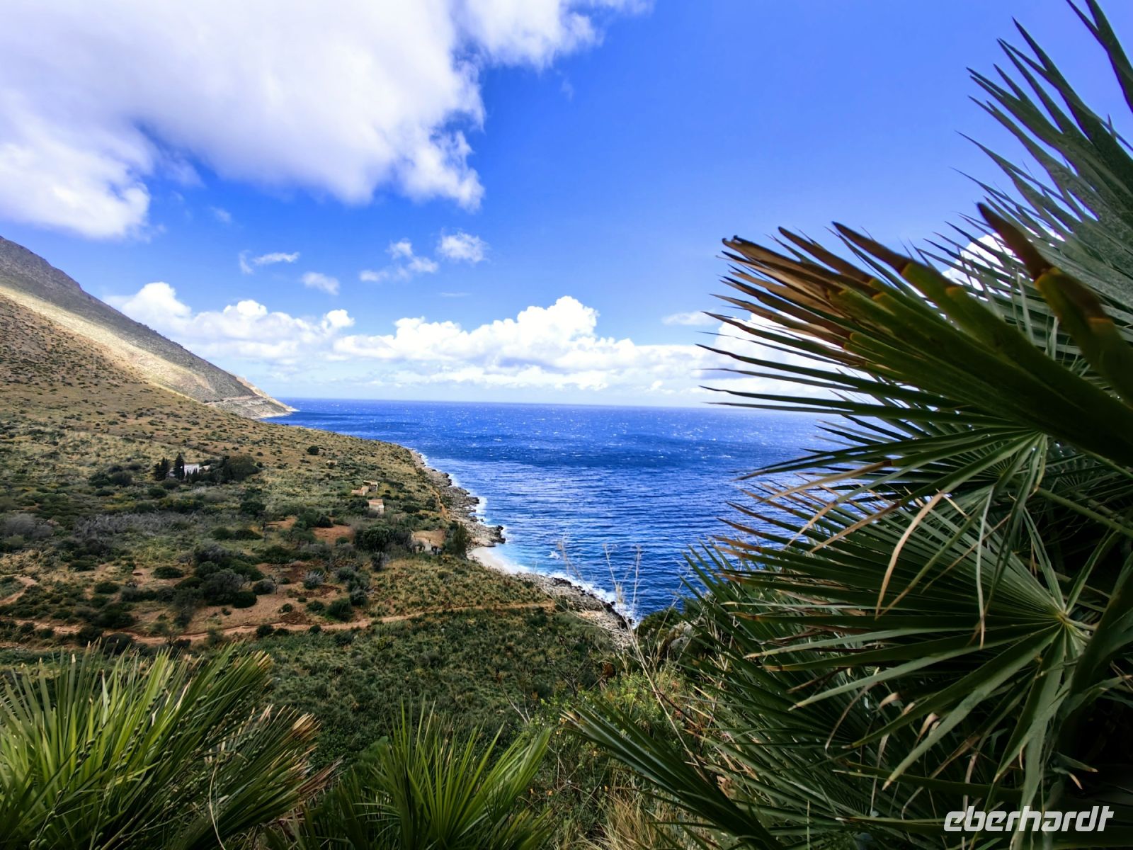 In den vergangenen Jahrhunderten lebten hier sowohl Bauern als auch Schmuggler in kleinen Dörfern, die die vielen Höhlen zur Lagerung ihrer Waren nutzten. Als Ende der 1970er Jahre der Bau einer Autostraße entlang einer der landschaftlich schönsten Küstenstrecken von Castellammare del Golfo bis San Vito lo Capo geplant wurde, gab es erhebliche Bürgerproteste. Daraufhin lenkte tatsächlich die Regierung ein und errichtete am 6. Mai 1981 das erste Naturreservat der Insel. Insgesamt umfaßt das Gebiet 1.600 Hektar und einen sieben Kilometer langen Küstenstreifen mit kleinen sandigen Buchten und rauen Kalkfelsen. Dadurch avancierte das Reservat zu einem der beliebtesten Orte der ganzen Insel, um herrliche Panoramablicke auf das Meer zu genießen, zu wandern oder zu baden. Da es heute recht kühl ist, ab und an sogar regnet und die dichten Wolken teilweise die Sonne verdecken, verzichten wir auf den Badespaß und widmen uns ganz der wilden Natur und den Ausblicken.