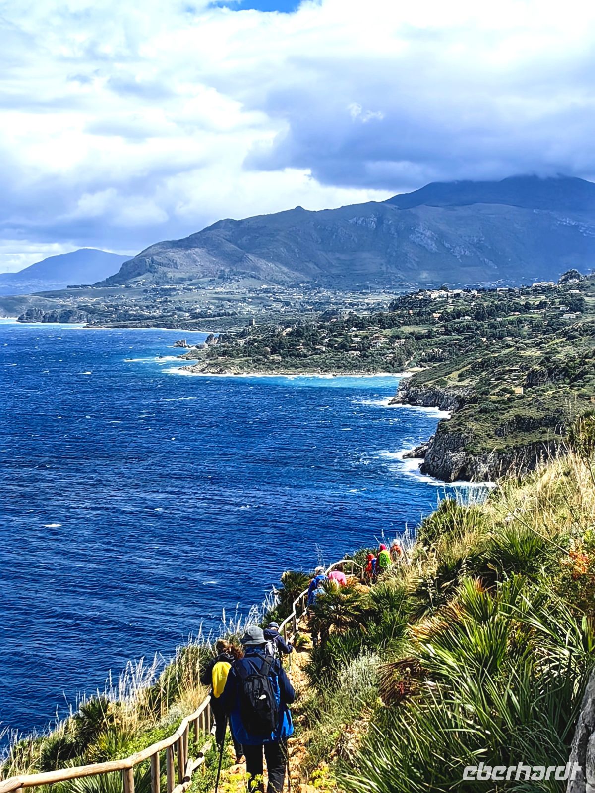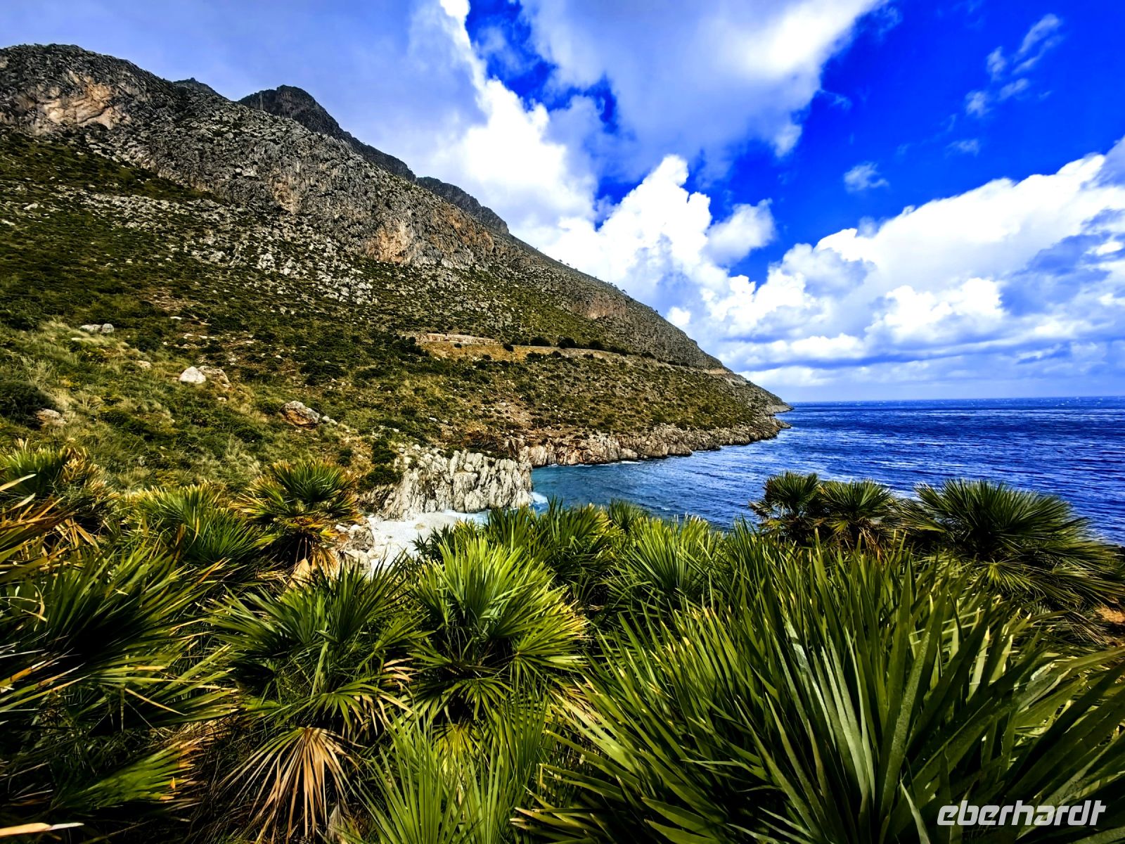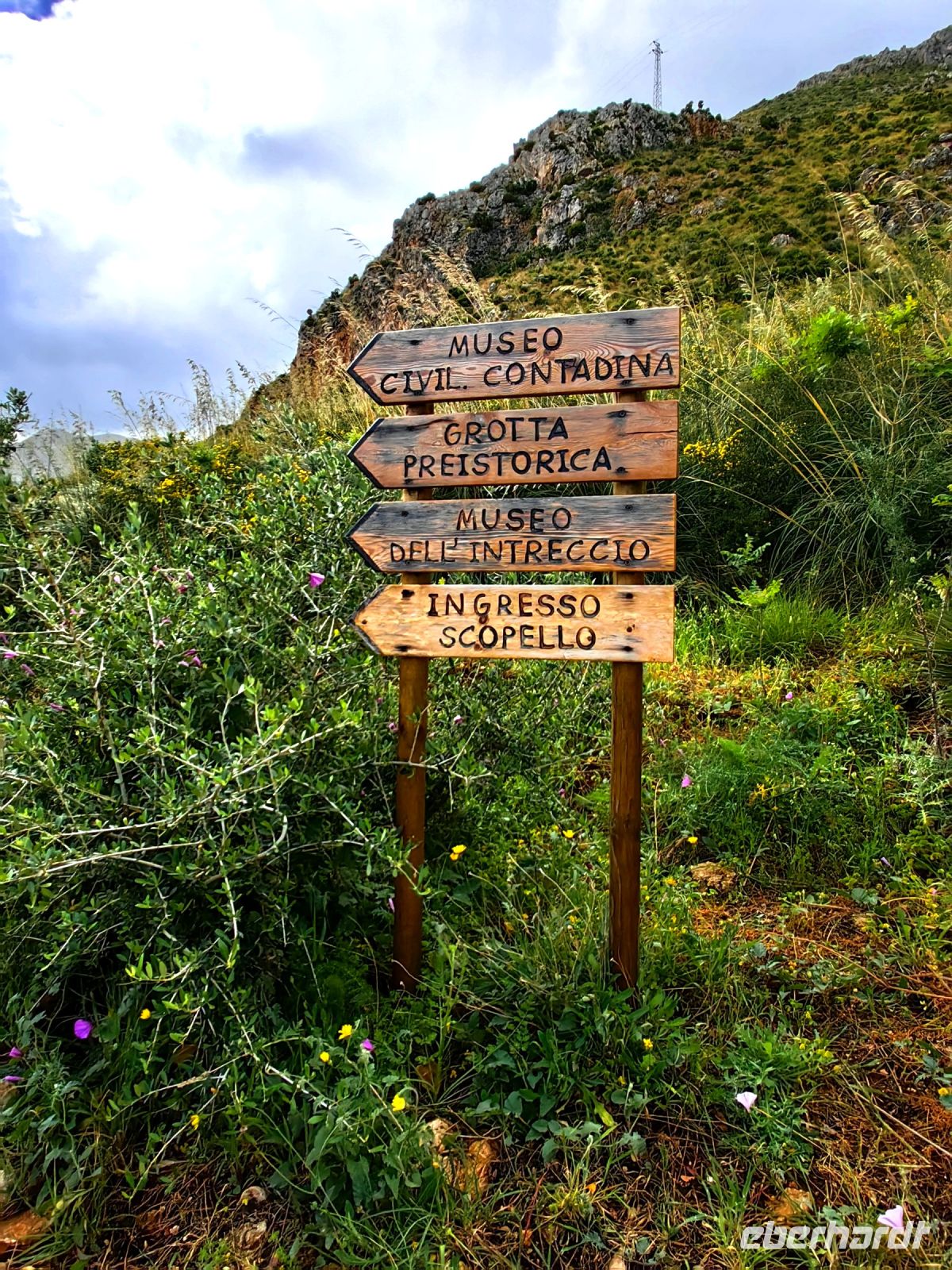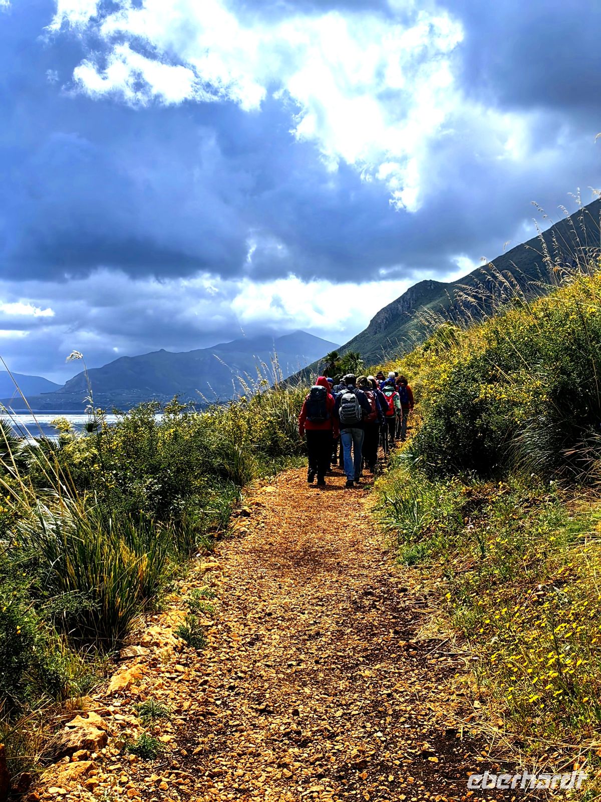 In den vergangenen Jahrhunderten lebten hier sowohl Bauern als auch Schmuggler in kleinen Dörfern, die die vielen Höhlen zur Lagerung ihrer Waren nutzten. Als Ende der 1970er Jahre der Bau einer Autostraße entlang einer der landschaftlich schönsten Küstenstrecken von Castellammare del Golfo bis San Vito lo Capo geplant wurde, gab es erhebliche Bürgerproteste. Daraufhin lenkte tatsächlich die Regierung ein und errichtete am 6. Mai 1981 das erste Naturreservat der Insel. Insgesamt umfaßt das Gebiet 1.600 Hektar und einen sieben Kilometer langen Küstenstreifen mit kleinen sandigen Buchten und rauen Kalkfelsen. Dadurch avancierte das Reservat zu einem der beliebtesten Orte der ganzen Insel, um herrliche Panoramablicke auf das Meer zu genießen, zu wandern oder zu baden. Da es heute recht kühl ist, ab und an sogar regnet und die dichten Wolken teilweise die Sonne verdecken, verzichten wir auf den Badespaß und widmen uns ganz der wilden Natur und den Ausblicken.