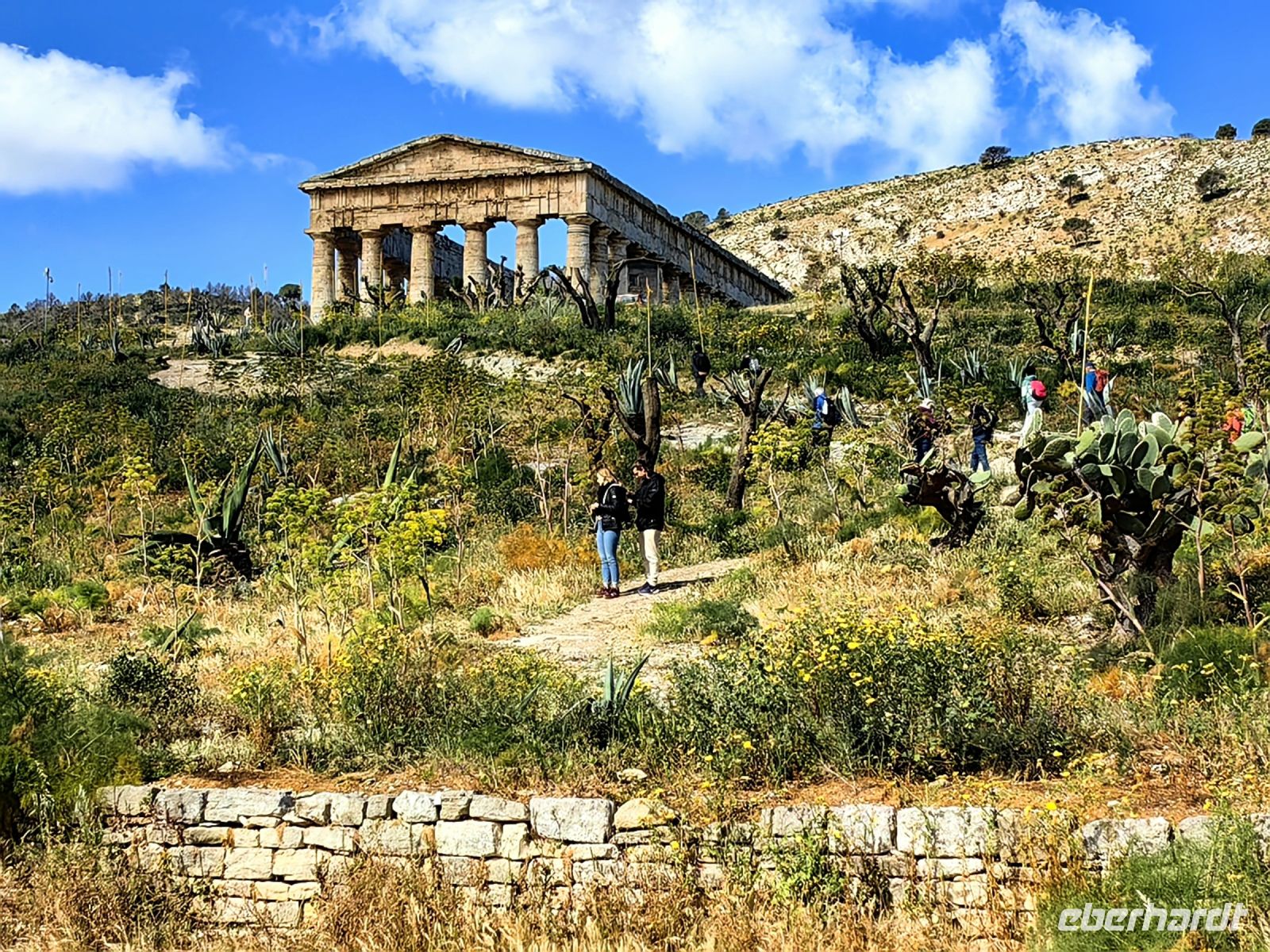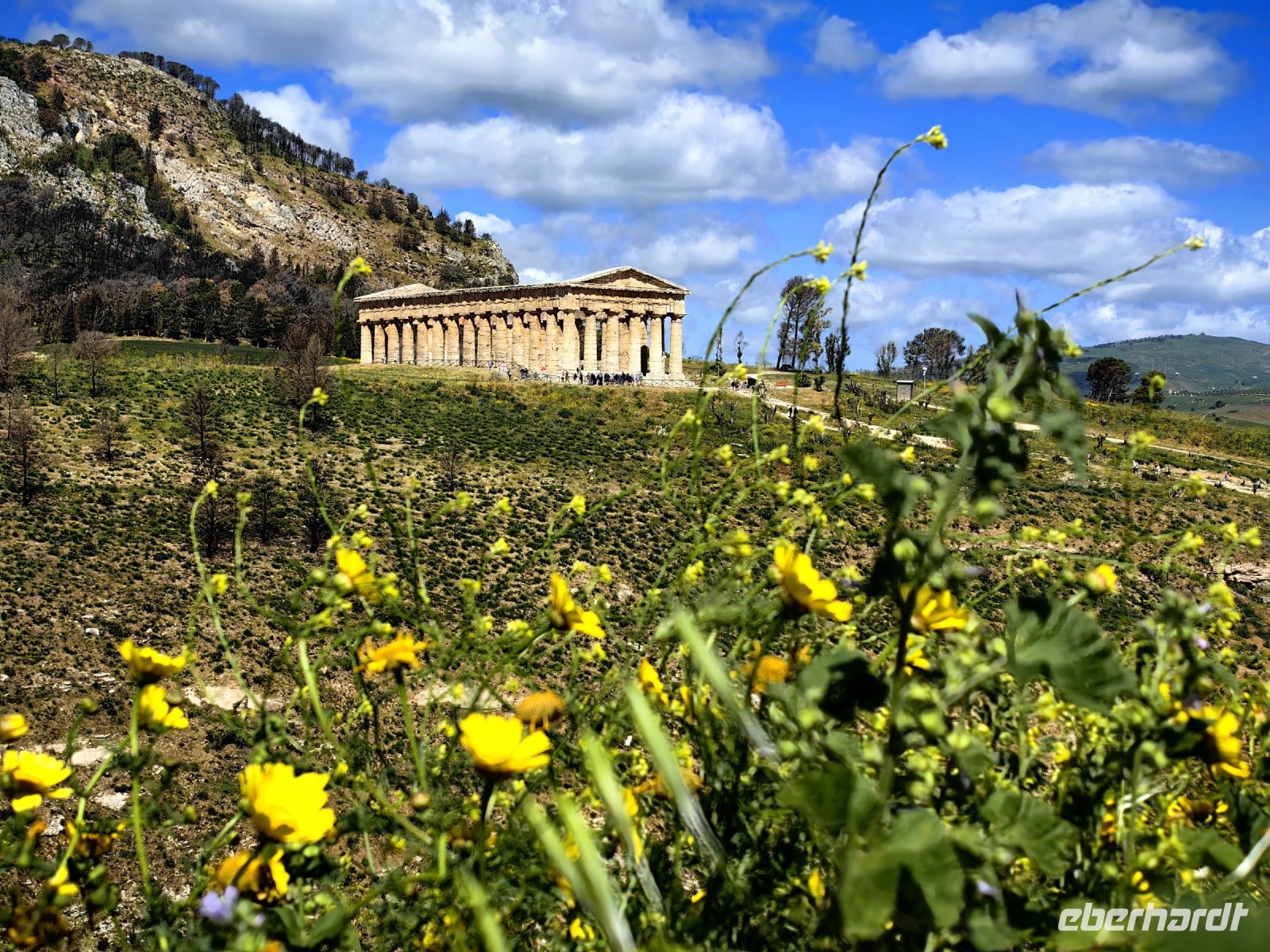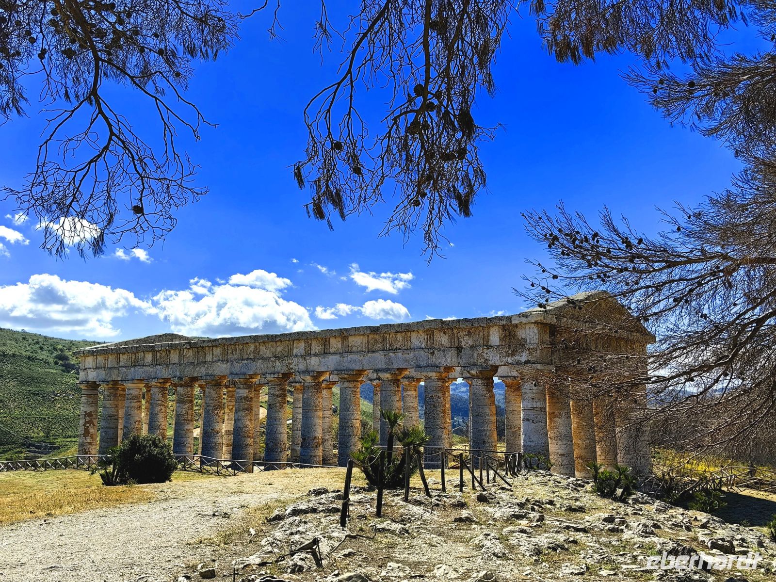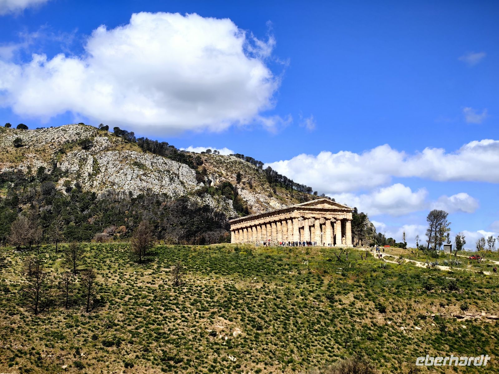 Auf einer Grundfläche von 21 x 61 Metern erheben sich heute noch 36 mächtige dorische Säulen und die geometrische Präzision ist bewundernswert. Seit der Erbauung des griechischen Tempels um 430 vor Christus wurde er nie zerstört, obwohl die Stadt Segesta in zahlreiche Kriege verwickelt war und auch gelegentlich von den jeweiligen Eroberern dem Erdboden gleich gemacht wurde. Man nutze ihn auch nicht, wie sonst üblich im Mittelalter, als Steinbruch für den Bau von Häusern und Kirchen. So steht dieses Monument heute noch in einer unbeschreiblich schönen Hügellandschaft.