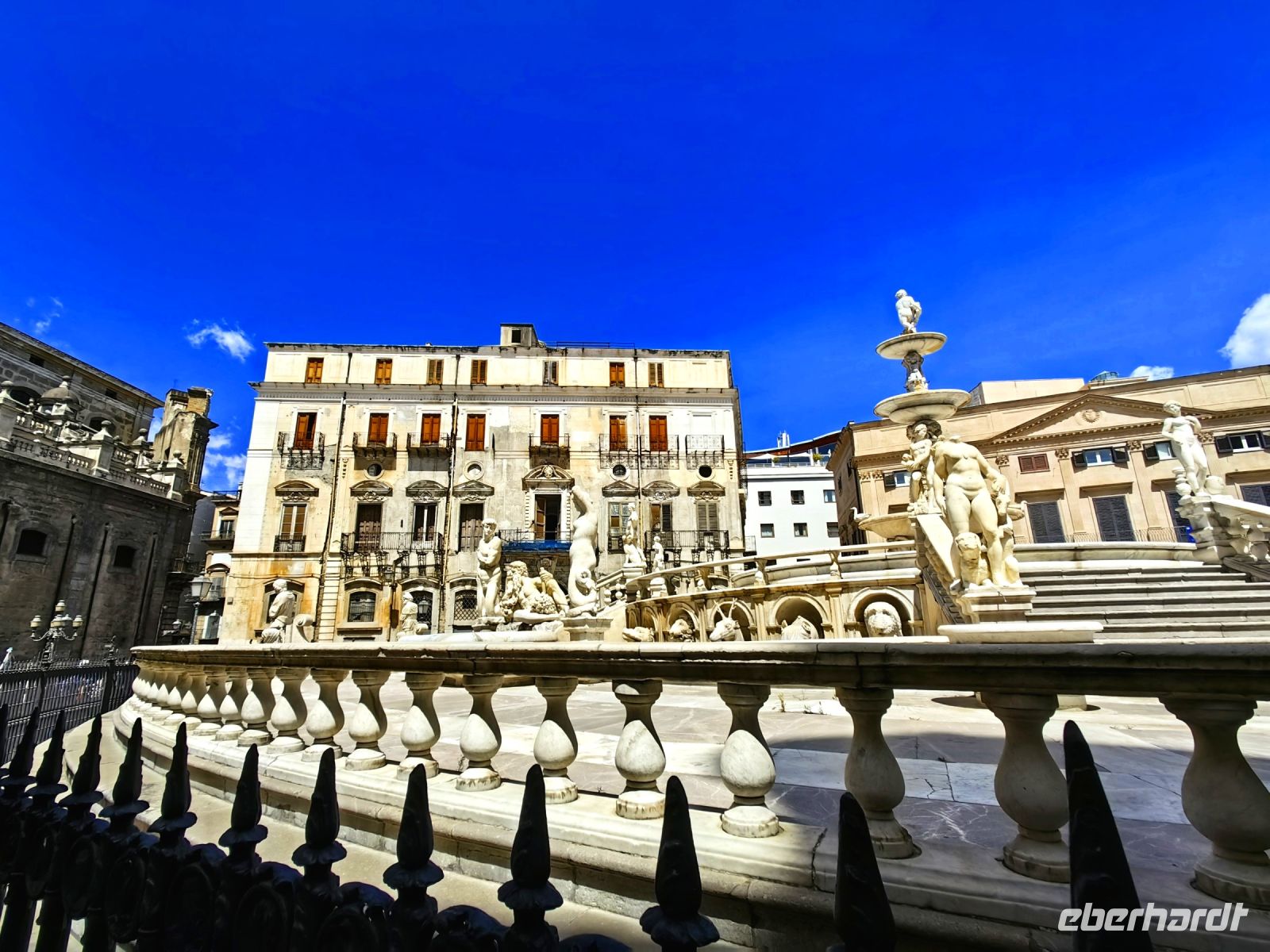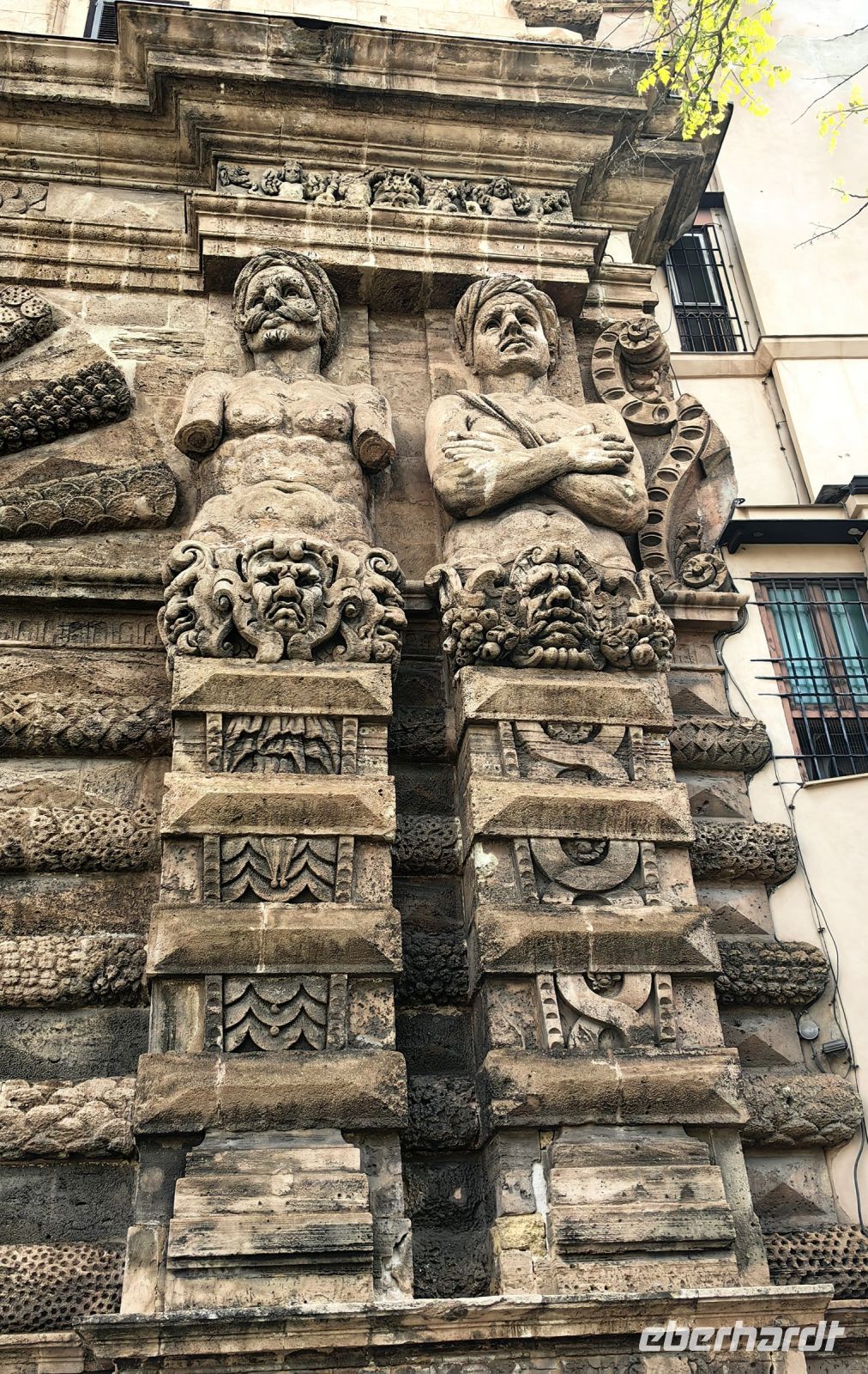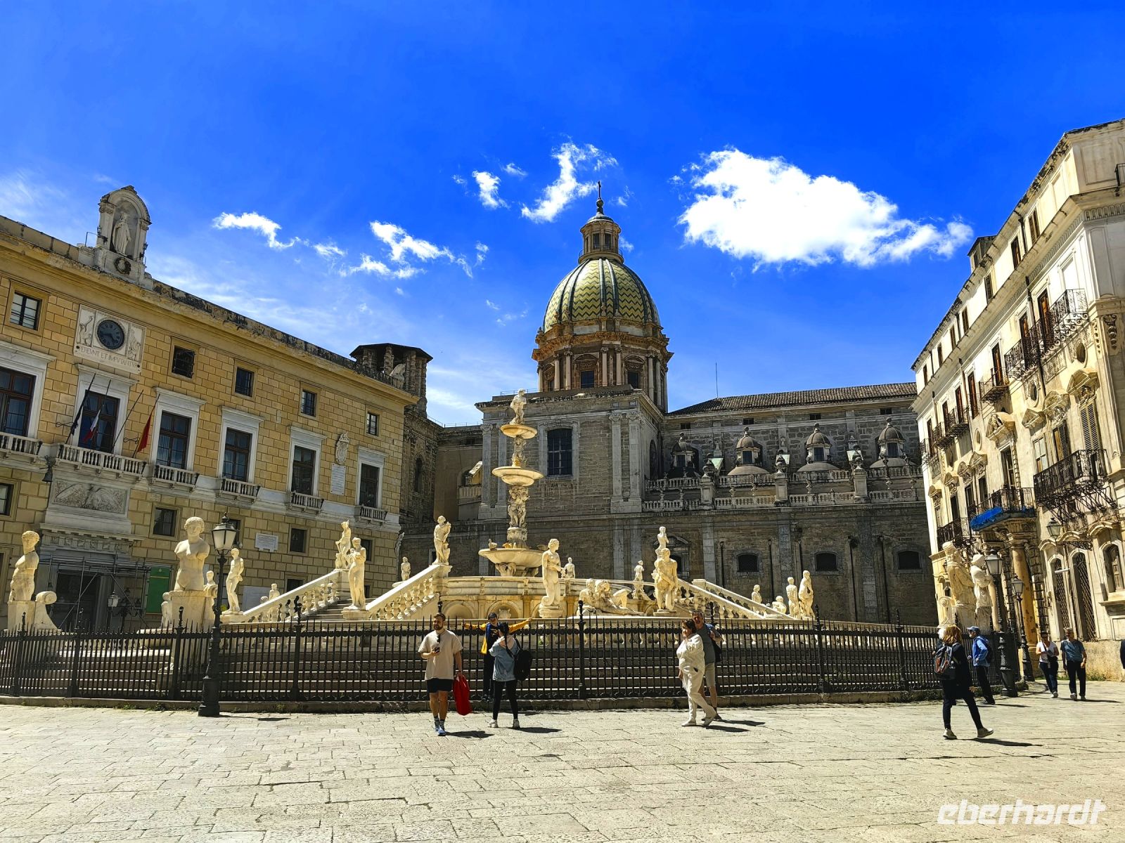 Nun laufen wir durch die Altstadt und passieren die Quattro Canti. Von dieser Kreuzung gehen vier schnurgerade Straßen ab und in der Mitte sehen wir an jeder Ecke gleiche Häuser, heute spielt ein Straßenmusikant und wir müssen sehr viel Geschick aufbringen, um Camillo vorn nicht zu verlieren und noch ein gutes Foto ohne fremde Köpfe im Bild zu schießen, so voll ist es hier. Daher biegen wir ab und erreichen die Piazza Pretoria mit dem gleichnamigen Brunnen. Vizekönig Don Pedro Alvarez de Toledo war es, der den Brunnen im 16. Jahrhundert in Auftrag gab. Er sollte eigentlich das Anwesen des Vizekönigs verschönern. Später wurde er umgesetzt, man planierte dafür extra eine Fläche hier in der Altstadt an der Via Maqueda und platzierte ihn genau vor der Kirche. Die nackten Wassergötter und Nymphen brachten dem Bauwerk so nah am Gotteshaus den Beinamen "Brunnen der Schande" ein.
