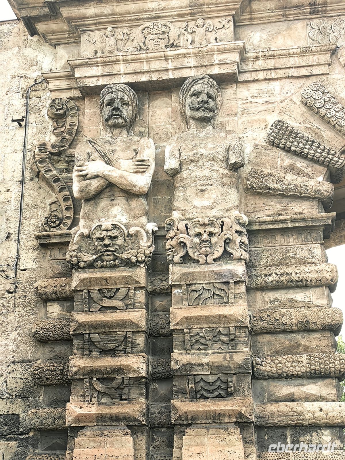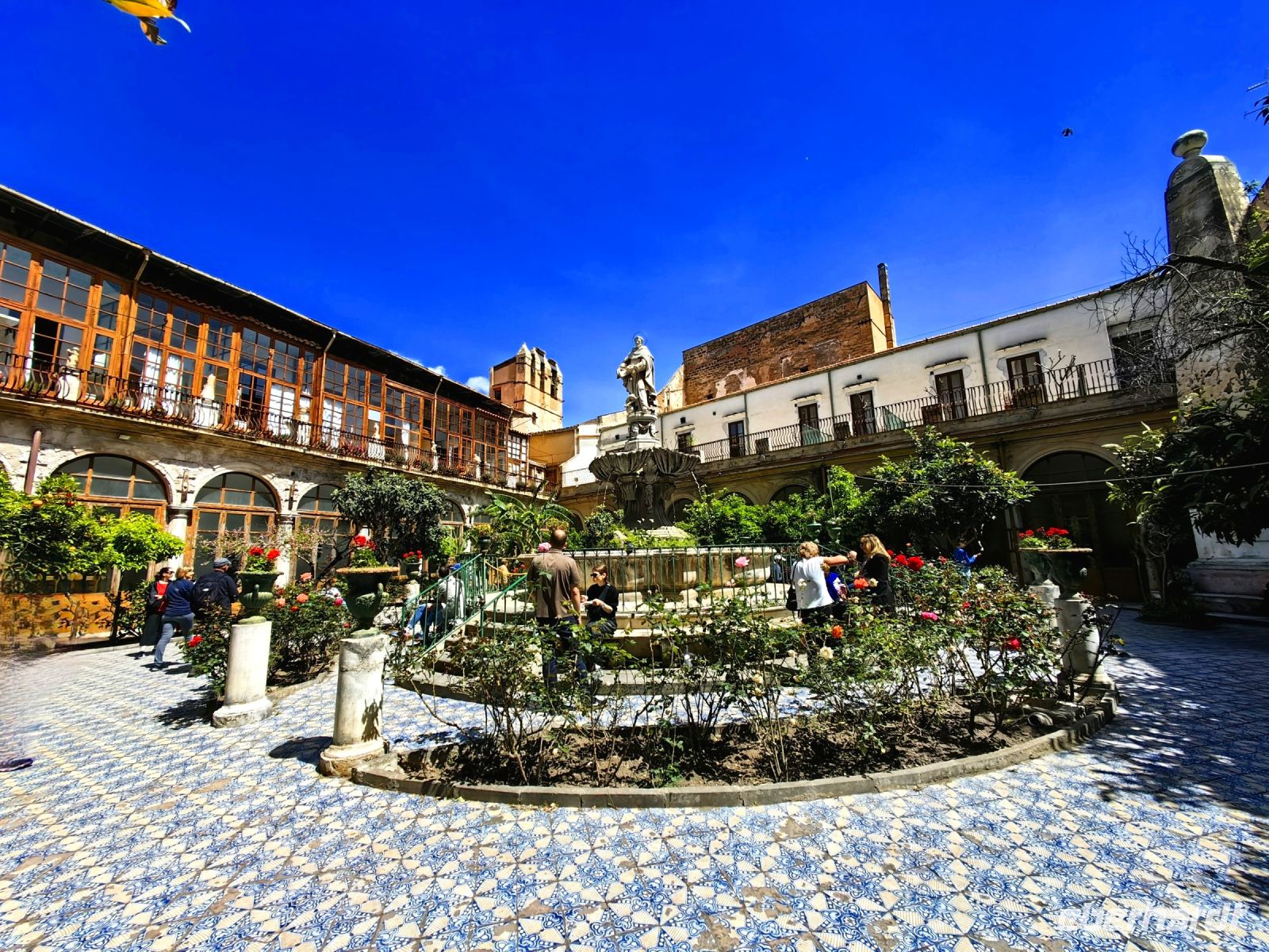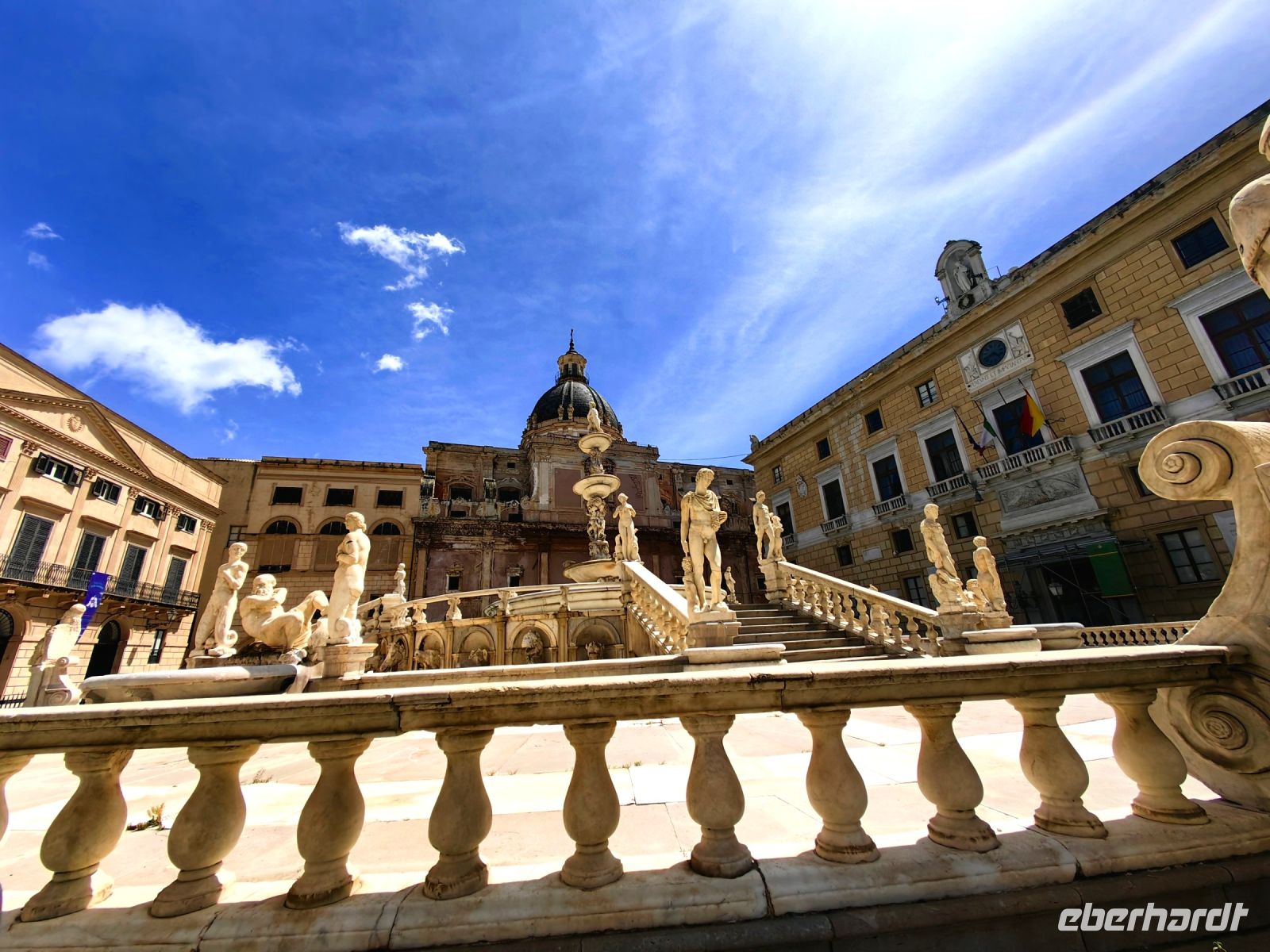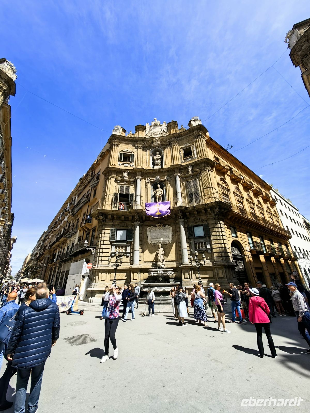 Nun laufen wir durch die Altstadt und passieren die Quattro Canti. Von dieser Kreuzung gehen vier schnurgerade Straßen ab und in der Mitte sehen wir an jeder Ecke gleiche Häuser, heute spielt ein Straßenmusikant und wir müssen sehr viel Geschick aufbringen, um Camillo vorn nicht zu verlieren und noch ein gutes Foto ohne fremde Köpfe im Bild zu schießen, so voll ist es hier. Daher biegen wir ab und erreichen die Piazza Pretoria mit dem gleichnamigen Brunnen. Vizekönig Don Pedro Alvarez de Toledo war es, der den Brunnen im 16. Jahrhundert in Auftrag gab. Er sollte eigentlich das Anwesen des Vizekönigs verschönern. Später wurde er umgesetzt, man planierte dafür extra eine Fläche hier in der Altstadt an der Via Maqueda und platzierte ihn genau vor der Kirche. Die nackten Wassergötter und Nymphen brachten dem Bauwerk so nah am Gotteshaus den Beinamen "Brunnen der Schande" ein.
