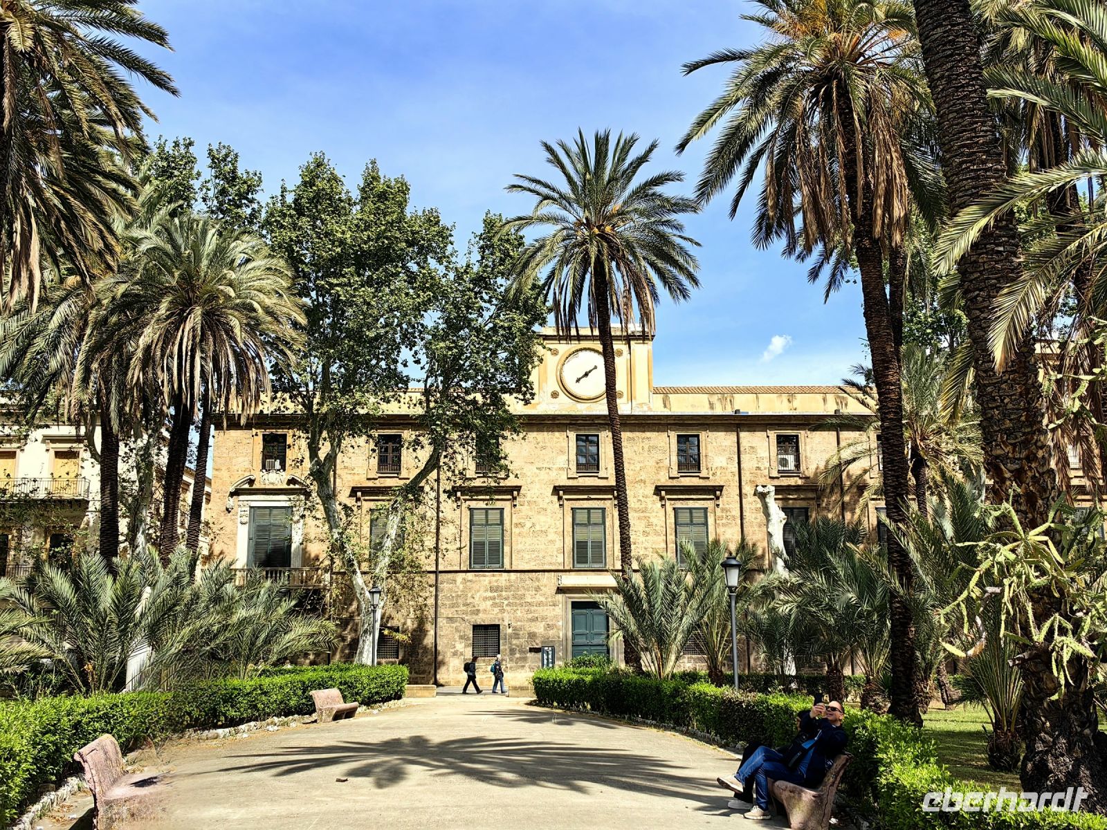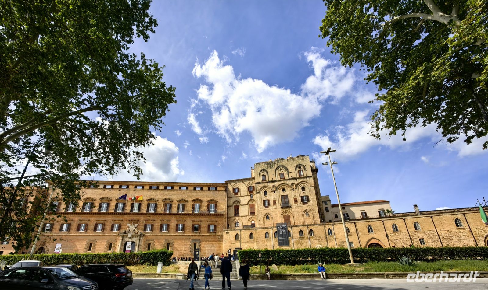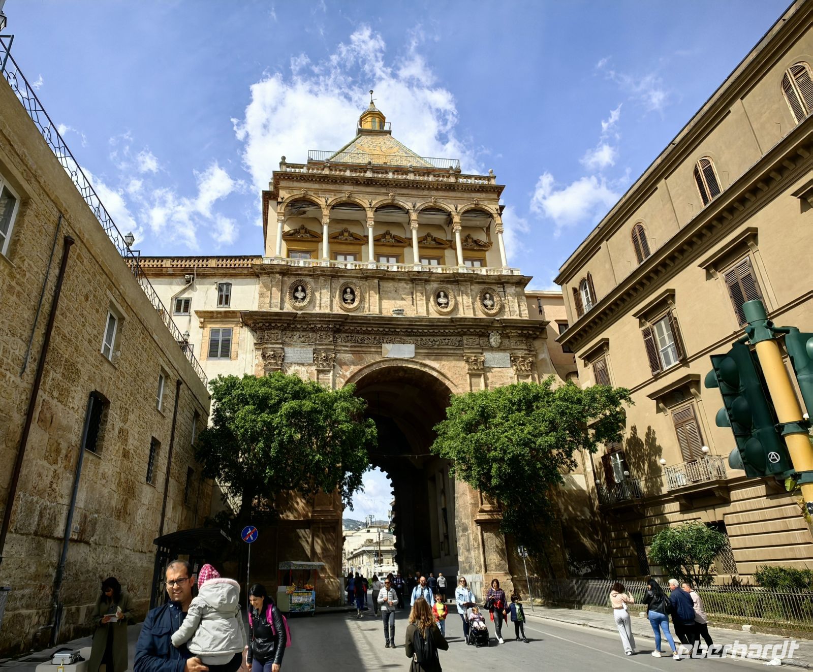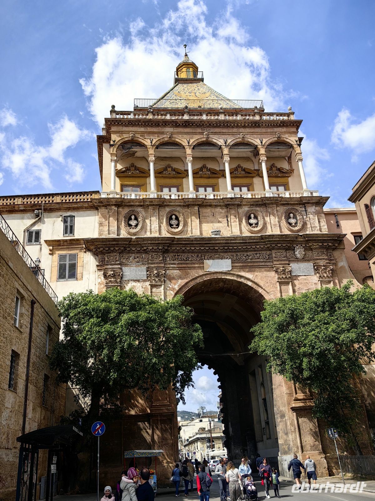 Da unser Flug nach Frankfurt erst am Abend geht, haben wir gemeinsam beschlossen, uns noch ein wenig in der Hauptstadt Palermo umzusehen. Als wir am Vormittag ankommen, sind wir überrascht, wie viele Menschen sich hier tummeln. Mein Schiff liegt im Hafen und es herrscht in den Gassen reges Treiben. Durch die imposante Porta Nuova betreten wir die Altstadt. Dieses Tor steht seit 1583 anstelle eines vorher bereits vorhandenen Tores hier, um an den Sieg Karls V 1535 in Tunesien zu erinnern. Dieser Sieg ist am Tor bildlich verewigt durch vier Mauren, die als Pfeiler in die Fassade eingearbeitet sind. Am Palazzo Reale, dem Normannenpalast, steht eine riesige Schlange von Menschen. Wir können nur die im Laufe der Jahrhunderte durch die verschiedenen Herrscher geprägte Mischung unterschiedlicher Baustile der Außenfassaden bewundern.