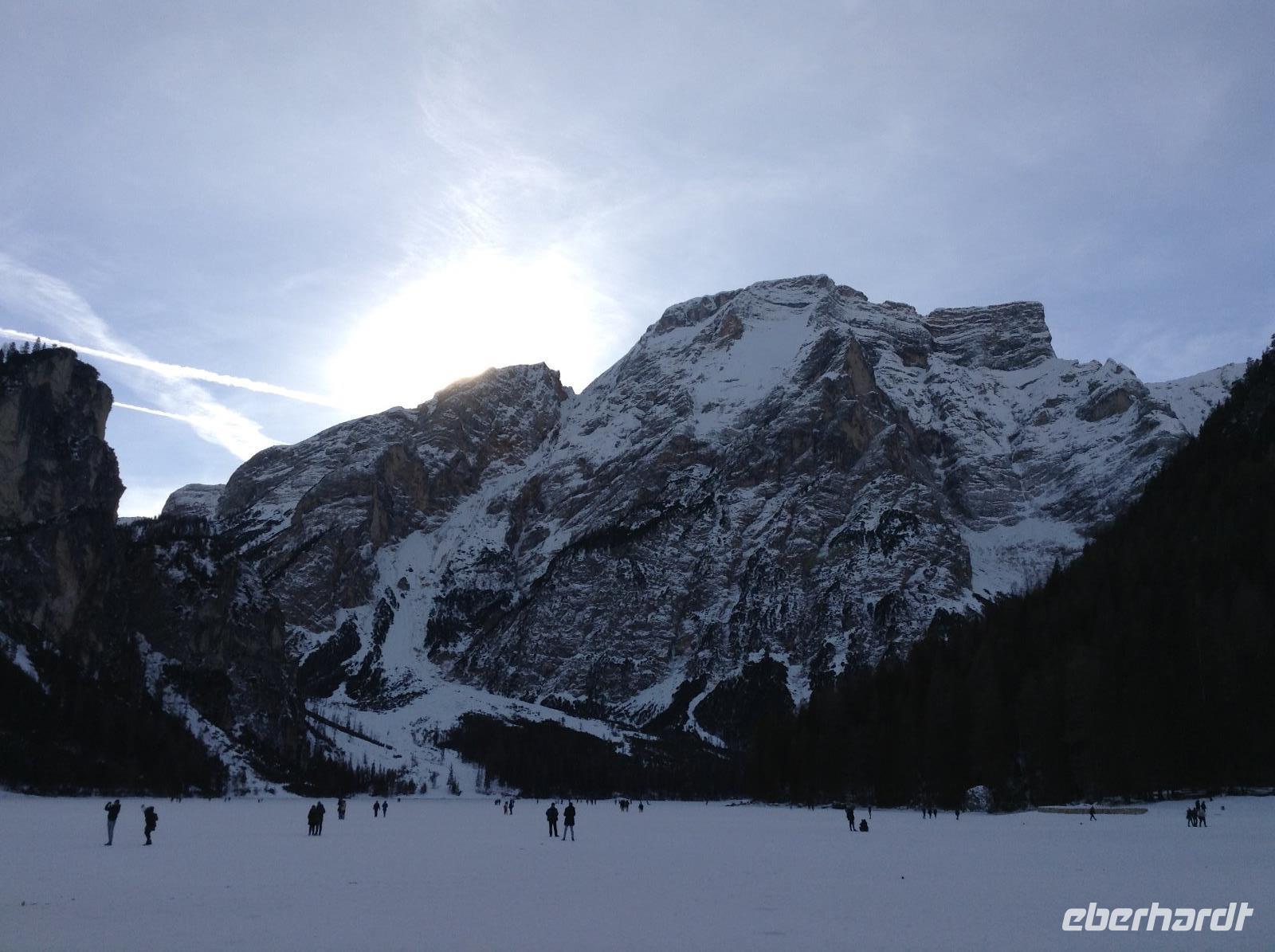 Wir beschlossen das tolle Wetter über die Mittagszeit richtig auszukosten und machten auf dem Rückweg durch das Pustertal einen Abstecher zum Pragser Wildsee. Von den Bergen der Dolomiten umgeben empfing uns dieser schöne See zugefroren und wir konnten auf dem Eis spazieren gehen und Fotos machen. Es ging zurück zum Pustertal und dann nach Brixen.
