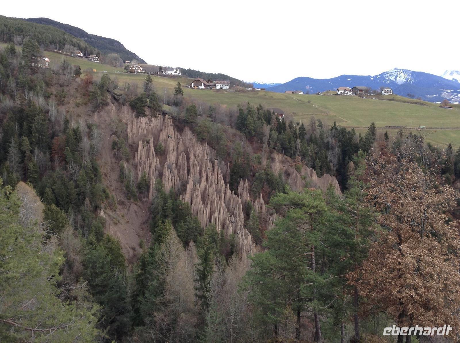 Der Wetterbericht versprach aber baldige Besserung und so war es dann auch. Mit dem Bus ging es zunächst nach Bozen zur Talstation der Seilbahn auf den Ritten. In 12 Minuten schaffte uns die Gondel dann nach Oberbozen hinauf und wir genossen die Auffahrt mit einem tollen Blick über Bozen und das Tal. Oben angekommen, standen wir direkt am Bahnhof der Schmalspurbahn, die uns von Oberbozen nach Klobenstein bringen sollte. Es war noch etwas Zeit, sich umzuschauen und die tollen Häuser zu sehen, die sich gutbetuchte Bozener für die Sommerfrische in luftiger Höhe haben bauen lassen. Dann kam der Zug und es ging über den Ritten nach Klobenstein. Dort wartete bereits unser Bus auf uns und wir fuhren bis zum Sporthotel Spögler bei Lengmoos. Von da aus wanderten gemütlich ein Stück bis zu den Rittener Erdpyramiden, einer besonderen Attraktion. Neugierig ragen sie bis zu 30 m hoch in die Luft und wirken wie eine Zauberlandschaft, die die Natur dort hat entstehen lassen.