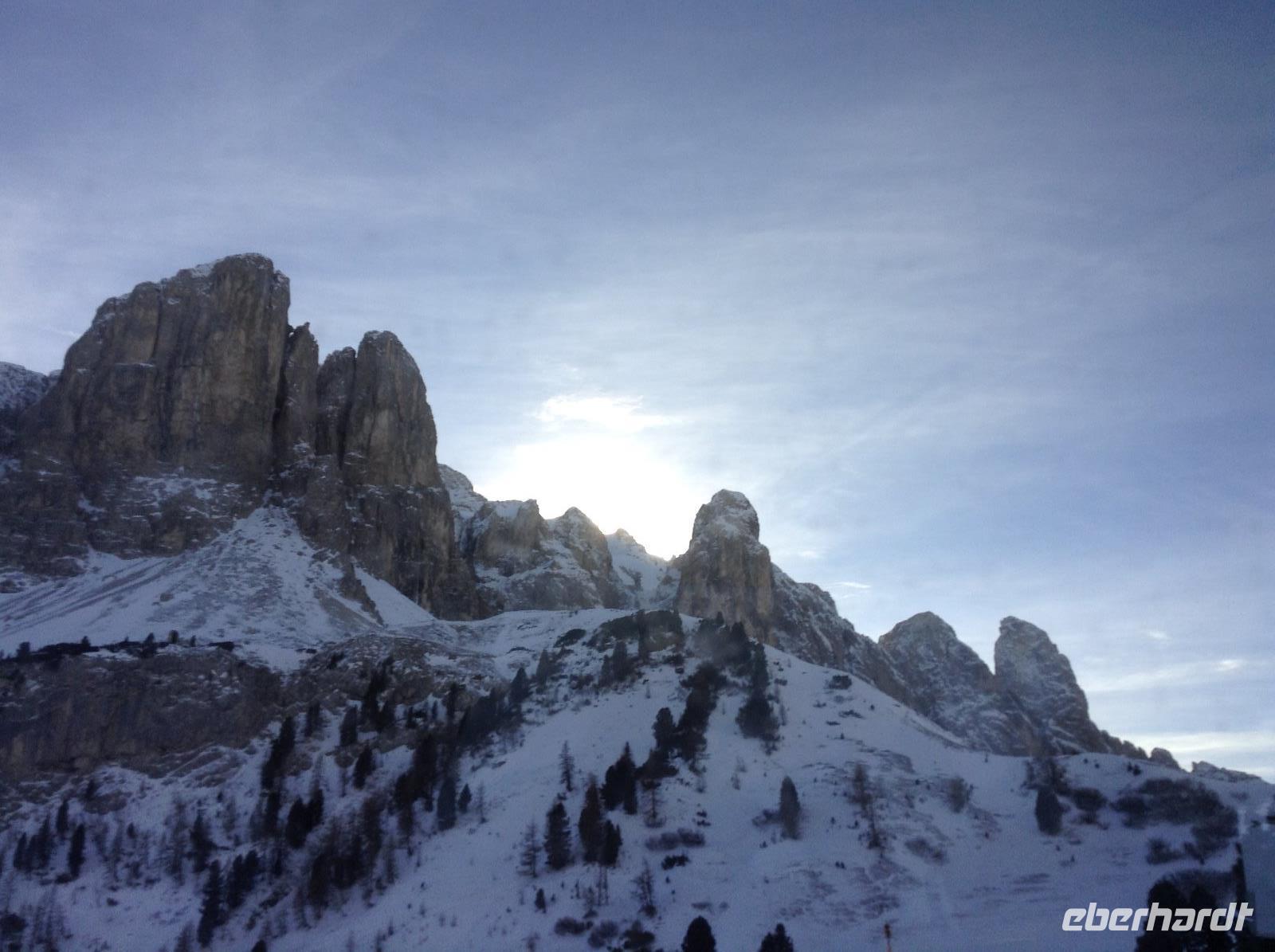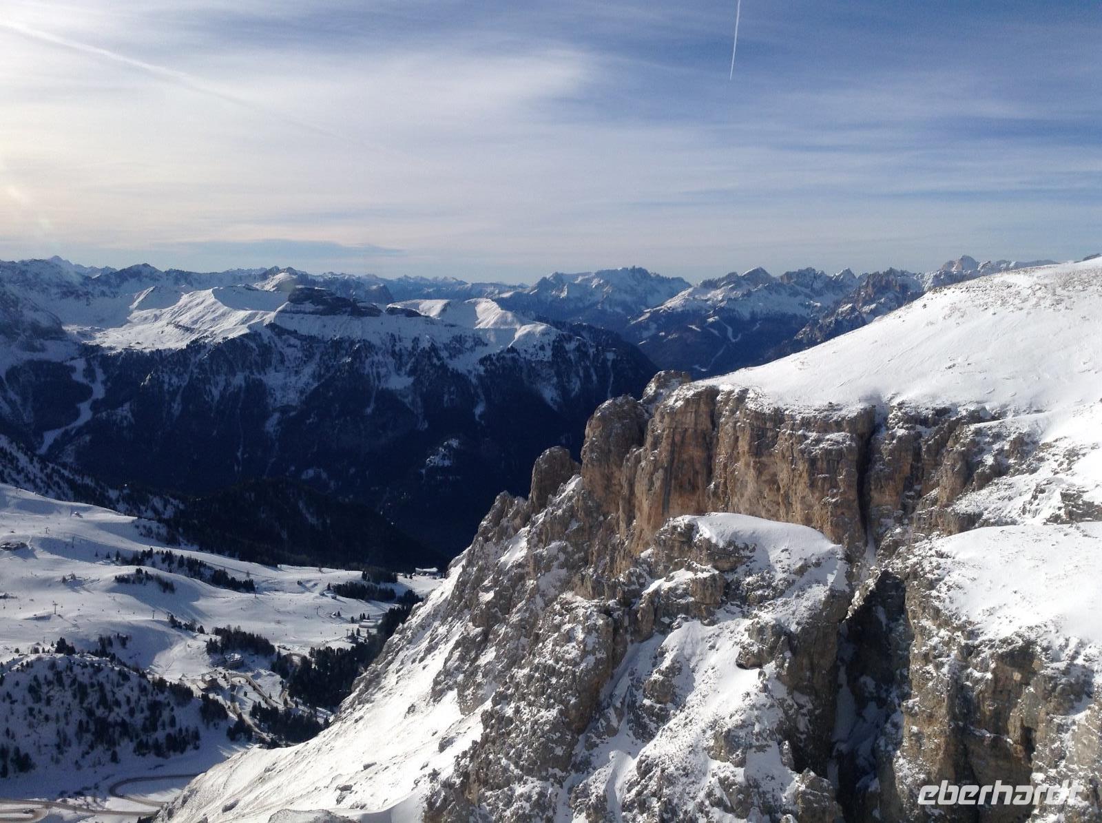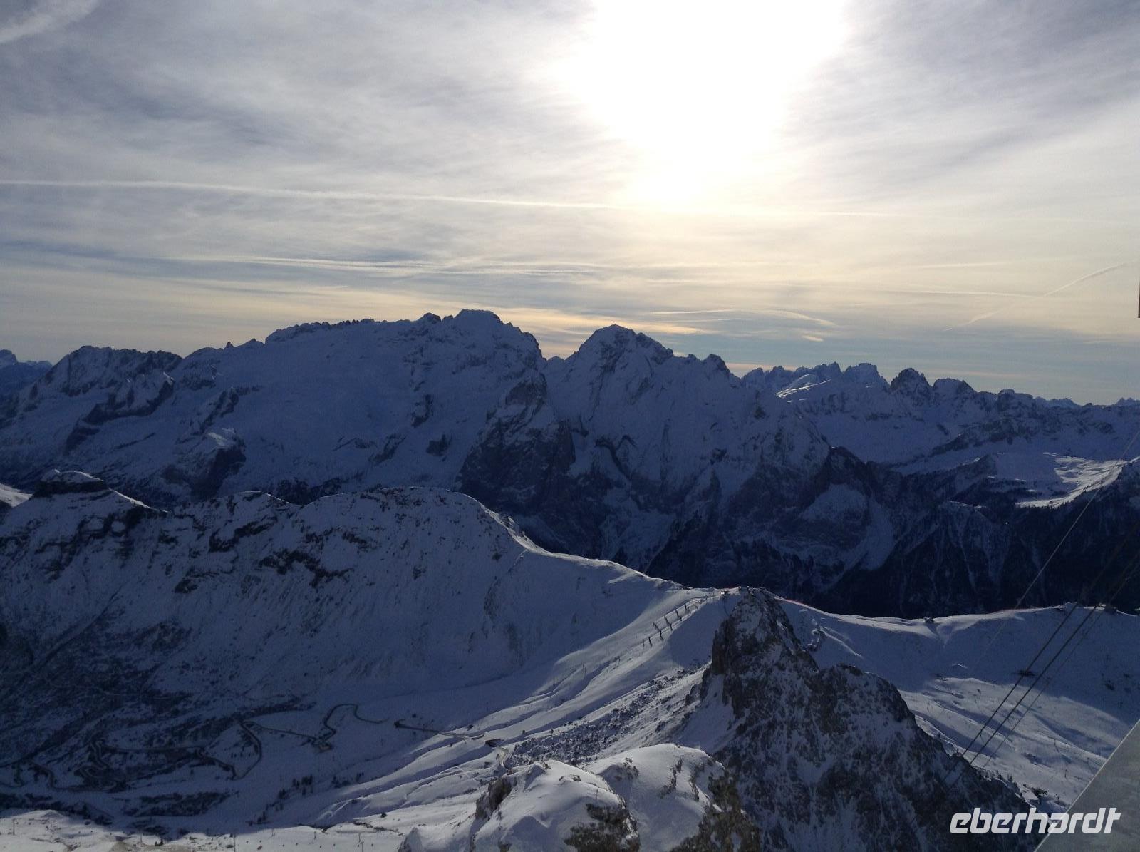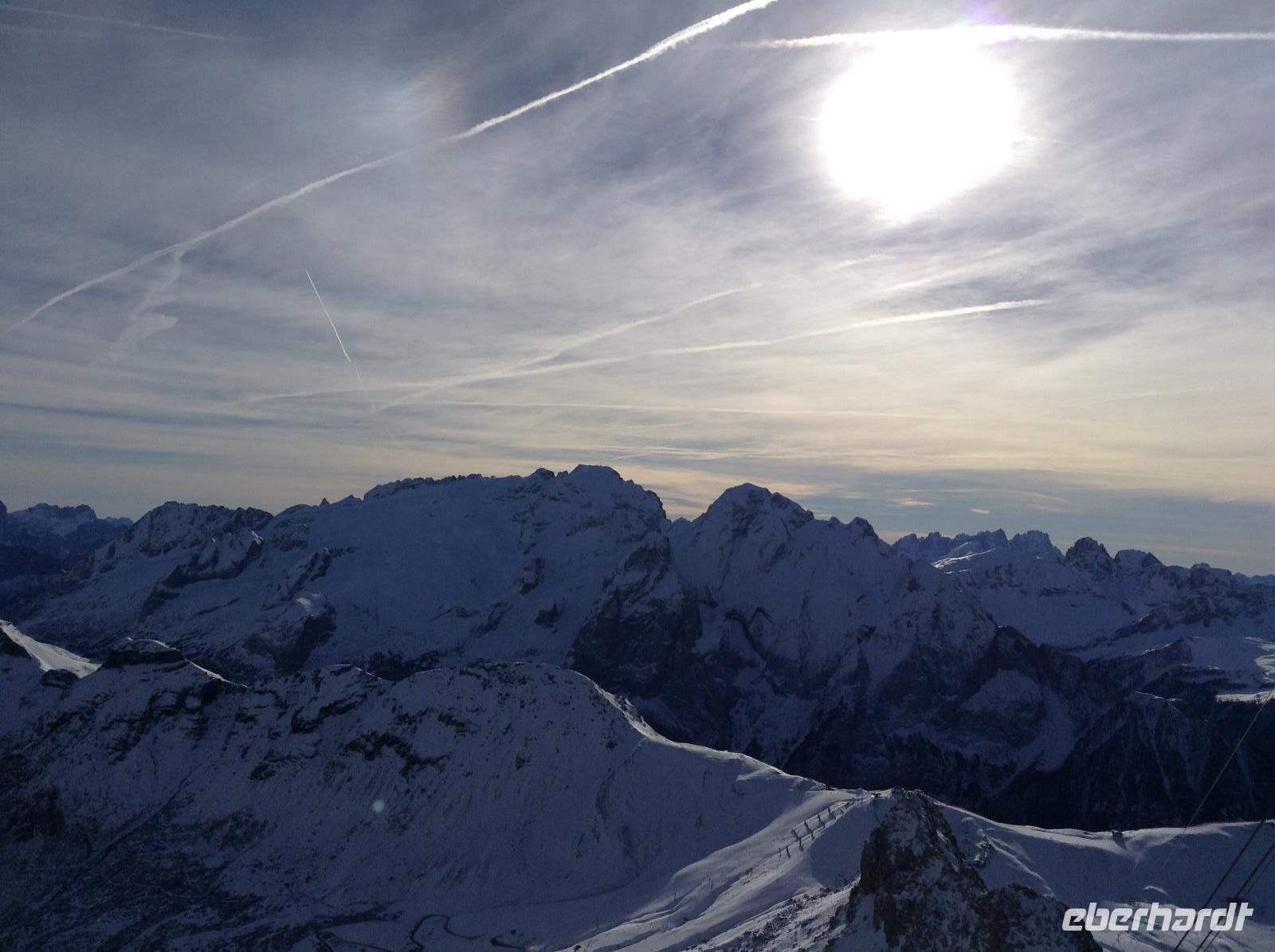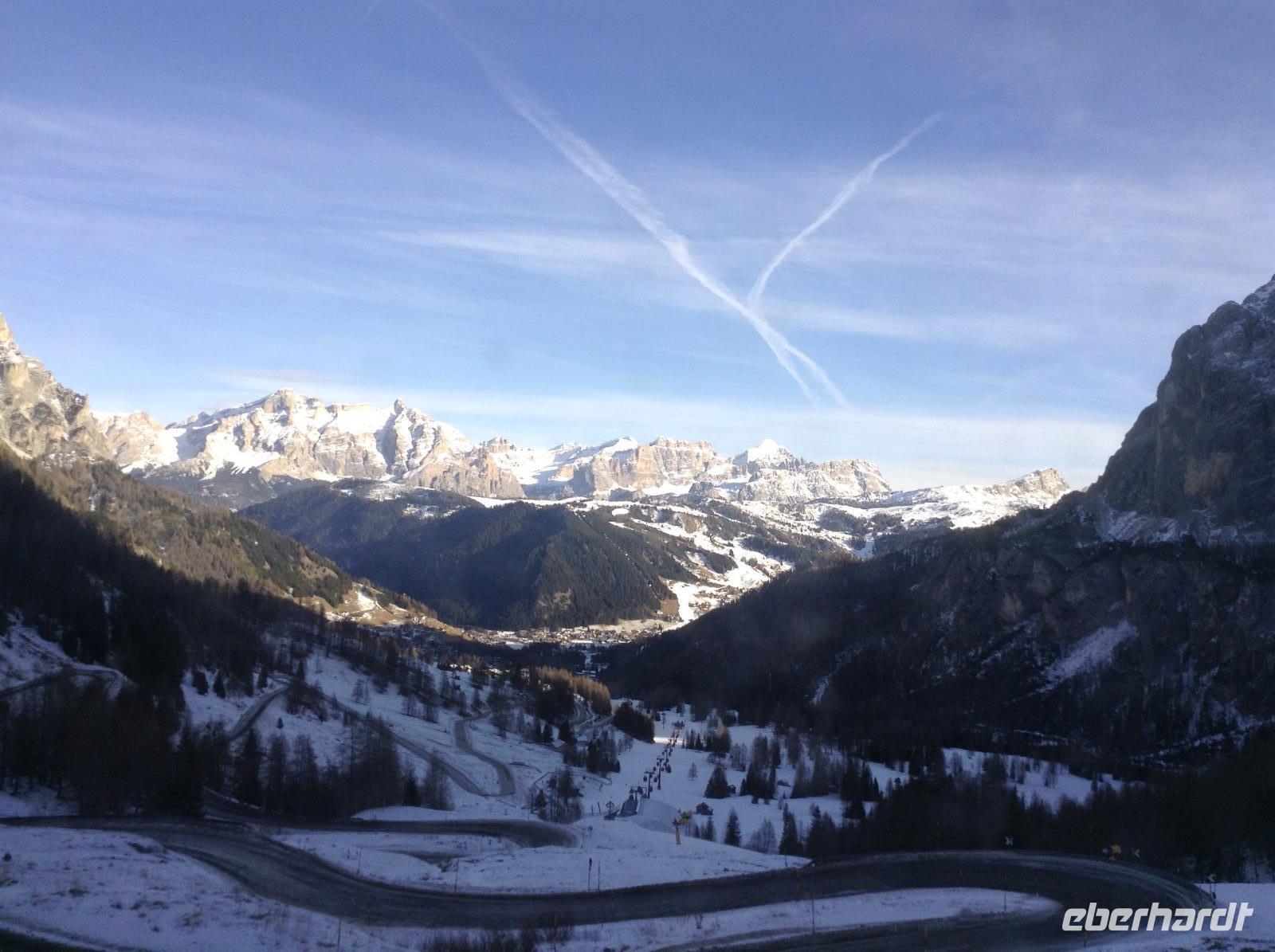 Wie sich das für den ersten Weihnachtsfeiertag gehört, hatten wir traumhaftes Wetter und eine herrliche Fernsicht an diesem Tag, also optimale Voraussetzungen für unsere Dolomitenrundfahrt. Unser Reiseleiter Sepp kam früh zum Hotel und wir starteten. Zuerst ging es ins Grödnertal und damit Mitten in die Wunderwelt der Berge hinein. Schlern, Rosengarten, Langkofel, Sella, Marmolada, Geißlerspitzen, es war fantastisch. Am Pass Pordoj wagten wir dann die Auffahrt mit der Seilbahn zum Pordojjoch auf 2930 m. Wir wurden mit einer grandiosen Rundumsicht belohnt. Durch die herrliche Fernsicht von bis zu 80 km konnten wir gut bis zu den Gipfeln des Alpenhauptkammes sehen, ein unvergessliches Erlebnis.