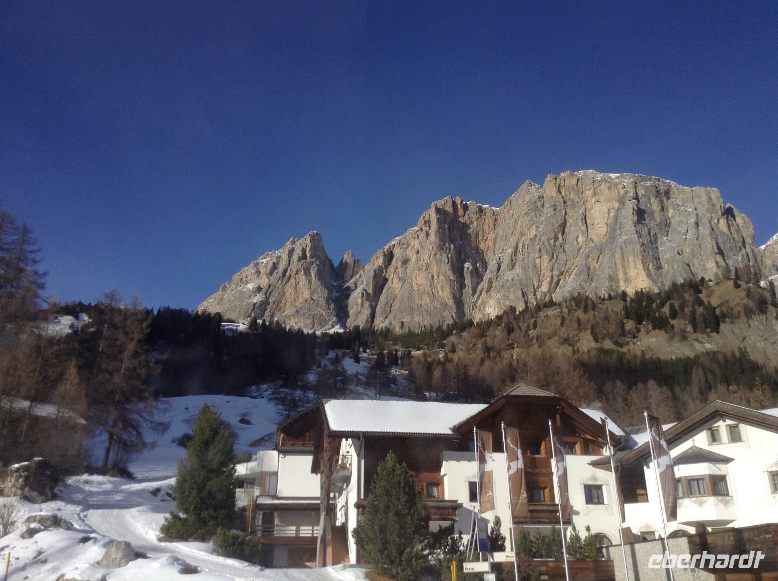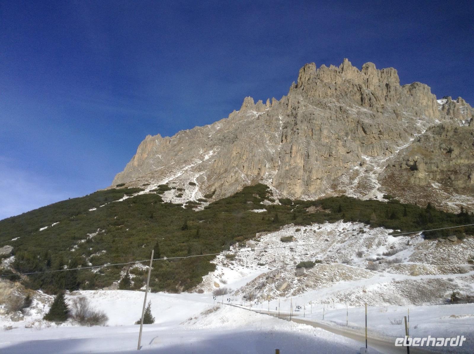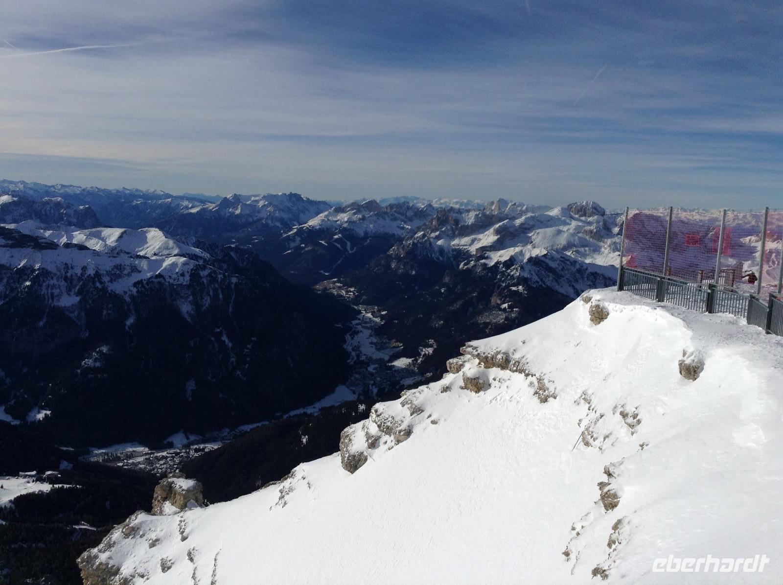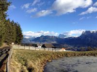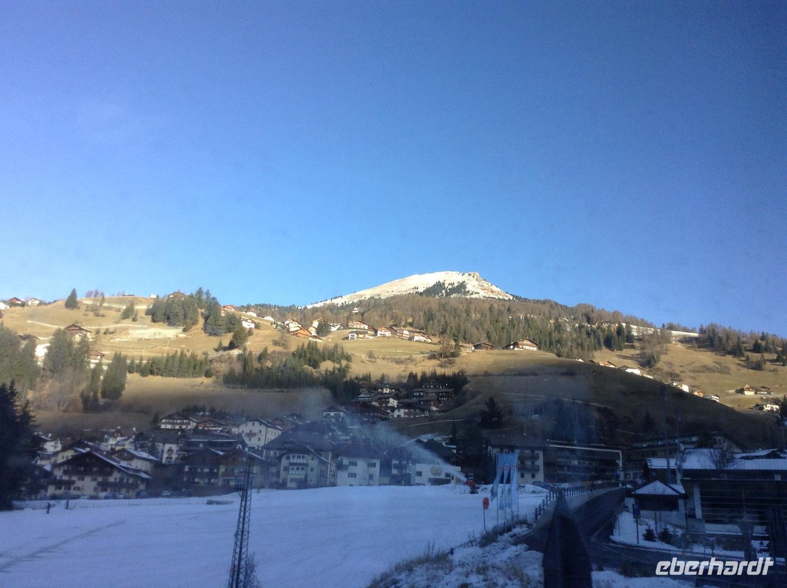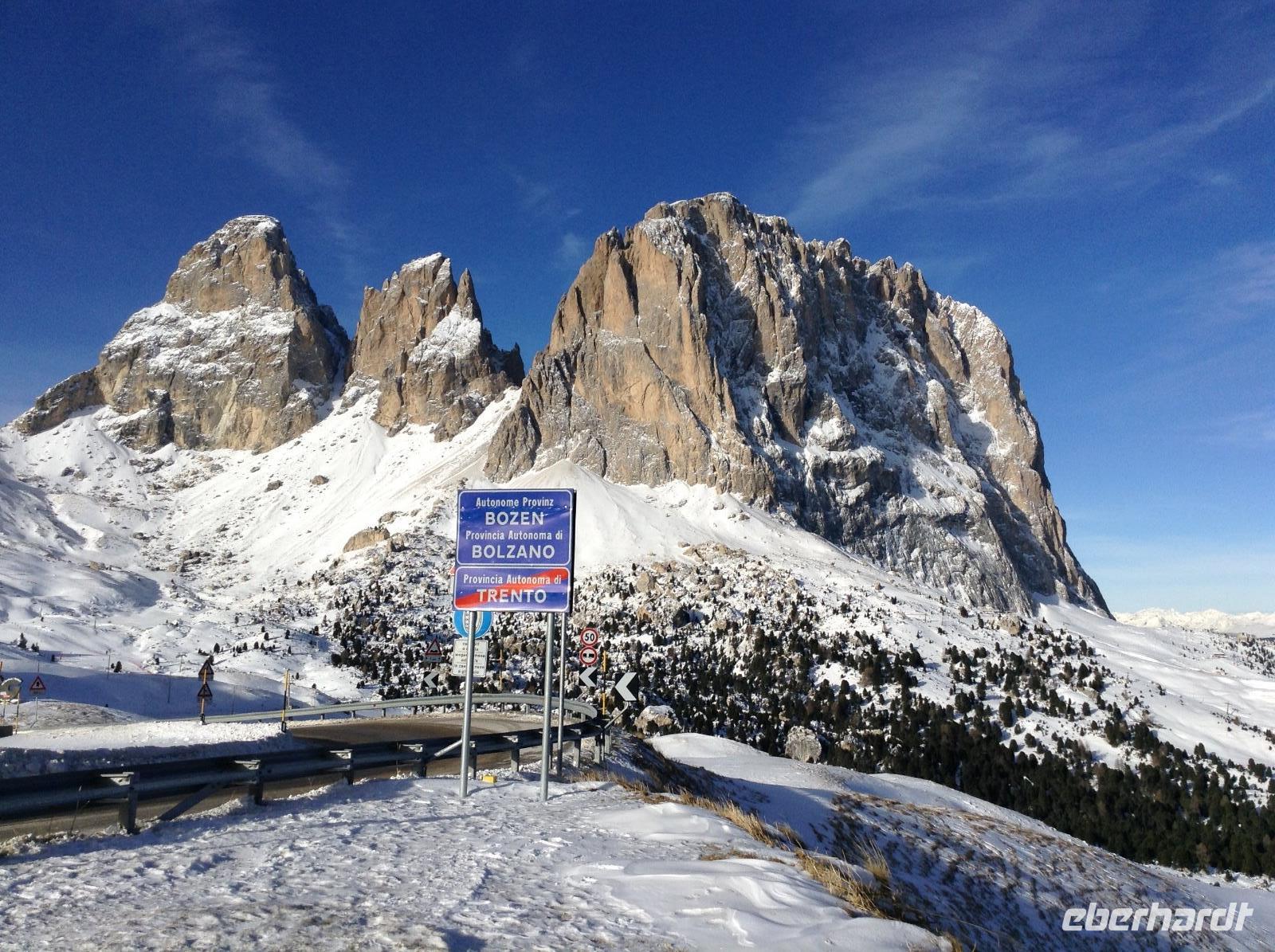 Wie sich das für den ersten Weihnachtsfeiertag gehört, hatten wir traumhaftes Wetter und eine herrliche Fernsicht an diesem Tag, also optimale Voraussetzungen für unsere Dolomitenrundfahrt. Unser Reiseleiter Sepp kam früh zum Hotel und wir starteten. Zuerst ging es ins Grödnertal und damit Mitten in die Wunderwelt der Berge hinein. Schlern, Rosengarten, Langkofel, Sella, Marmolada, Geißlerspitzen, es war fantastisch. Am Pass Pordoj wagten wir dann die Auffahrt mit der Seilbahn zum Pordojjoch auf 2930 m. Wir wurden mit einer grandiosen Rundumsicht belohnt. Durch die herrliche Fernsicht von bis zu 80 km konnten wir gut bis zu den Gipfeln des Alpenhauptkammes sehen, ein unvergessliches Erlebnis.