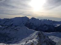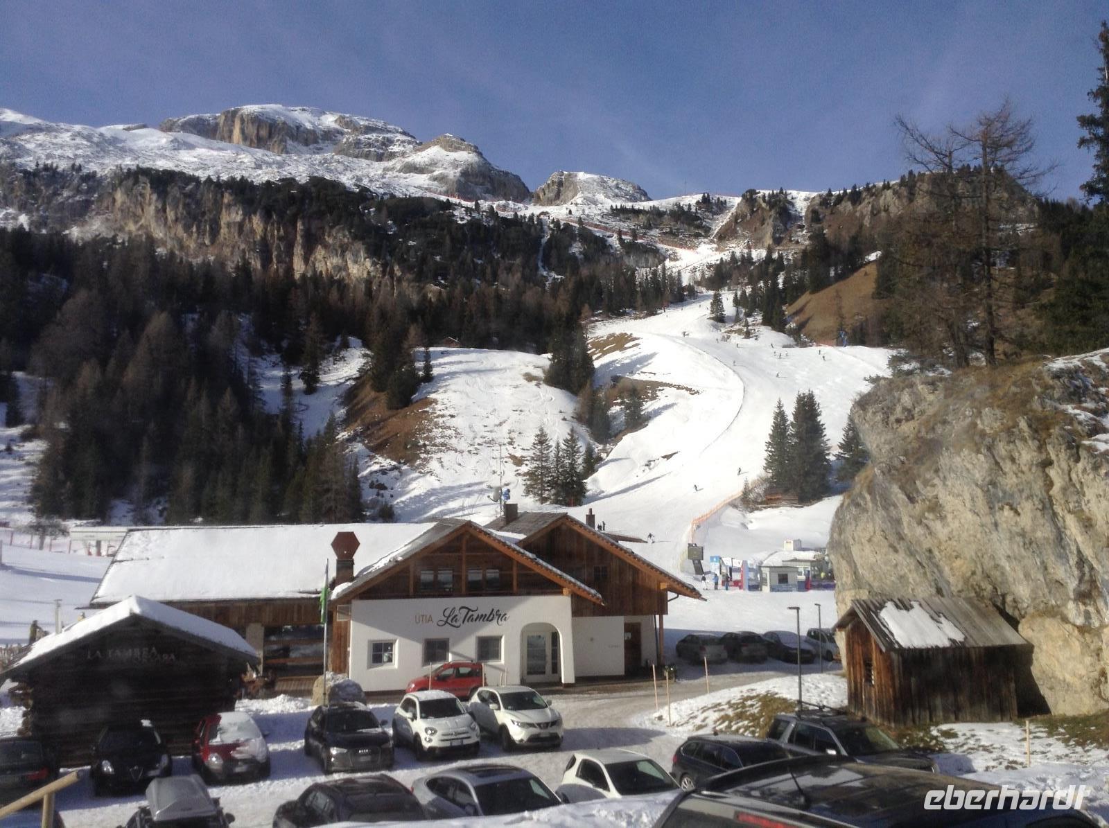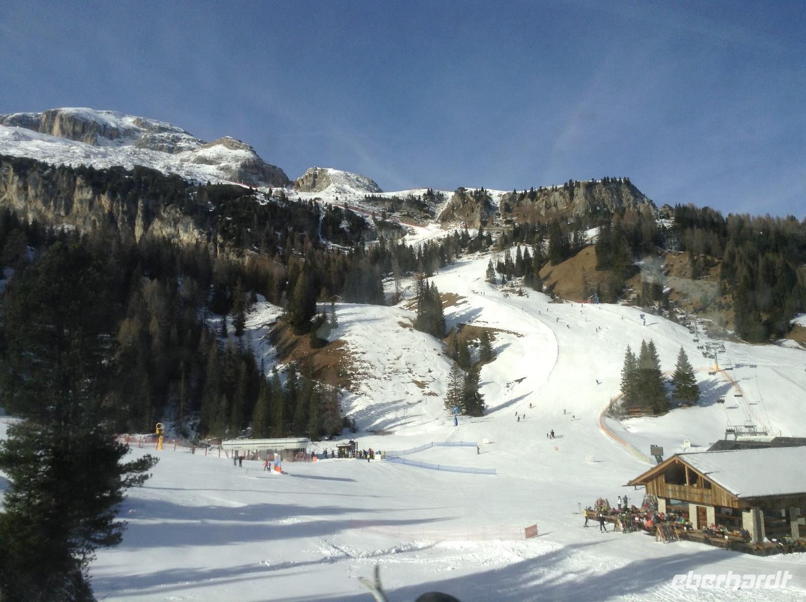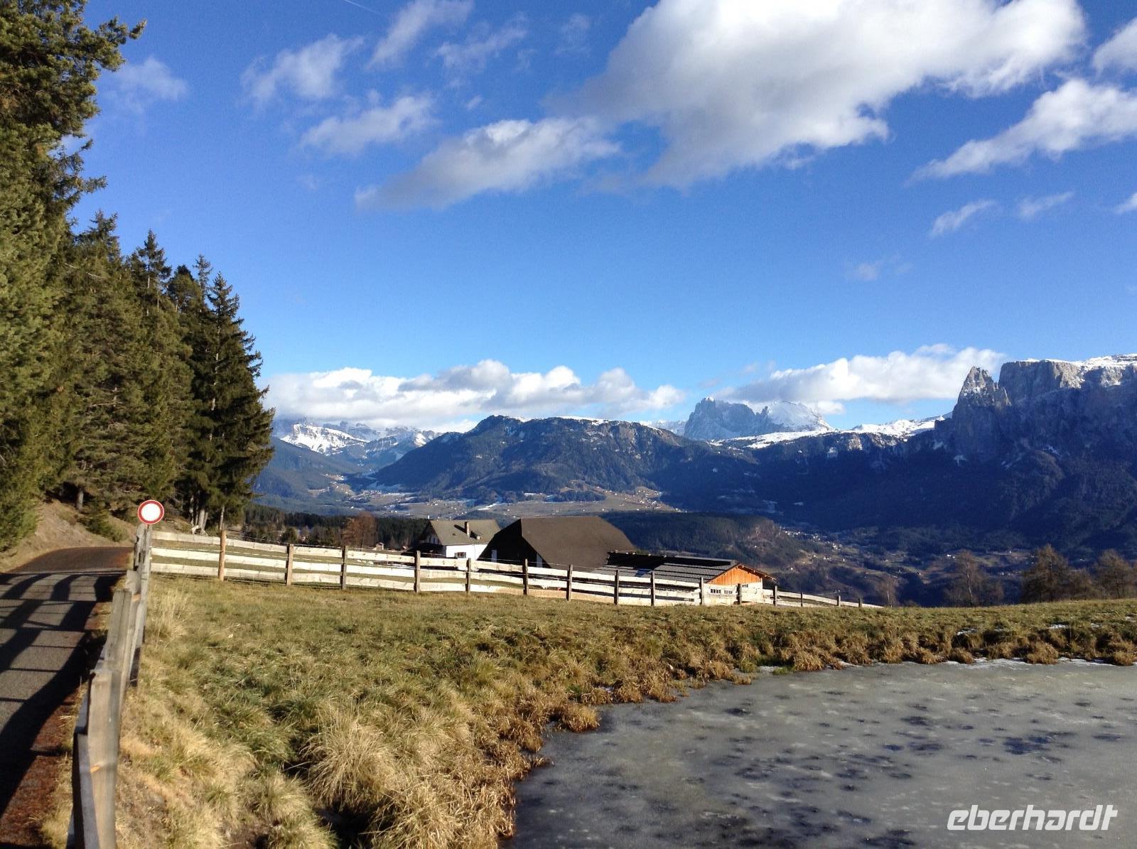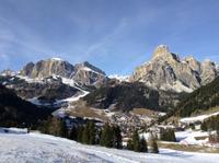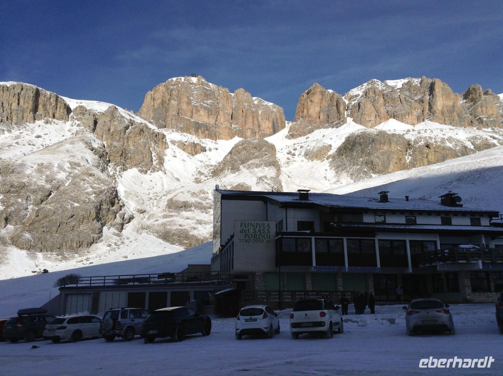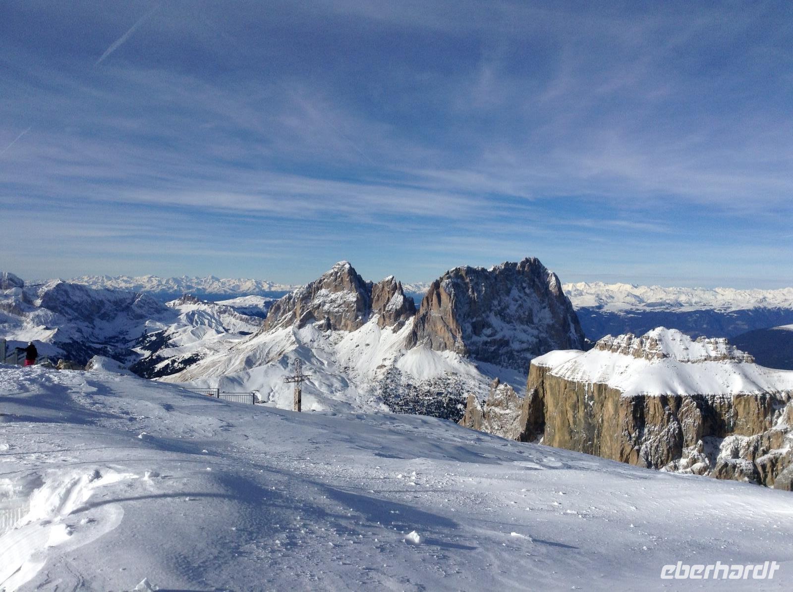 Wie sich das für den ersten Weihnachtsfeiertag gehört, hatten wir traumhaftes Wetter und eine herrliche Fernsicht an diesem Tag, also optimale Voraussetzungen für unsere Dolomitenrundfahrt. Unser Reiseleiter Sepp kam früh zum Hotel und wir starteten. Zuerst ging es ins Grödnertal und damit Mitten in die Wunderwelt der Berge hinein. Schlern, Rosengarten, Langkofel, Sella, Marmolada, Geißlerspitzen, es war fantastisch. Am Pass Pordoj wagten wir dann die Auffahrt mit der Seilbahn zum Pordojjoch auf 2930 m. Wir wurden mit einer grandiosen Rundumsicht belohnt. Durch die herrliche Fernsicht von bis zu 80 km konnten wir gut bis zu den Gipfeln des Alpenhauptkammes sehen, ein unvergessliches Erlebnis.
