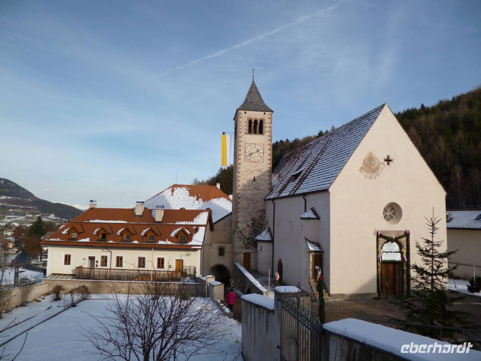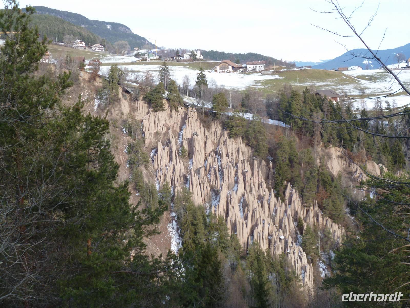 Bei herrlichem Wetter ging die Fahrt nach Bozen zur Seilbahn auf den Ritten. In Oberbozen hatten wir eine gute halbe Stunde Zeit bis zur Abfahrt des Zuges Klobenstein. Ein kleiner Weihnachtsmarkt an der Bergstation verkürzte das Warten. Die eingesetzte historische Bahn gefiel den Gästen ausnehmend. Der Bus wartete mittlerweile in Klobenstein mit Bordverpflegung, die gut auf dem geräumigen Parkplatz eingenommen werden konnte. Weiter ging es durch enge Straßen nach Lengmoos. Nach einer Wanderung zu den dortigen Erdpyramiden erholten sich die Gäste bei Kaffee und Süßem im Hotel, einige schlenderten noch zur nahe gelegenen Deutschordenskommende, deren reich ausgestattete Kirche allen offen stand. Bei einbrechendem Abendlicht fuhren wir die halsbrecherischen Serpentinen hinunter nach Bozen und weiter nach Goldrain.