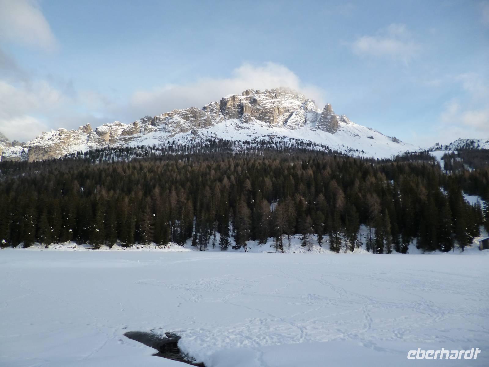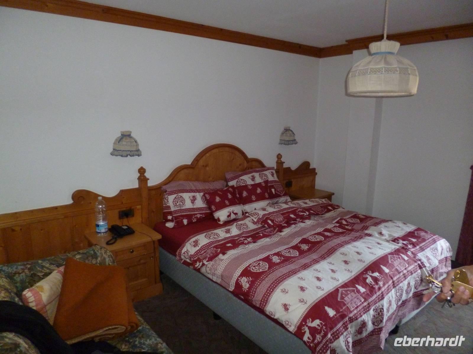 Am ersten Weihnachtsfeiertag starteten wir um neun Uhr zur großen Dolomitenrundfahrt, zunächst per Schnellstraße nach Bozen, dann auf der Autobahn bis Abfahrt Auer und von dort ging es nach Osten in die Berge, zunächst nach Cavalese, Pradazzo, Moena und dann im Fassatal entlang über Canazoi hinauf zum Pordoijoch (2239 Meter). Abfahrt bei Nebel, der sich immer mehr auflöste und grandiose Sicht freigab. Auf dem Pordoijoch zünftige Busverpflegung, dann weiter über den Falzaregopass (2105 Meter) Richtung Cortina d´Ampezzo. Vor dem Falzaregopass ist ein höhlenartiger Tunnel, der in sich als Kurve verläuft. Nur durch totales Zirkeln mit Millimeterdifferenzen war ein Durchkommen möglich. Nach der Ortsdurchfahrt in Cortina dann der letzte Pass „Drei Kreuze" (1809 Meter), ab hier bergab zum bereits zugefrorenen Misurinasee, wo es für alle einen leckeren Glühwein gab. Mit herrlichen Blicken auf die drei Zinnen ging die Tour an Toblach vorbei nach Bruneck, wo wir die letzte Pause einlegten. Um 19.30 Uhr waren wir zurück am Hotel. Der Tag war für viele zwar anstrengend, aber auch reich an grandiosen Eindrücken.
