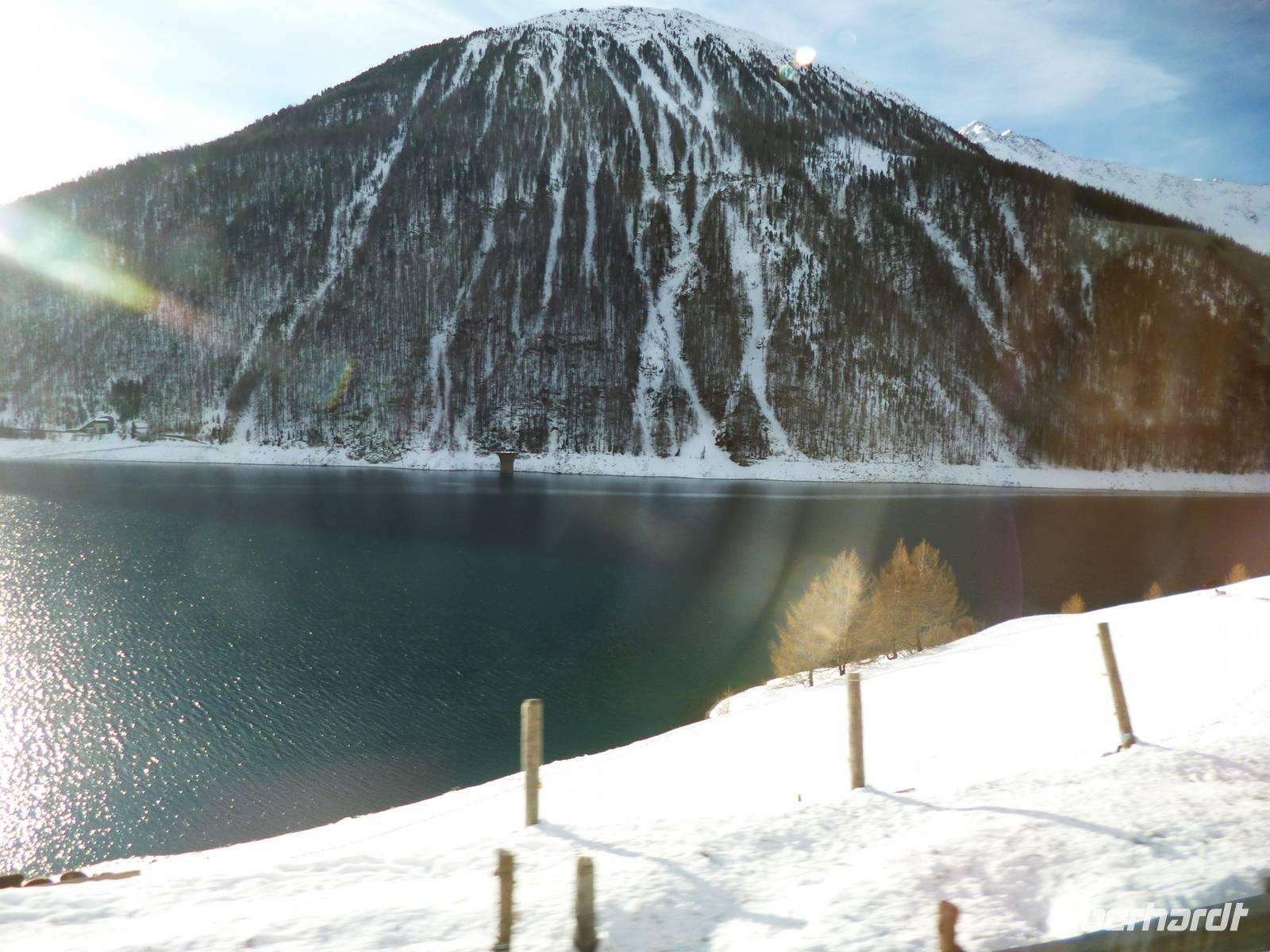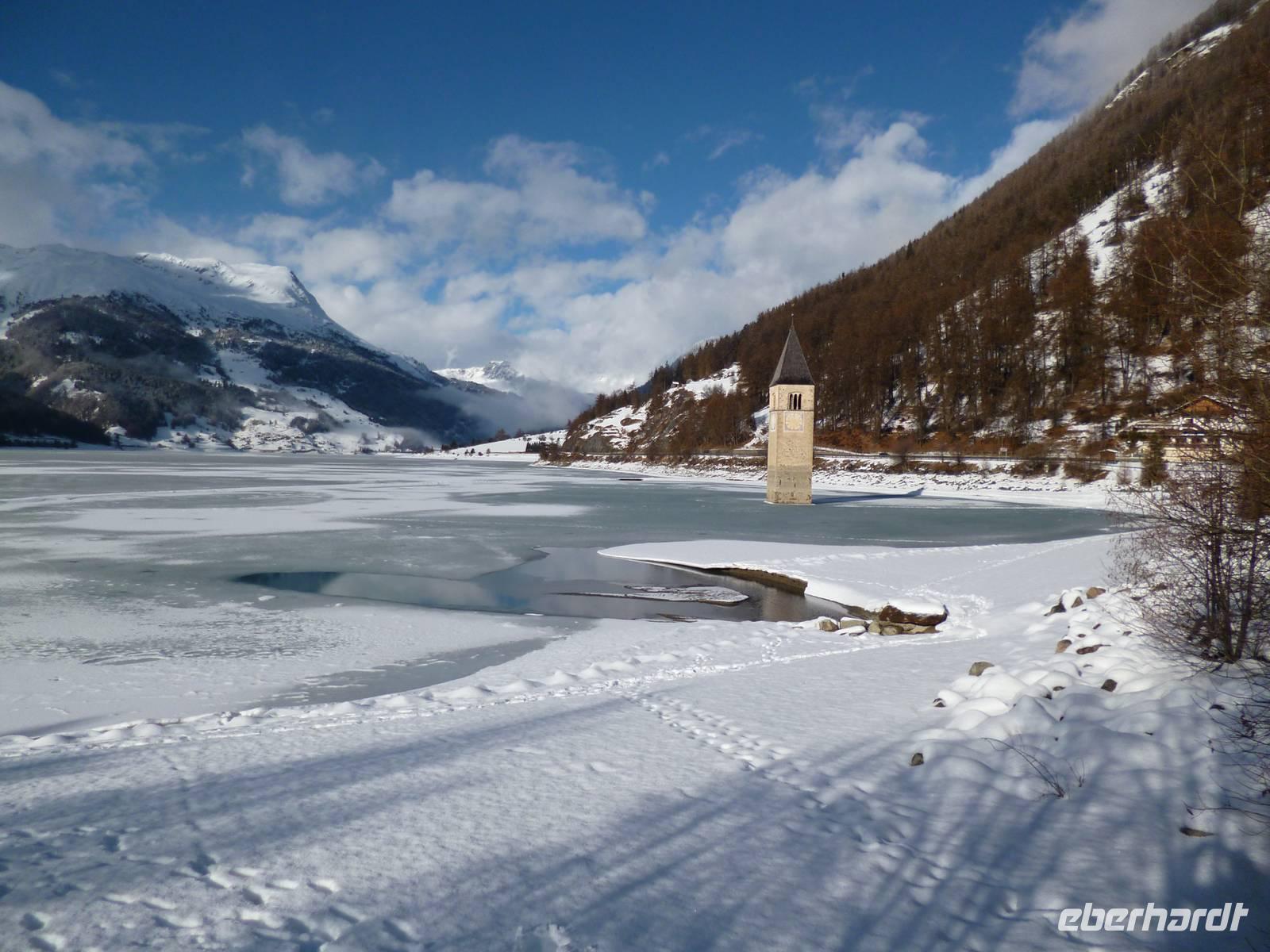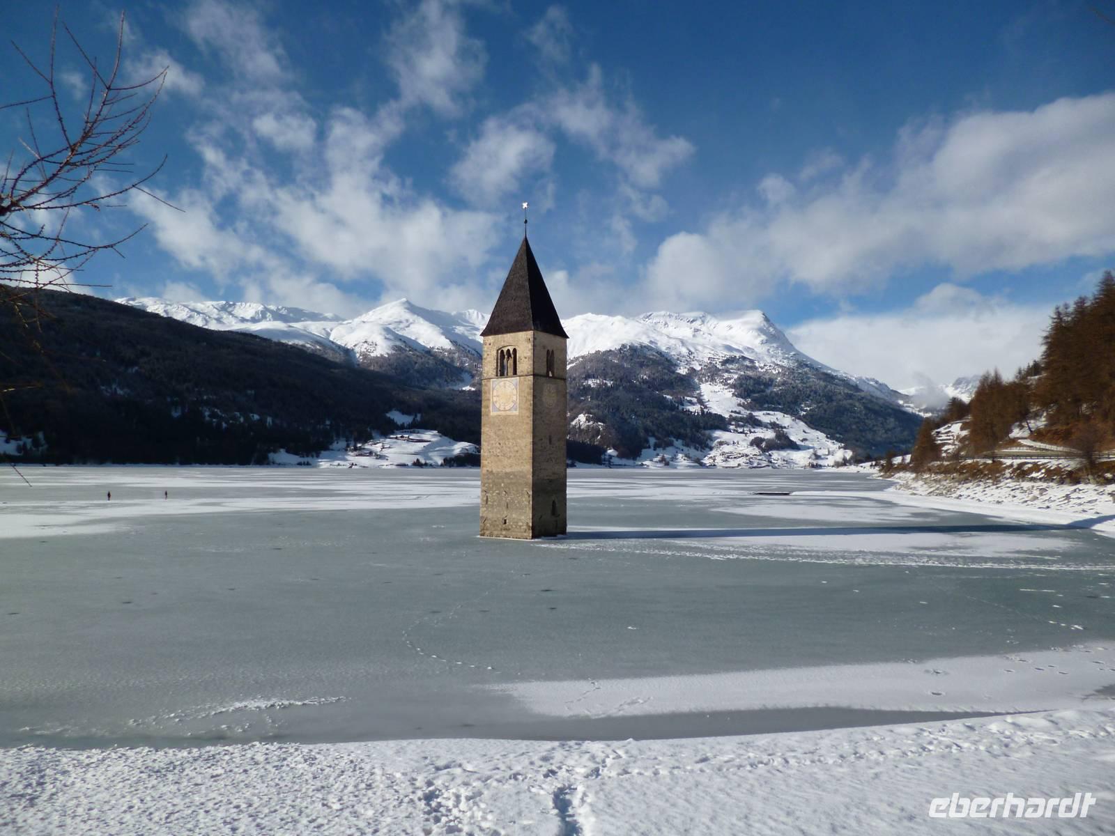 Bei nebligem Regenwetter starteten wir optimistisch gestimmt zum Reschenpass. In Nauders auf der österreichischen Seite war aus dem Regen Schnee geworden, so dass man den Ort mit zwei Kirchen und mittelalterlichem Schloss gut erkunden konnte. Busverpflegung in Nauders, dann zurück zum Reschenstaussee, wo mittlerweile Neuschnee in der Sonne strahlte. Traumhafter Blick auf eine tolle Fotokulisse mit romanischem Kirchturm, der aus dem gefrorenen See ragt. Nach einer herrlichen Spazierpause mit Glühwein auf allgemeinen Wunsch Rückfahrt ins Hotel.