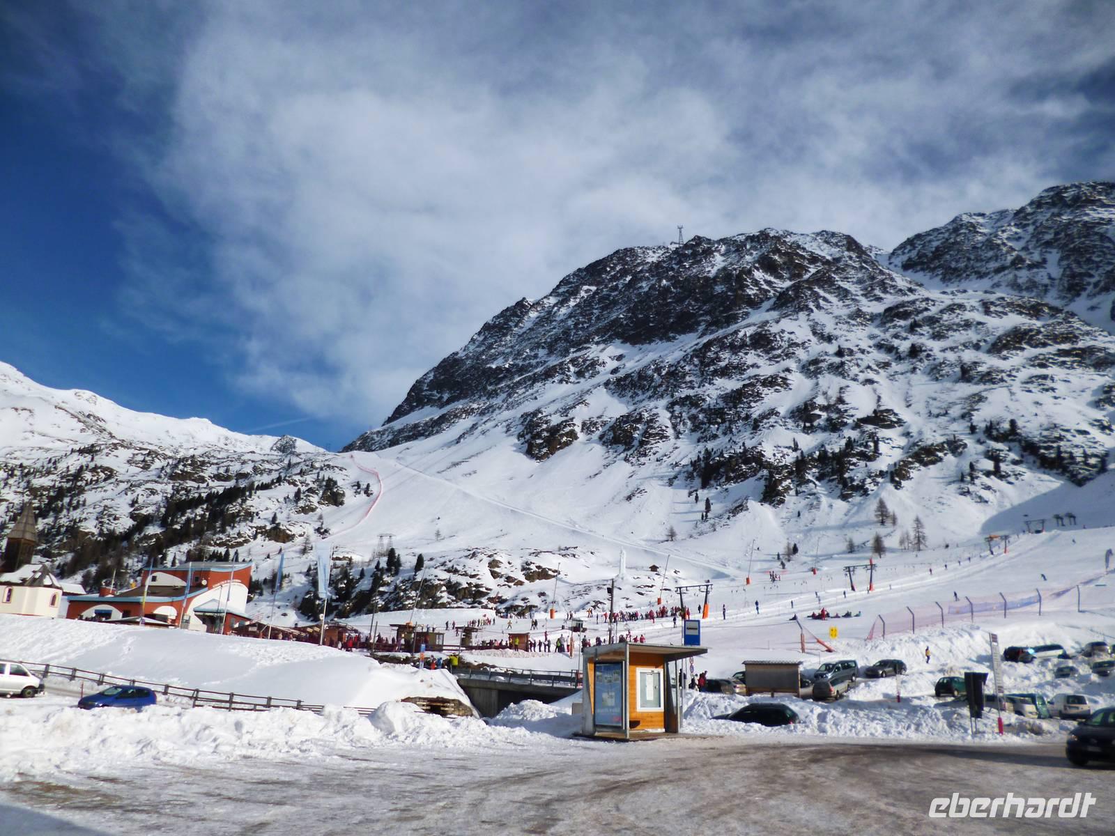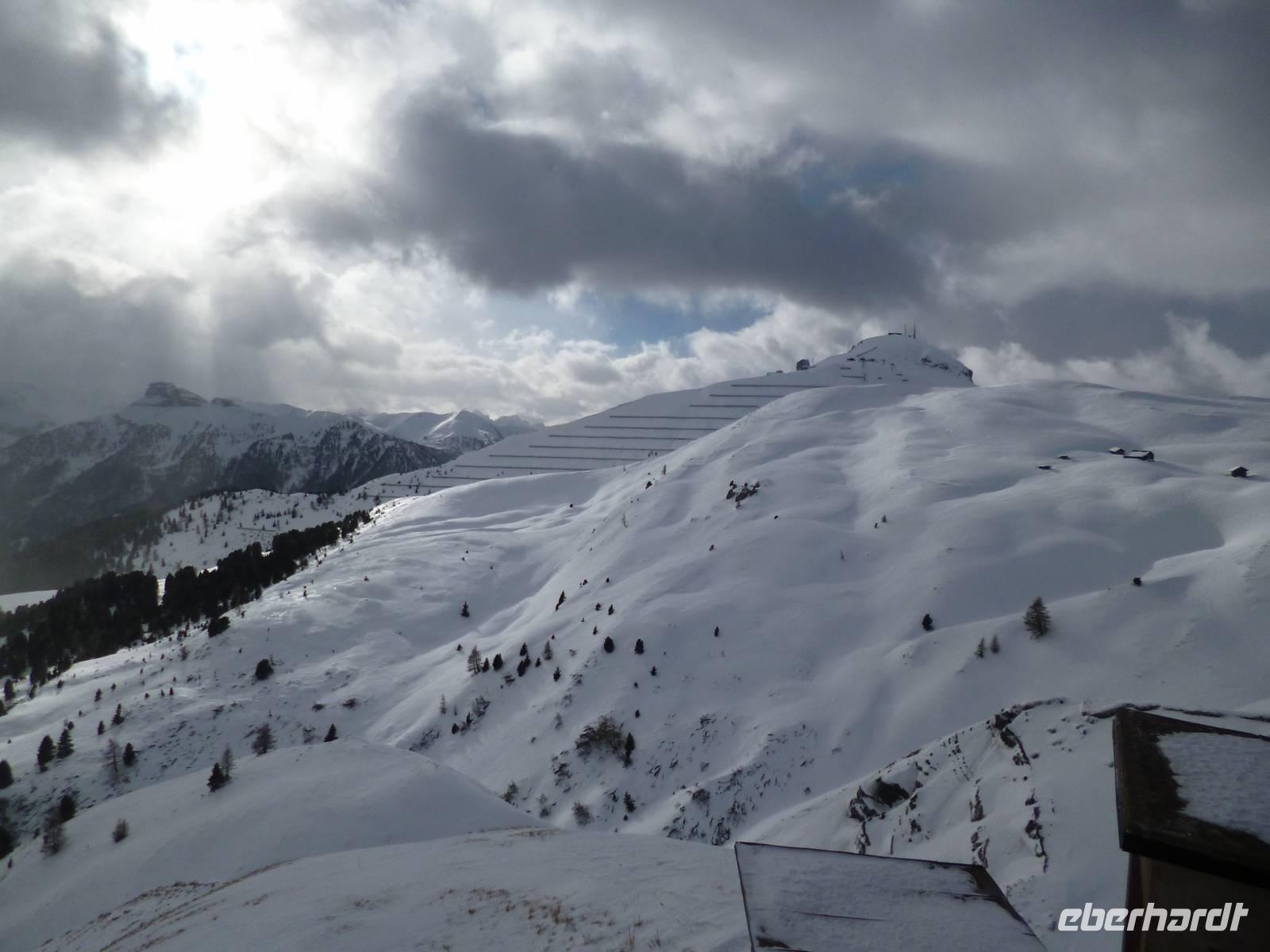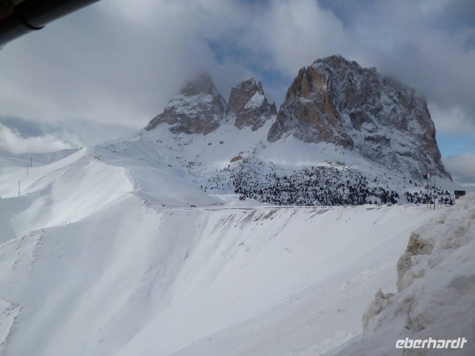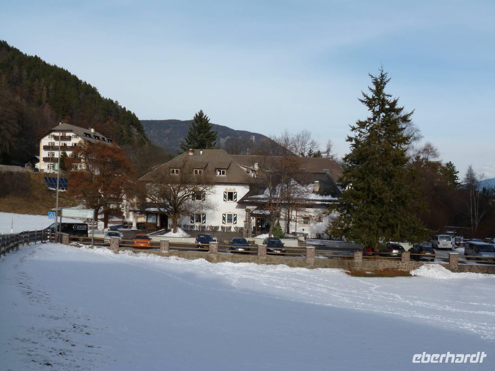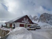 Um neun Uhr starteten wir zur kleinen Dolomitenrundfahrt nach Bozen und von dort ins schmale, felsengesäumte Eggental, dem ältesten, nach 1860 entstandene Stück der Dolomitenstraße. Am Karersee hinter dem Karerpass legten wir gegen 10.30 Uhr die erste Pause ein. Unter der Straße führt ein Treppentunnel zum See. Vorbei am Pordoipass erreichten wir gegen 12.30 Uhr den tief verschneiten Sellapass, wo bei der Mittagspause Busverpflegung gereicht wurde. Bergab durch viele Kehren fuhren wir dann ins Grödnertal nach St. Ulrich. Da von 12.30 bis 15 Uhr alle Geschäfte geschlossen waren, blieben nur die zahlreichen Konditoreien als Zeitvertreib oder eben pures Bummeln. Um 14.30 Uhr fuhren wir dann ins Dolfiland, wo ich uns angemeldet hatte. Ein Parkplatz war reserviert und wir wurden von einer Mitarbeiterin nett empfangen.
