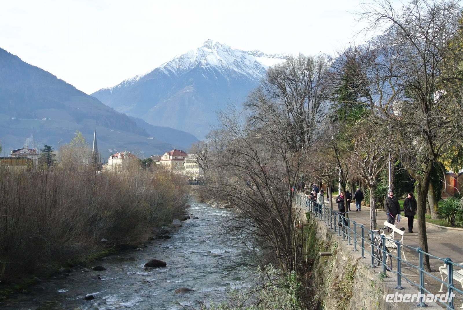 Von 11.15 bis 12:15 Uhr unternahm ich mit den Gästen einen Rundgang zu einigen den wichtigsten Sehenswürdigkeiten von Meran: an den Thermen vorbei über die Theaterbrücke zum Theaterplatz mit seinem Jugendstiltheater über den Kronplatz zum Vinschgauer Tor mit Resten der Stadtmauer und weiter zu den Resten eines alten Klosters am Kronplatz.