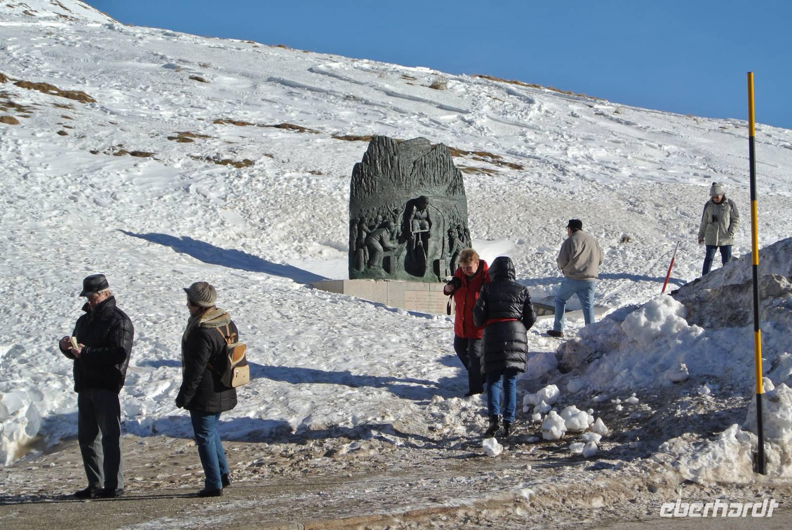 Anschließen fuhren wir durch das Fassatal zum Pordoijoch Unterwegs machten wir um 10:35 Uhr einen Fotostopp an einer großen Eisskulptur mit Krippe am Ende des Ferienortes Canazei