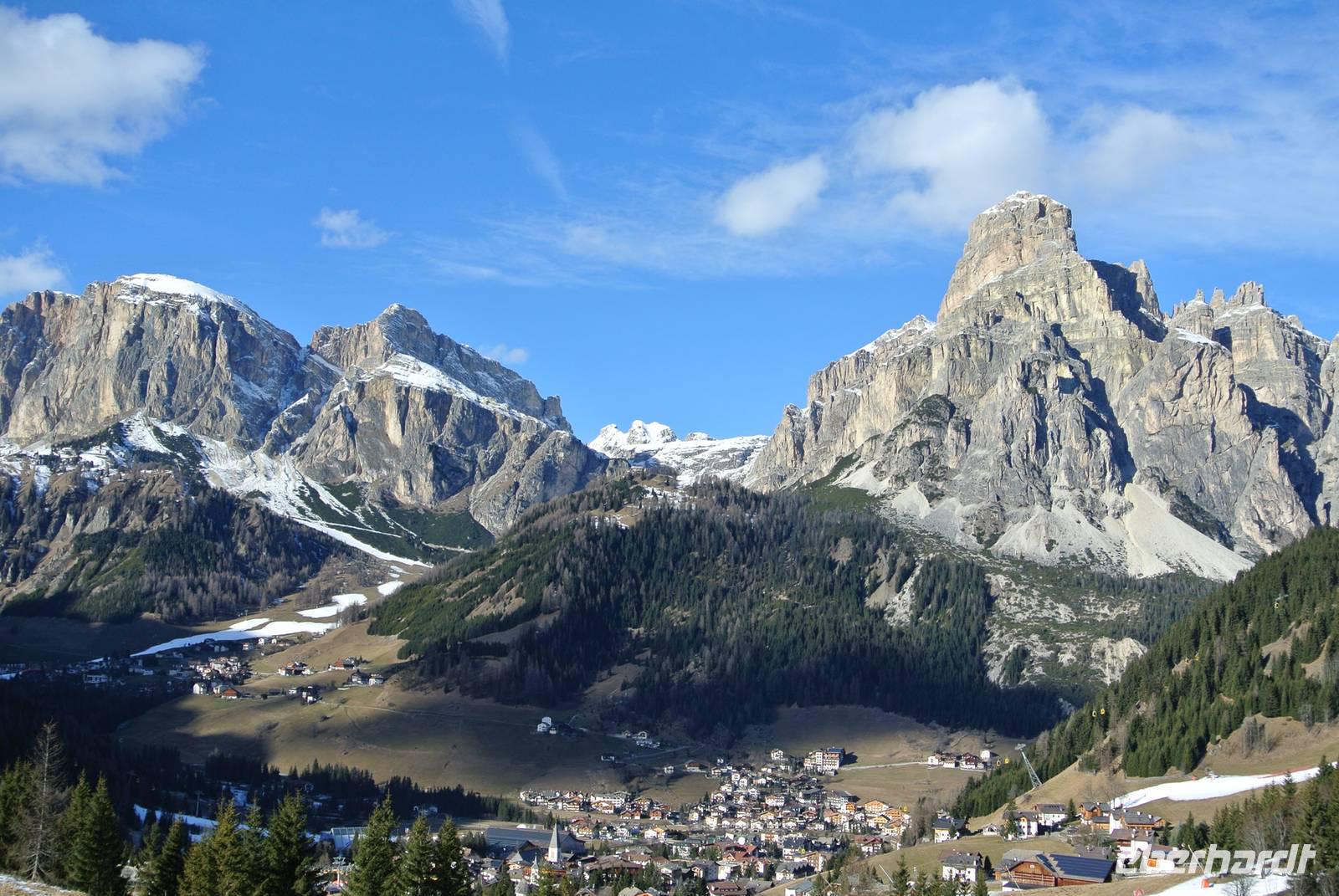 Um 12:35 machten wir unterwegs einen Fotostopp vor zwei beindruckenden Bergen mit bestem Fotolicht auf die Bergkulisse. Gegen 12:15 fuhren wir durch die Urlaubsort Araba weiter zum Campolongopass, wo wir um ca. 12:45 Uhr einen weiteren Fotostopp auf der Bergstation einlegten.