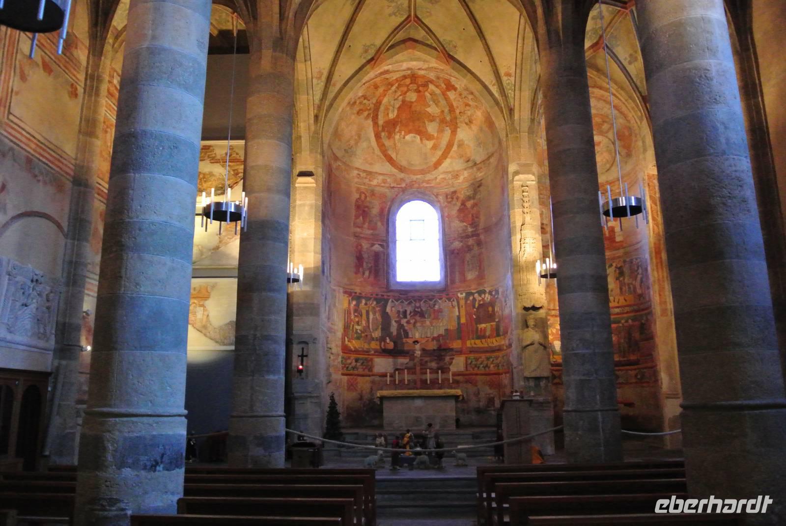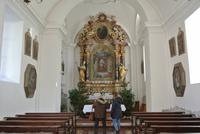 Nach dem Aufenthalt am Aussichtspunkt haben wir eine kleine Wanderung entlang der Weinberge, Apfelplantagen und bei strahlenden Sonnenschein bis zur Pfarrkirche unternommen. Nachdem wir die eindrucksvolle Kirche besichtigt hatten, nahmen wir in den Bänken Platz.