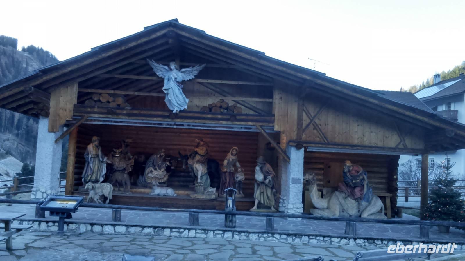 Vor dem Ferienort Canazei machten wir um 10:50 Uhr einen 5- minütigen Fotostopp an einer großen Eisskulptur mit Krippe.